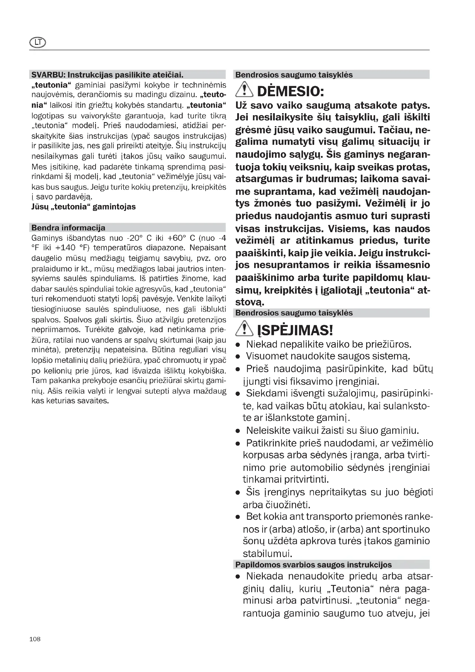 Už savo vaiko sauguma atsakote patys. Jei nesilaikysite šiu taisykliu, gali iskilti grèsme jusu vaiko saugumui. Táčiau, negalima numatyti visu galimu situaciju ir naudojimo salygu. Šis gaminys negarantojuota tokiu veiksniu, kaip smeikas protas, atsargumas ir budrumas; laikoma savaime suprantama, kad vežimeli naudojantysŽmonés tuo pasizymi. Vežimeli ir jo priedus naudojantis asmu turi suprasti visas instrukcjjas. Visiems, kas naudos vežimeli ar atitinkamus priedus, turite paaiskinti, kaip jie veikia. Jeigu instrukcijos nasuprantamos ir reikia issamesnio paaiskinimo arba turite papildomu klausimu, kreipkitës i igaliotaji „teutonia“ atstova.