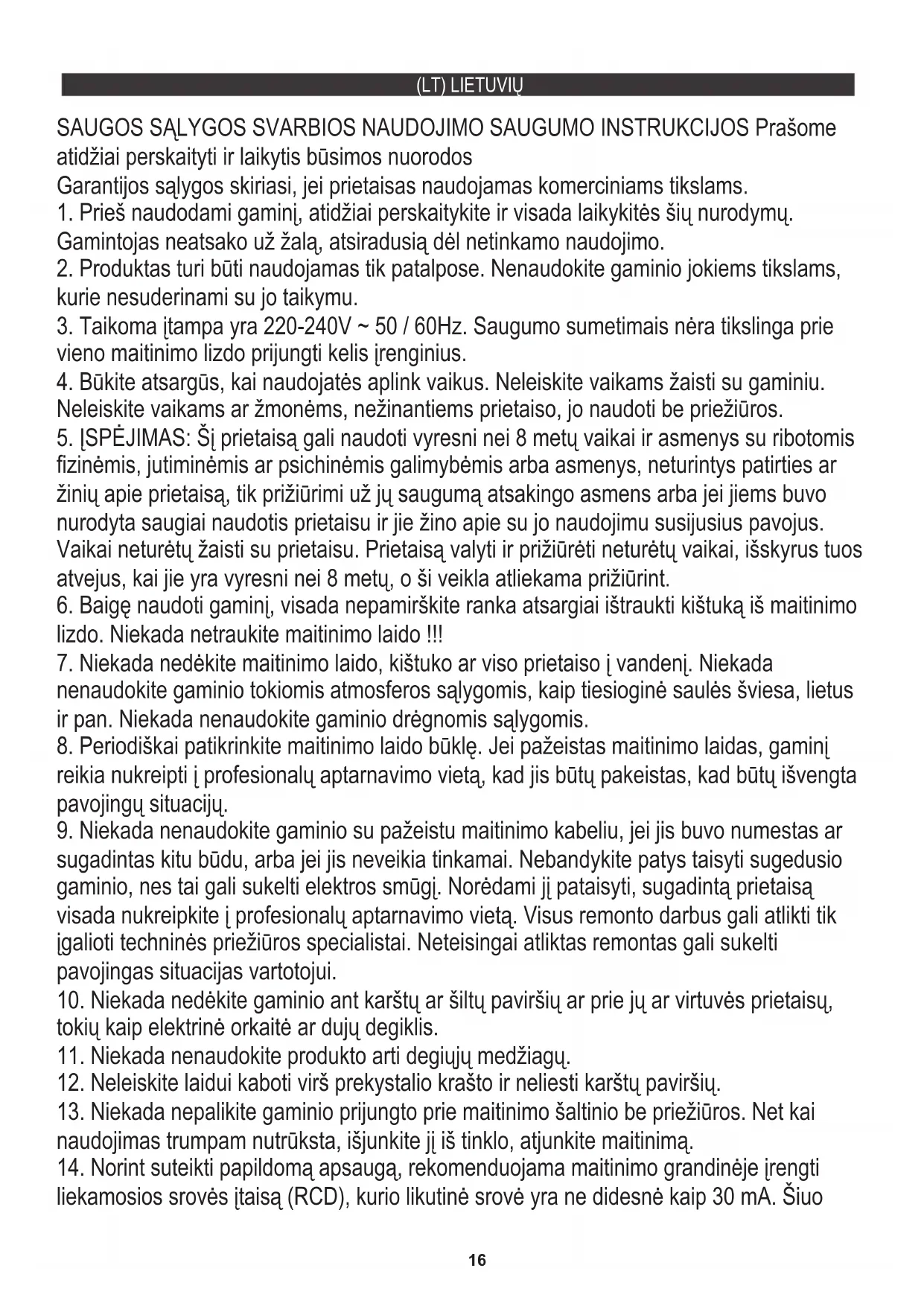 sugadintas kitu būdu, arba jei jis neveikia tinkamai. Nebandykite patys taisyti sugedusio gaminio, nes tai gali sukelti elektros smūgį. Norėdami jį pataisyti, sugadintą prietaisą visada nukreipkite į profesionalų aptarnavimo vietą. Visus remonto darbus gali atlikti tik įgalioti techninės priežiūros specialistai. Neteisingai atliktas remontas gali sukelti pavojingas situacijas vartotojui.