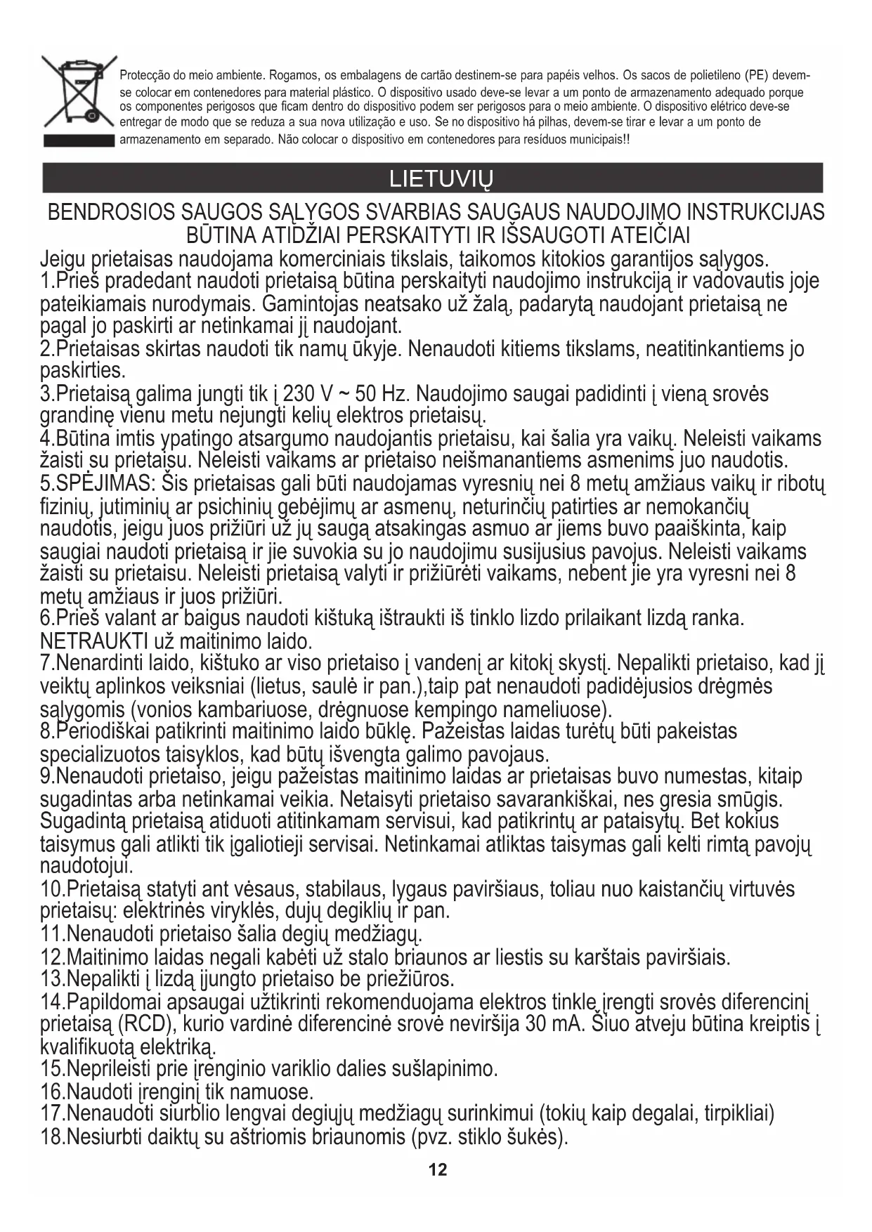 Preste atenção ao comprimento do cabo de alimentação ao mover o aspirador. Um movimento brusco de aspirador com o fio esticado pode provocar a sua deterioração. Dispositivo fabricado com classe de isolamento II e não precisa de ligação à terra. Dispositivo está conforme com os requisitos das diretivas: Dispositivo elétrico de baixa voltagem (LVD) Compatibilidade eletromagnética (EMC) Produto com símbolo CE na placa de características12 LIETUVIŲ BENDROSIOS SAUGOS SĄLYGOS SVARBIAS SAUGAUS NAUDOJIMO INSTRUKCIJAS BŪTINA ATIDŽIAI PERSKAITYTI IR IŠSAUGOTI ATEIČIAI Jeigu prietaisas naudojama komerciniais tikslais, taikomos kitokios garantijos sąlygos. 1.Prieš pradedant naudoti prietaisą būtina perskaityti naudojimo instrukciją ir vadovautis joje pateikiamais nurodymais. Gamintojas neatsako už žalą, padarytą naudojant prietaisą ne pagal jo paskirti ar netinkamai jį naudojant. 2.Prietaisas skirtas naudoti tik namų ūkyje. Nenaudoti kitiems tikslams, neatitinkantiems jo paskirties. 3.Prietaisą galima jungti tik į 230 V ~ 50 Hz. Naudojimo saugai padidinti į vieną srovės grandinę vienu metu nejungti kelių elektros prietaisų. 4.Būtina imtis ypatingo atsargumo naudojantis prietaisu, kai šalia yra vaikų. Neleisti vaikams žaisti su prietaisu. Neleisti vaikams ar prietaiso neišmanantiems asmenims juo naudotis. 5.SPĖJIMAS: Šis prietaisas gali būti naudojamas vyresnių nei 8 metų amžiaus vaikų ir ribotų fizinių, jutiminių ar psichinių gebėjimų ar asmenų, neturinčių patirties ar nemokančių naudotis, jeigu juos prižiūri už jų saugą atsakingas asmuo ar jiems buvo paaiškinta, kaip saugiai naudoti prietaisą ir jie suvokia su jo naudojimu susijusius pavojus. Neleisti vaikams žaisti su prietaisu. Neleisti prietaisą valyti ir prižiūrėti vaikams, nebent jie yra vyresni nei 8 metų amžiaus ir juos prižiūri. 6.Prieš valant ar baigus naudoti kištuką ištraukti iš tinklo lizdo prilaikant lizdą ranka. NETRAUKTI už maitinimo laido. 7.Nenardinti laido, kištuko ar viso prietaiso į vandenį ar kitokį skystį. Nepalikti prietaiso, kad jį veiktų aplinkos veiksniai (lietus, saulė ir pan.),taip pat nenaudoti padidėjusios drėgmės sąlygomis (vonios kambariuose, drėgnuose kempingo nameliuose). 8.Periodiškai patikrinti maitinimo laido būklę. Pažeistas laidas turėtų būti pakeistas specializuotos taisyklos, kad būtų išvengta galimo pavojaus. 9.Nenaudoti prietaiso, jeigu pažeistas maitinimo laidas ar prietaisas buvo numestas, kitaip sugadintas arba netinkamai veikia. Netaisyti prietaiso savarankiškai, nes gresia smūgis. Sugadintą prietaisą atiduoti atitinkamam servisui, kad patikrintų ar pataisytų. Bet kokius taisymus gali atlikti tik įgaliotieji servisai. Netinkamai atliktas taisymas gali kelti rimtą pavojų naudotojui. 10.Prietaisą statyti ant vėsaus, stabilaus, lygaus paviršiaus, toliau nuo kaistančių virtuvės prietaisų: elektrinės viryklės, dujų degiklių ir pan. 11.Nenaudoti prietaiso šalia degių medžiagų. 12.Maitinimo laidas negali kabėti už stalo briaunos ar liestis su karštais paviršiais. 13.Nepalikti į lizdą įjungto prietaiso be priežiūros. 14.Papildomai apsaugai užtikrinti rekomenduojama elektros tinkle įrengti srovės diferencinį prietaisą (RCD), kurio vardinė diferencinė srovė neviršija 30 mA. Šiuo atveju būtina kreiptis į kvalifikuotą elektriką. 15.Neprileisti prie įrenginio variklio dalies sušlapinimo. 16.Naudoti įrenginį tik namuose. 17.Nenaudoti siurblio lengvai degiųjų medžiagų surinkimui (tokių kaip degalai, tirpikliai) 18.Nesiurbti daiktų su aštriomis briaunomis (pvz. stiklo šukės). Protecção do meio ambiente. Rogamos, os embalagens de cartão destinem-se para papéis velhos. Os sacos de polietileno (PE) devem- se colocar em contenedores para material plástico. O dispositivo usado deve-se levar a um ponto de armazenamento adequado porque os componentes perigosos que ficam dentro do dispositivo podem ser perigosos para o meio ambiente. O dispositivo elétrico deve-se entregar de modo que se reduza a sua nova utilização e uso. Se no dispositivo há pilhas, devem-se tirar e levar a um ponto de armazenamento em separado. Não colocar o dispositivo em contenedores para resíduos municipais!!LIETUVIŲ 19.Nekreipti siurblio į žmones arba gyvūnus. 20.Siurblį naudoti tik ant sausų paviršių. 21.Negalima užkimšti jokių vėdinimo angų. 22.Nejungti siurblio be uždėto filtro. 23.Netraukti už vamzdžio. 24.Būkite atsargūs, kad maitinimo laidas nebūtų įkirptas ar neužstrigtų. Atkreipkite dėmesį į maitinimo kabelio ilgį, kai keisite siurblio vietą. Staigus siurblio traukimas, esant įtemptam kabeliui gali privesti prie jo pažeidimo.