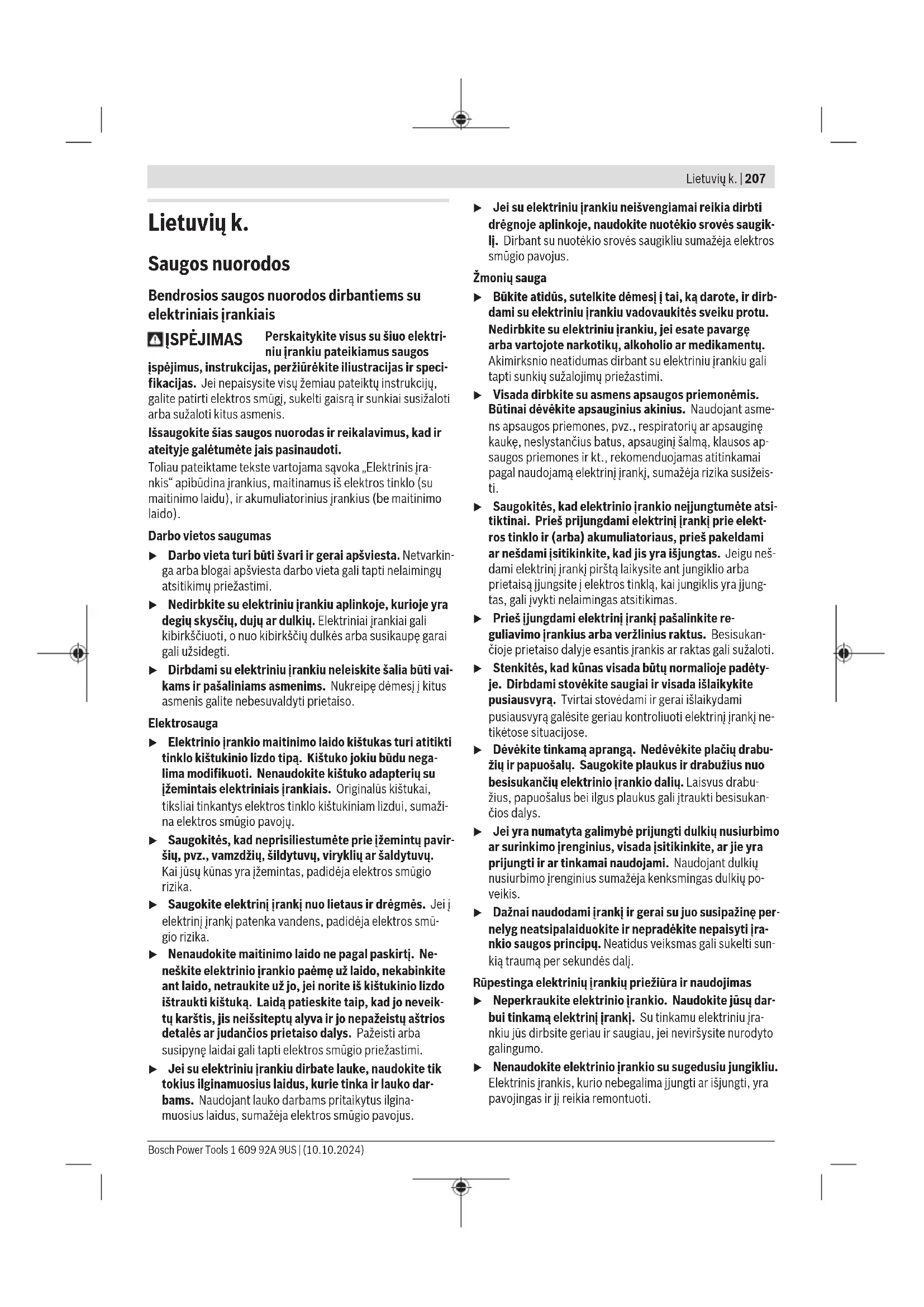 < 2,5 1,5 < 2,5 1,5 Šioje instrukcijoje pateiktas vibracijos lygis ir triukšmo emisi- ja buvo išmatuoti pagal standartizuotą matavimo metodą, ir juos galima naudoti elektriniams įrankiams palyginti. Jie taip pat skirti vibracijos ir triukšmo emisijai iš anksto įvertinti. Nurodytas vibracijos lygis ir triukšmo emisijos vertė atspindi pagrindinius elektrinio įrankio naudojimo atvejus. Tačiau jei- gu elektrinis įrankis naudojamas kitokiai paskirčiai, su kito- kiais darbo įrankiais arba jeigu jis nepakankamai techniškai prižiūrimas, vibracijos lygis ir triukšmo emisijos vertė gali ki- sti. Tokiu atveju vibracijos ir triukšmo emisija per visą darbo laikotarpį gali žymiai padidėti. Norint tiksliai įvertinti vibracijos ir triukšmo emisiją per tam tikrą darbo laiką, reikia atsižvelgti ir į laiką, per kurį elektrinis įrankis buvo išjungtas arba, nors ir veikė, bet nebuvo naudo- jamas. Tai įvertinus, vibracijos ir triukšmo emisija per visą darbo laiką žymiai sumažės. 1 609 92A 9US | (10.10.2024) Bosch Power ToolsLietuvių k. | 211 Dirbančiajam nuo vibracijos poveikio apsaugoti paskirkite papildomas apsaugos priemones, pvz.: elektrinių ir darbo įrankių techninę priežiūrą, rankų šildymą, darbo eigos orga- nizavimą. Akumuliatorius Bosch akumuliatorinius elektrinius įrankius parduoda ir be akumuliatoriaus. Ar į jūsų elektrinio įrankio tiekiamą komp- lektą įeina akumuliatorius, galite pažiūrėti ant pakuotės. Akumuliatoriaus įkrovimas u Naudokite tik techninių duomenų skyriuje nurodytus kroviklius. Tik šie krovikliai yra priderinti prie Jūsų elekt- riniame prietaise naudojamo ličio jonų akumuliatoriaus. Nuoroda: laikantis tarptautinių transportavimo teisės aktų, ličio jonų akumuliatoriai tiekiami dalinai įkrauti. Kad akumu- liatorius veiktų visa galia, prieš pirmąjį naudojimą akumulia- torių visiškai įkraukite. Akumuliatoriaus įdėjimas Įkrautą akumuliatorių stumkite į akumuliatoriaus laikiklį, kol pajusite, kad užsifiksavo. Akumuliatoriaus išėmimas Norėdami išimti akumuliatorių, paspauskite atblokavimo kla- višus ir išimkite akumuliatorių. Traukdami nenaudokite jė- gos. Akumuliatoriaus įkrovos būklės indikatorius Akumuliatoriaus įkrovos indikatorius, kai yra pusiau pa- spaustas įjungimo-išjungimo jungiklis, kelioms sekundėms rodo akumuliatoriaus įkrovą. Šviesos diodas Talpa Šviečia nuolat 3× žali 60–100% Šviečia nuolat 2× žali 30–60% Šviečia nuolat 1× žalias 5–30% Mirksi 1× žalias 0–5% Su temperatūros pokyčiu susijusi apsauga nuo perkrovos Jei elektrinis įrankis naudojamas pagal paskirtį, jis nebus vei- kiamas perkrovos. Jei įrankis veikiamas perkrovos arba tem- peratūra yra už leistinos akumuliatoriaus temperatūros ribų, bus sumažinamas sūkių skaičius arba elektrinis įrankis išsi- jungs. Sumažėjus sūkių skaičiui, elektrinis įrankis didesniu sūkių skaičiumi pradės veikti tik tada, kai bus pasiekta lei- džiamoji akumuliatoriaus temperatūra. Elektriniam įrankiui išsijungus automatiškai, išjunkite jį jungikliu, palaukite, kol atvės akumuliatorius ir elektrinį įrankį vėl įjunkite. Nuorodos, kaip optimaliai elgtis su akumuliatoriumi Saugokite akumuliatorių nuo drėgmės ir vandens. Akumuliatorių sandėliuokite tik nuo −20°C iki 50°C tem- peratūroje. Pvz., nepalikite akumuliatoriaus vasarą automo- bilyje. Pastebimas įkrauto akumuliatoriaus veikimo laiko sutrumpė- jimas rodo, kad akumuliatorius susidėvėjo ir jį reikia pakeisti. Laikykitės pateiktų šalinimo nurodymų. Montavimas u Prieš pradėdami bet kokius elektrinio įrankio priežiū- ros darbus (pvz., techninės priežiūros, įrankio keitimo ir kt.), iš elektrinio įrankio išimkite akumuliatorių. Priešingu atveju, netyčia nuspaudus įjungimo-išjungimo jungiklį, iškyla sužalojimo pavojus. Įrankių keitimas Darbo įrankio įstatymas (žr.Apav.) Darbo įrankį iki atramos stumkite į įrankių įtvarą (1). Priedėlio montavimas (žr.Bpav.) Nuimkite darbo įrankį. Įstatykite priedėlį į įrankių įtvarą (1). Sukite fiksavimo žiedą(14), kol išgirsite, kad užsifiksavo. Darbo įrankio įdėjimas į priedėlį GFA 12-W (žr. A pav.) Darbo įrankį iki atramos stumkite į įrankių įtvarą (1). GFA12-E, GFA12-X (žr.Cpav.) Patraukite užraktinę movą atgal, stumkite darbo įrankį iki at- ramos į įrankio laikiklį(1) ir vėl atleiskite užraktinę movą, kad darbo įrankis užsifiksuotų. GFA12-B (žr.Dpav.) Atverkite gręžimo griebtuvo priedėlį(11) sukdami krypti- mi➊ tiek, kad būtų galima įstatyti darbo įrankį. Įstatykite darbo įrankį. Tvirtai užveržkite ranka gręžimo griebtuvo priedėlio(11) įvorę, sukdami kryptimi➋. Griebtuvas užrakinamas automa- tiškai. Norėdami užraktą atrakinti ir išimti darbo įrankį, sukite grę- žimo griebtuvo priedėlio įvorę sukimo kryptimi. Priedėlio sukimas GFA12-E, GFA12-W (žr.Epav.) Patraukite priedėlį pirmyn. Sukite priedėlį. Priedėlis 360° diapazone užsifiksuoja 16 padėčių. Parinkite darbui tinkamą padėtį. Priedėlį vėl atleiskite, kad jį užfiksuotumėte. Priedėlio nuėmimas (žr.Fpav.) Nuimkite darbo įrankį. Atblokuokite priedėlį sukdami kryptimi ir nutraukite jį nuo įrankių įtvaro (1). Priedėlių derinimas Kampinį suktuvo adapterį(13) galima derinti su bet kuriuo kitu priedėliu. Tuo tikslu kampinį suktuvo adapterį(13) įstatykite į įrankių įtvarą (1). Sukite fiksavimo žiedą(14), kol išgirsite, kad už- sifiksavo. Tada ant kampinio suktuvo adapterio(13) uždė- kite vieną iš adapterių. Bosch Power Tools 1 609 92A 9US | (10.10.2024)212 | Lietuvių k. Dulkių, pjuvenų ir drožlių nusiurbimas Medžiagų, kurių sudėtyje yra švino, kai kurių rūšių medienos, mineralų ir metalų dulkės gali būti kenksmingos sveikatai. Dirbančiajam arba netoli esantiems asmenims nuo sąlyčio su dulkėmis arba jų įkvėpus gali kilti alerginės reak