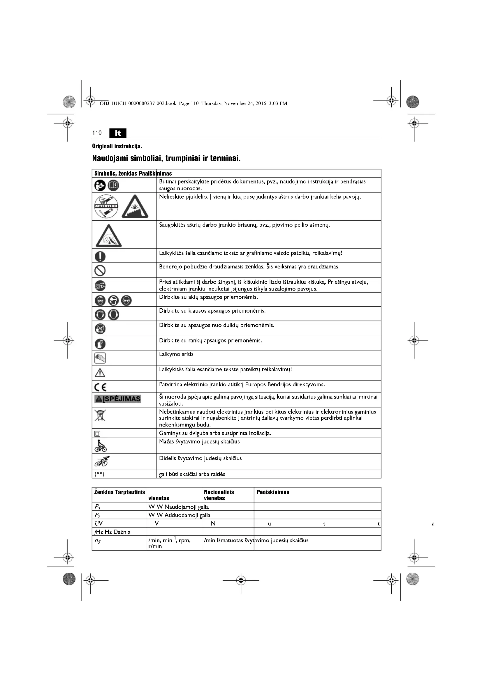 | *ξios vertés nustatyos darbo ciklo, kurj sudaro vienodos trukmês tušéolji eiga ir veikimas visa apkrova, metu. Darbo Jrankiu priskirta vibracijos klase nurodya pridétame lape 34130443060. | |