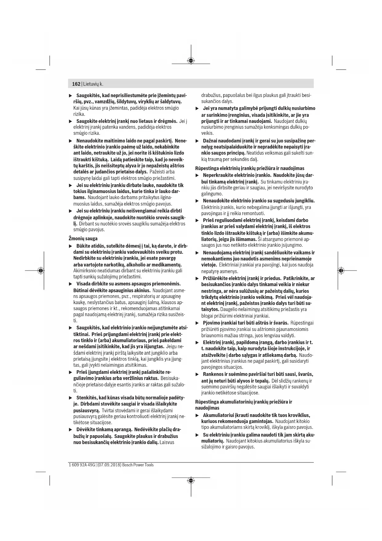 no skrūves garuma. Apkalpošana un apkope Apkalpošana un tīrīšana u Veicot jebkurus darbus ar elektroinstrumentu (piemēram, apkalpošanu, darbinstrumentu nomaiņu utt.), kā arī pirms tā transportēšanas vai uzglabāšanasvienmēr izņemiet no elektroinstrumenta akumulatoru. Ieslēdzēja nejauša nospiešana var izraisīt savainojumu. u Lai elektroinstruments darbotos droši un bez atteikumiem, regulāri tīriet tā korpusu un ventilācijas atveres. Ja, neraugoties uz augsto izgatavošanas kvalitāti un rūpīgo pēcražošanas pārbaudi, elektroinstruments tomēr sabojājas, tasnogādājams remontam firmas Bosch pilnvarotā elektroinstrumentu remonta darbnīcā. Klientu apkalpošanas dienests un konsultācijas par lietošanu Klientu apkalpošanas dienests atbildēs uz jūsu jautājumiem par izstrādājumu remontu un apkalpošanu, kā arī par to rezerves daļām. Kopsalikuma attēlus un informāciju par rezerves daļām varat skatīt tīmekļa vietnē: www.bosch- pt.com Bosch konsultantu komanda jums atbildēs uz jautājumiem par mūsu izstrādājumiem un to piederumiem. Kad uzdodat jautājumus un pasūtāt rezerves daļas, noteikti norādiet 10zīmju preces numuru, kas ir sniegts uz izstrādājuma marķējuma plāksnītes. Latvijas Republika Robert Bosch SIA Bosch elektroinstrumentu servisa centrs Mūkusalas ielā 97 LV-1004 Rīga Tālr.: 67146262 Telefakss: 67146263 E-pasts: service-pt@lv.bosch.com Transportēšana Uz izstrādājumam pievienotajiem litija-jonu akumulatoriem attiecas noteikumi par bīstamo kravu pārvadāšanu. Lietotājs var transportēt akumulatorus ielu transporta plūsmā bez papildu nosacījumiem. Pārsūtot tos ar trešo personu starpniecību (piemēram, ar gaisa transporta vai citu transporta aģentūru starpniecību), jāievēro īpaši sūtījuma iesaiņošanas un marķēšanas noteikumi. Tāpēc sūtījumu sagatavošanas laikā jāpieaicina bīstamo kravu pārvadāšanas speciālists. Pārsūtiet akumulatoru tikai tad, ja tā korpuss nav bojāts. Aizlīmējiet vaļējos akumulatora kontaktus un iesaiņojiet akumulatoru tā, lai tas iesaiņojumā nepārvietotos. Lūdzam ievērot arī ar akumulatoru pārsūtīšanu saistītos nacionālos noteikumus, ja tādi pastāv. Atbrīvošanās no nolietotajiem izstrādājumiem Nolietotie elektroinstrumenti, akumulatori, piederumi un iesaiņojuma materiāli jāpakļauj otrreizējai pārstrādei apkārtējai videi nekaitīgā veidā. Neizmetiet nolietotos elektroinstrumentus, akumulatorus un baterijas sadzīves atkritumu tvertnē! Tikai EK valstīm. Atbilstoši Eiropas Savienības direktīvai 2012/19/ES, lietošanai nederīgie elektroinstrumenti, kā arī, atbilstoši Eiropas Savienības direktīvai 2006/66/EK, bojātie vai nolietotie akumulatori un baterijas jāsavāc atsevišķi un jāpakļauj otrreizējai pārstrādei apkārtējai videi nekaitīgā veidā. Akumulatori/baterijas: Litija-jonu: Lūdzam ievērot sadaļā "Transportēšana" sniegtos norādījumus (skatīt „Transportēšana“, Lappuse161). Lietuvių k. Saugos nuorodos Bendrosios saugos nuorodos dirbantiems su elektriniais įrankiais ĮSPĖJIMAS Perskaitykite visus su šiuo elektri- niu įrankiu pateikiamus saugos įspėjimus, instrukcijas, peržiūrėkite iliustracijas ir speci- fikacijas. Jei nepaisysite visų žemiau pateiktų instrukcijų, galite patirti elektros smūgį, sukelti gaisrą ir sunkiai susižaloti arba sužaloti kitus asmenis. Išsaugokite šias saugos nuorodas ir reikalavimus, kad ir ateityje galėtumėte jais pasinaudoti. Toliau pateiktame tekste vartojama sąvoka „Elektrinis įra- nkis“ apibūdina įrankius, maitinamus iš elektros tinklo (su maitinimo laidu), ir akumuliatorinius įrankius (be maitinimo laido). Darbo vietos saugumas u Darbo vieta turi būti švari ir gerai apšviesta. Netvarkin- ga arba blogai apšviesta darbo vieta gali tapti nelaimingų atsitikimų priežastimi. u Nedirbkite su elektriniu įrankiu aplinkoje, kurioje yra degių skysčių, dujų ar dulkių. Elektriniai įrankiai gali kibirkščiuoti, o nuo kibirkščių dulkės arba susikaupę garai gali užsidegti. u Dirbdami su elektriniu įrankiu neleiskite šalia būti vai- kams ir pašaliniams asmenims. Nukreipę dėmesį į kitus asmenis galite nebesuvaldyti prietaiso. Elektrosauga u Elektrinio įrankio maitinimo laido kištukas turi atitikti tinklo kištukinio lizdo tipą. Kištuko jokiu būdu nega- lima modifikuoti. Nenaudokite kištuko adapterių su įžemintais elektriniais įrankiais. Originalūs kištukai, tiksliai tinkantys elektros tinklo kištukiniam lizdui, sumaži- na elektros smūgio pavojų. Lietuvių k. | 161 Bosch Power Tools 1 609 92A 49G | (07.09.2018)162 | Lietuvių k. 1 609 92A 49G | (07.09.2018) Bosch Power Tools u Saugokitės, kad neprisiliestumėte prie įžemintų pavi- ršių, pvz., vamzdžių, šildytuvų, viryklių ar šaldytuvų. Kai jūsų kūnas yra įžemintas, padidėja elektros smūgio rizika. u Saugokite elektrinį įrankį nuo lietaus ir drėgmės. Jei į elektrinį įrankį patenka vandens, padidėja elektros smūgio rizika. u Nenaudokite maitinimo laido ne pagal paskirtį. Nene- škite elektrinio įrankio paėmę už laido, nekabinkite ant laido, netraukite už jo, jei norite iš kištukinio lizdo ištraukti kištuką. Laidą patieskite taip, kadjo neveik- tų karštis, jis neišsiteptų alyva ir jo nepažeistų aštrios detalės ar judančios prietaiso dalys. Pažeisti arba susipynę laidai gali tapti elektros smūgio priežastimi. u Jei su elektriniu įrankiu dirbate lauke, naudokite tik tokius ilginamuosius laidus, kurie tinka ir lauko dar- bams. Naudojant lauko darbams pritaikytus ilgina- muosius laidus, sumažėja elektros smūgio pavojus. u Jei su elektriniu įrankiu neišvengiamai reikia dirbti drėgnoje aplinkoje, naudokite nuotėkio srovės saugik- lį. Dirbant su nuotėkio srovės saugikliu sumažėja elektros smūgio pavojus. Žmonių sauga u Būkite atidūs, sutelkite dėmesį į tai, kądarote, ir dirb- d