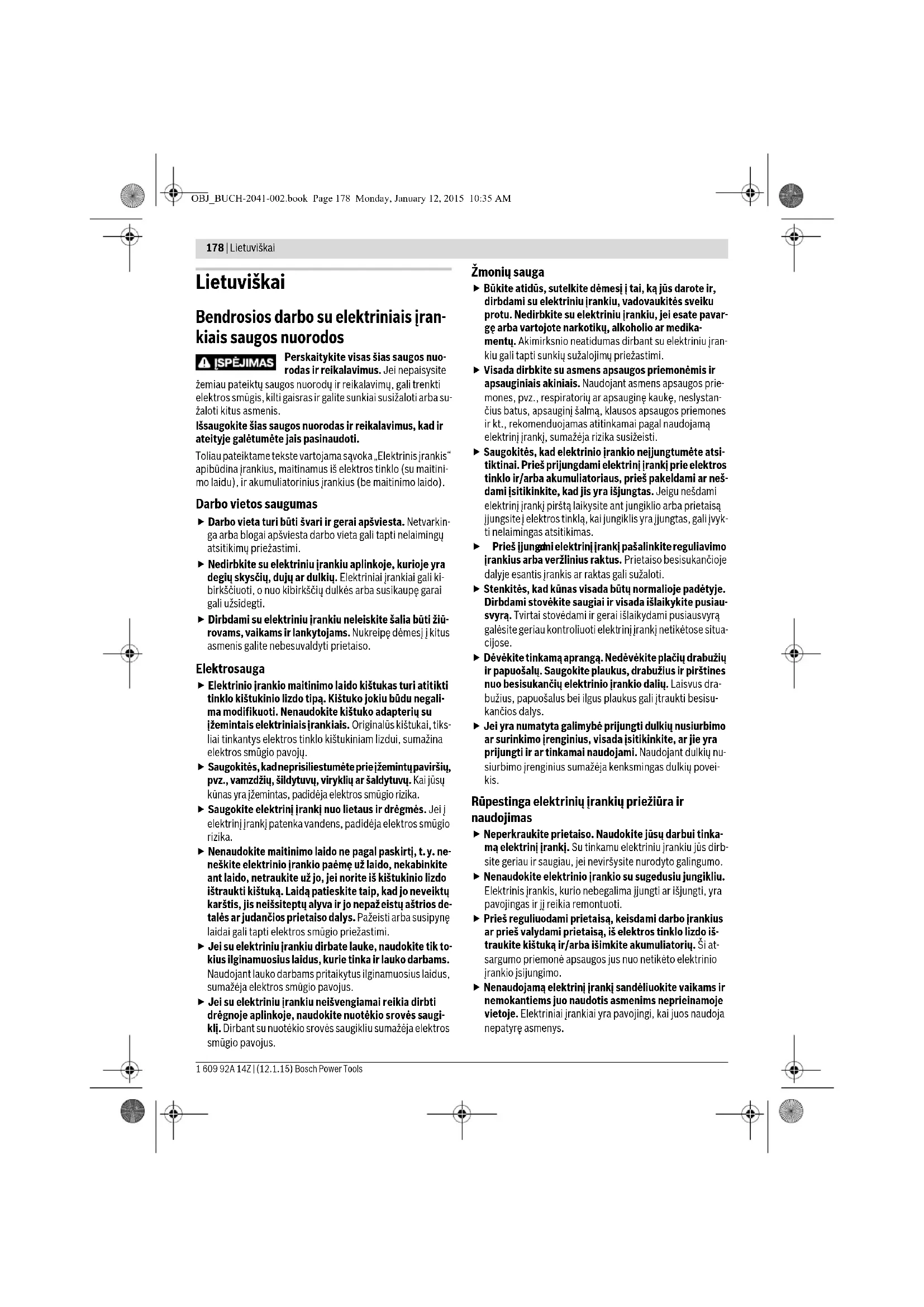 Uzgaļu turētāja montāža un demontāža 13 209 Darbība un tās mērķis Attēls Ievērojiet šo Lappuse OBJ_BUCH-2041-002.book Page 176 Monday, January 12, 2015 10:35 AMLatviešu | 177 Bosch Power Tools 1 609 92A 14Z | (12.1.15) Apkalpošana un tīrīšana Lai nodrošinātu ilgstošu un nevainojamu elektroin- strumenta darbību, uzturiet tīru tā korpusu un ventilā- cijas atveres. Ik reizi pēc lietošanas notīriet darbinstrumentu, iztīriet elek- troinstrumenta darbinstrumenta stiprinājumu un ventilācijas atveres, kā arī iztīriet akumulatora ventilācijas atveres. Klientu konsultāciju dienests un konsultācijas par lietošanu Klientu konsultāciju dienesta darbinieki atbildēs uz Jūsu jau- tājumiem par izstrādājuma remontu un apkalpošanu, kā arī par rezerves daļu iegādi. Izklājuma zīmējumus un informāciju par rezerves daļām var atrast arī interneta vietnē: www.bosch-pt.com Bosch klientu konsultāciju grupa centīsies Jums palīdzēt vis- labākajā veidā, sniedzot atbildes uz jautājumiem par mūsu iz- strādājumiem un to piederumiem. Pieprasot konsultācijas un pasūtot rezerves daļas, noteikti paziņojiet 10 zīmju izstrādājuma numuru, kas atrodams uz elektroinstrumenta marķējuma plāksnītes. Latvijas Republika Robert Bosch SIA Bosch elektroinstrumentu servisa centrs Dzelzavas ielā 120 S LV-1021 Rīga Tālr.: 67146262 Telefakss: 67146263 E-pasts: service-pt@lv.bosch.com Transportēšana Uz izstrādājumam pievienotajiem litija-jonu akumulatoriem attiecas noteikumi par bīstamo kravu pārvadāšanu. Lietotājs var transportēt akumulatorus ielu transporta plūsmā bez pa- pildu nosacījumiem. Pārsūtot tos ar trešo personu starpniecību (piemēram, ar gai- sa transporta vai citu transporta aģentūru starpniecību), jāie- vēro īpaši sūtījuma iesaiņošanas un marķēšanas noteikumi. Tāpēc sūtījumu sagatavošanas laikā jāpieaicina kravu pārva- dāšanas speciālists. Pārsūtiet akumulatoru tikai tad, ja tā korpuss nav bojāts. Aizlī- mējiet vaļējos akumulatora kontaktus un iesaiņojiet akumula- toru tā, lai tas iesaiņojumā nepār vietotos. Lūdz am ievērot arī ar akumulatoru pārsūtīšanu saistītos na- cionālos noteikumus, ja tādi pastāv. Atbrīvošanās no nolietotajiem izstrā- dājumiem Nolietotie elektroinstrumenti, akumulatori, piederu- mi un iesaiņojuma materiāli jāpakļauj otrreizējai pār- strādei apkārtējai videi nekaitīgā veidā. Neizmetiet nolietotos elektroinstrumentus, akumulatorus un baterijas sadzīves atkritumu tvertnē! Tikai ES valstīm Atbilstoši Eiropas Savienības direktīvai 2012/19/ES par nolietotajām elektriskajām un elektroniskajām ierīcēm, lietošanai nede- rīgie elektroinstrumenti, kā arī, atbilstoši di- rektīvai 2006/66/EK, bojātie vai nolietotie akumulatori un baterijas jāsavāc atsevišķi un jānogādā otrreizējai pārstrādei apkārtējai videi nekaitīgā vei- dā. Tiesības uz izmaiņām tiek saglabātas. Mehāniskā pārnesumu pārslēgšana 14 209 Ieslēgšana un izslēgšana 15 210 Akumulatora uzlādes pakāpes pārbaude 16 210 Piederumu izvēle – 211 – 212 Darbība un tās mērķis Attēls Ievērojiet šo Lappuse OBJ_BUCH-2041-002.book Page 177 Monday, January 12, 2015 10:35 AM178 | Lietuviškai 1 609 92A 14Z | (12.1.15) Bosch Power Tools Lietuviškai Bendrosios darbo su elektriniais įran- kiais saugos nuorodos Perskaitykite visas šias saugos nuo- rodas ir reikalavimus. Jei nepaisysite žemiau pateiktų saugos nuorodų ir reikalavimų, gali trenkti elektros smūgis, kilti gaisras ir galite sunkiai susižaloti arba su- žaloti kitus asmenis. Išsaugokite šias saugos nuorodas ir reikalavimus, kad ir ateityje galėtumėte jais pasinaudoti. Toliau pateiktame tekste vartojama sąvoka „Elektrinis įrankis“ apibūdina įrankius, maitinamus iš elektros tinklo (su maitini- mo laidu), ir akumuliatorinius įrankius (be maitinimo laido). Darbo vietos saugumas Darbo vieta turi būti švari ir gerai apšviesta. Netvarkin- ga arba blogai apšviesta darbo vieta gali tapti nelaimingų atsitikimų priežastimi. Nedirbkite su elektriniu įrankiu aplinkoje, kurioje yra degių skysčių, dujų ar dulkių. Elektriniai įrankiai gali ki- birkščiuoti, o nuo kibirkščių dulkės arba susikaupę garai gali užsidegti. Dirbdami su elektriniu įrankiu neleiskite šalia būti žiū- rovams, vaikams ir lankytojams. Nukreipę dėmesį į kitus asmenis galite nebesuvaldyti prietaiso. Elektrosauga Elektrinio įrankio maitinimo laido kištukas turi atitikti tinklo kištukinio lizdo tipą. Kištuko jokiu būdu negali- ma modifikuoti. Nenaudokite kištuko adapterių su įžemintais elektriniais įrankiais. Originalūs kištukai, tiks- liai tinkantys elektros tinklo kištukiniam lizdui, sumažina elektros smūgio pavojų. Saugokitės, kad neprisiliestumėte prie įžemintų paviršių, pvz., vamzdžių, šildytuvų, viryklių ar šaldytuvų. Kai jūsų kūnas yra įžemintas, padidėja elektros smūgio rizika. Saugokite elektrinį įrankį nuo lietaus ir drėgmės. Jei į elektrinį įrankį patenka vandens, padidėja elektros smūgio rizika. Nenaudokite maitinimo laido ne pagal paskirtį, t.y. ne- neškite elektrinio įrankio paėmę už laido, nekabinkite ant laido, netraukite už jo, jei norite iš kištukinio lizdo ištraukti kištuką. Laidą patieskite taip, kad jo neveiktų karštis, jis neišsiteptų alyv a ir jo nepaž eistų aštrios de- talės ar judančios prietaiso dalys. Pažeisti arba susipynę laidai gali tapti elektros smūgio priežastimi. Jei su elektriniu įrankiu dirbate lauke, naudokite tik to- kius ilginamuosius laidus, kurie tinka ir lauko darbams. Naudojant lauko darbams pritaikytus ilginamuosius laidus, sumažėja elektros smūgio pavojus. Jei su elektriniu įrankiu neišvengiamai reikia dirbti drėgnoje aplinkoje, naudokite nuotėkio srovės saugi- klį. Dirbant su nuotėkio srovės saugikliu sumažėja elektros smūgio pavojus. Žmonių sauga Būki