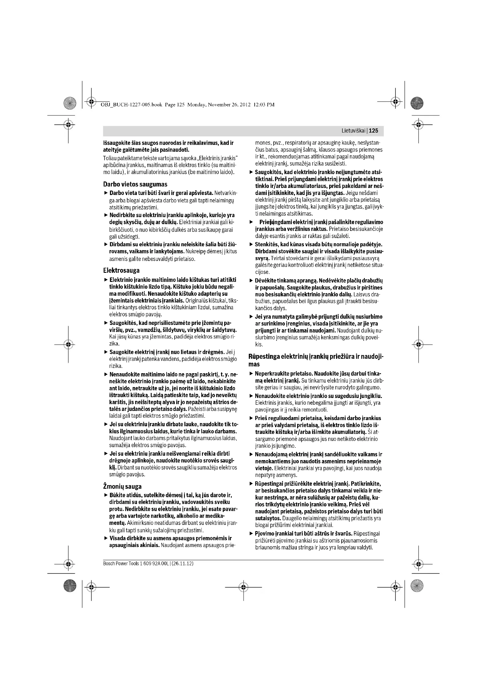 Piederumu izvēle – 147 OBJ_BUCH-1227-005.book Page 124 Monday, November 26, 2012 12:03 PMLietuviškai | 125 Bosch Power Tools 1 609 92A 00L | (26.11.12) Išsaugokite šias saugos nuorodas ir reikalavimus, kad ir ateityje galėtumėte jais pasinaudoti. Toliau pateiktame tekste vartojama sąvoka „Elektrinis įrankis“ apibūdina įrankius, maitinamus iš elektros tinklo (su maitini- mo laidu), ir akumuliatorinius įrankius (be maitinimo laido). Darbo vietos saugumas Darbo vieta turi būti švari ir gerai apšviesta. Netvarkin- ga arba blogai apšviesta darbo vieta gali tapti nelaimingų atsitikimų priežastimi. Nedirbkite su elektriniu įrankiu aplinkoje, kurioje yra degių skysčių, dujų ar dulkių. Elektriniai įrankiai gali ki- birkščiuoti, o nuo kibirkščių dulkės arba susikaupę garai gali užsidegti. Dirbdami su elektriniu įrankiu neleiskite šalia būti žiū- rovams, vaikams ir lankytojams. Nukreipę dėmesį į kitus asmenis galite nebesuvaldyti prietaiso. Elektrosauga Elektrinio įrankio maitinimo laido kištukas turi atitikti tinklo kištukinio lizdo tipą. Kištuko jokiu būdu negali- ma modifikuoti. Nenaudokite kištuko adapterių su įžemintais elektriniais įrankiais. Originalūs kištukai, tiks- liai tinkantys elektros tinklo kištukiniam lizdui, sumažina elektros smūgio pavojų. Saugokitės, kad neprisiliestumėte prie įžemintų pa- viršių, pvz., vamzdžių, šildytuvų, viryklių ar šaldytuvų. Kai jūsų kūnas yra įžemintas, padidėja elektros smūgio ri- zika. Saugokite elektrinį įrankį nuo lietaus ir drėgmės. Jei į elektrinį įrankį patenka vandens, padidėja elektros smūgio rizika. Nenaudokite maitinimo laido ne pagal paskirtį, t.y. ne- neškite elektrinio įrankio paėmę už laido, nekabinkite ant laido, netraukite už jo, jei norite iš kištukinio lizdo ištraukti kištuką. Laidą patieskite taip, kad jo neveiktų karštis, jis neišsiteptų alyva ir jo nepažeistų aštrios de- talės ar judančios prietaiso dalys. Pažeisti arba susipynę laidai gali tapti elektros smūgio priežastimi. Jei su elektriniu įrankiu dirbate lauke, naudokite tik to- kius ilginamuosius laidus, kurie tinka ir lauko darbams. Naudojant lauko darbams pritaikytus ilginamuosius laidus, sumažėja elektros smūgio pavojus. Jei su elektriniu įrankiu neišvengiamai reikia dirbti drėgnoje aplinkoje, naudokite nuotėkio srovės saugi- klį. Dirbant su nuotėkio srovės saugikliu sumažėja elektros smūgio pavojus. Žmonių sauga Būkite atidūs, sutelkite dėmesį į tai, ką jūs darote ir, dirbdami su elektriniu įrankiu, vadovaukitės sveiku protu. Nedirbkite su elektriniu įrankiu, jei esate pavar- gę arba vartojote narkotikų, alkoholio ar medika- mentų. Akimirksnio neatidumas dirbant su elektriniu įran- kiu gali tapti sunkių sužalojimų priežastimi. Visada dirbkite su asmens apsaugos priemonėmis ir apsauginiais akiniais. Naudojant asmens apsaugos prie- mones, pvz., respiratorių ar apsauginę kaukę, neslystan- čius batus, apsauginį šalmą, klausos apsaugos priemones ir kt., rekomenduojamas atitinkamai pagal naudojamą elektrinį įrankį, sumažėja rizika susižeisti. Saugokitės, kad elektrinio įrankio neįjungtumėte atsi- tiktinai. Prieš prijungdami elektrinį įrankį prie elektros tinklo ir/arba akumuliatoriaus, prieš pakeldami ar neš- dami įsitikinkite, kad jis yra išjungtas. Jeigu nešdami elektrinį įrankį pirštą laikysite ant jungiklio arba prietaisą įjungsite į elektros tinklą, kai jungiklis yra įjungtas, gali įvyk- ti nelaimingas atsitikimas. Prieš į jungdami elektrinį įrankį pašalinkite reguliavimo įrankius arba veržlinius raktus. Prietaiso besisukančioje dalyje esantis įrankis ar raktas gali sužaloti. Stenkitės, kad kūnas visada būtų normalioje padėtyje. Dirbdami stovėkite saugiai ir visada išlaikykite pusiau- svyrą. Tvirtai stovėdami ir gerai išlaikydami pusiausvyrą galėsite geriau kontroliuoti elektrinį įrankį netikėtose situa- cijose. Dėvėkite tinkamą aprangą. Nedėvėkite plačių drabužių ir papuošalų. Saugokite plaukus, drabužius ir pirštines nuo besisukančių elektrinio įrankio dalių. Laisvus dra- bužius, papuošalus bei ilgus plaukus gali įtraukti besisu- kančios dalys. Jei yra numatyta galimybė prijungti dulkių nusiurbimo ar surinkimo įrenginius, visada įsitikinkite, ar jie yra prijungti ir ar tinkamai naudojami. Naudojant dulkių nu- siurbimo įrenginius sumažėja kenksmingas dulkių povei- kis. Rūpestinga elektrinių įrankių priežiūra ir naudoji- mas Neperkraukite prietaiso. Naudokite jūsų darbui tinka- mą elektrinį įrankį. Su tinkamu elektriniu įrankiu jūs dirb- site geriau ir saugiau, jei neviršysite nurodyto galingumo. Nenaudokite elektrinio įrankio su sugedusiu jungikliu. Elektrinis įrankis, kurio nebegalima įjungti ar išjungti, yra pavojingas ir jį reikia remontuoti. Prieš reguliuodami prietaisą, keisdami darbo įrankius ar prieš valydami prietaisą, iš elektros tinklo lizdo iš- traukite kištuką ir/arba išimkite akumuliatorių. Ši at- sargumo priemonė apsaugos jus nuo netikėto elektrinio įrankio įsijungimo. Nenaudojamą elektrinį įrankį sandėliuokite vaikams ir nemokantiems juo naudotis asmenims neprieinamoje vietoje. Elektriniai įrankiai yra pavojingi, kai juos naudoja nepatyrę asmenys. Rūpestingai prižiūrėkite elektrinį įrankį. Patikrinkite, ar besisukančios prietaiso dalys tinkamai veikia ir nie- kur nestringa, ar nėra sulūžusių ar pažeistų dalių, ku- rios trikdytų elektrinio įrankio veikimą. Prieš vėl naudojant prietaisą, pažeistos prietaiso dalys turi būti sutaisytos. Daugelio nelaimingų atsitikimų priežastis yra blogai prižiūrimi elektriniai įrankiai. Pjovimo įrankiai turi būti aštrūs ir švarūs. Rūpestingai prižiūrėti pjovimo įrankiai su aštriomis pjaunamosiomis briaunomis mažiau stringa ir juos yra lengviau valdyti. OBJ_BUCH-1227-005.book Page 125 Monday, Novem