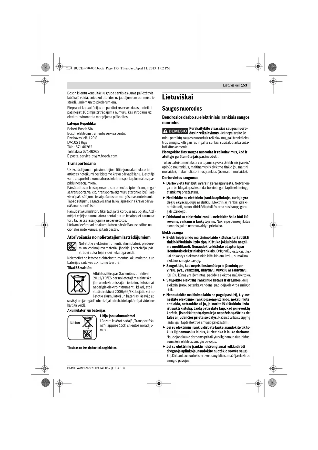 varžto ilgio kiaurymę, kurios skersmuo būtų lygus sriegio vidiniam diametrui. Priežiūra ir servisas Priežiūra ir valymas Prieš atliekant bet kokius prietaiso priežiūros darbus (atliekant techninę priežiūrą ar keičiant įrankį ir t.t.), o taip pat transportuojant ir sandėliuojant prietaisą, bū- tina iš jo išimti akumuliatorių. Priešingu atveju galite su- sižeisti, netyčia nuspaudę įjungimo-išjungimo jungiklį. Reguliariai valykite elektrinį įrankį ir ventiliacines an- gas jo korpuse, tuomet galėsite dirbti kokybiškai ir sau- giai. Jei akumuliatorius nebeveikia, prašome kreiptis į Bosch įga- liotą klientų aptarnavimo tarnybą. Klientų aptarnavimo skyrius ir naudotojų konsul- tavimo tarnyba Klientų aptarnavimo skyriuje gausite atsakymus į klausimus, susijusius su jūsų gaminio remontu, technine priežiūra bei at- sarginėmis dalimis. Detalius brėžinius ir informaciją apie at- sargines dalis rasite čia: www.bosch-pt.com Bosch naudotojų konsultavimo tarnybos specialistai mielai at- sakys į klausimus apie mūsų gaminius ir papildomą įrangą. Ieškant informacijos ir užsakant atsargines dalis būtina nuro- dyti dešimtženklį gaminio užsakymo numerį. Lietuva Bosch įrankių servisas Informacijos tarnyba: (037) 713350 ļrankių remontas: (037) 713352 Faksas: (037) 713354 El. paštas: service-pt@lv.bosch.com Šviesos diodai Talpa Dega nuolat 3 x žali ≥ 2/3 Dega nuolat 2 x žali ≥1/3 Dega nuolat 1 x žalias < 1/3 Mirksi 1 x žalias Atsarga OBJ_BUCH-970-005.book Page 157 Thursday, April 11, 2013 1:02 PM158 | Lietuviškai 2 609 141 052 | (11.4.13) Bosch Power Tools Transportavimas Kartu pateikiamų ličio jonų akumuliatorių gabenimui taikomos pavojingų krovinių gabenimą reglamentuojančių įstatymų nuostatos. Naudotojui akumuliatorius gabenti keliais leidžia- ma be jokių apribojimų. Jei siunčiant pasitelkiami tretieji asmenys (pvz., oro transpor- tas, ekspedijavimo įmonė), būtina atsižvelgti į pakuotei ir žen- klinimui taikomus ypatingus reikalavimus. Būtina, kad ren- giant siuntą dalyvautų pavojingų krovinių gabenimo specialis- tas. Siųskite tik tokius akumuliatorius, kurių nepažeistas korpu- sas. Apklijuokite kontaktus ir supakuokite akumuliatorių taip, kad jis pakuotėje nejudėtų. Taip pat laikykitės ir esamų papildomų nacionalinių taisyklių. Šalinimas Elektriniai įrankiai, akumuliatoriai, papildoma įranga ir pakuotės turi būti ekologiškai utilizuojami. Elektrinių įrankių, akumuliatorių bei baterijų nemeskite į buiti- nių atliekų konteinerius! Tik ES šalims: Pagal Europos direktyvą 2012/19/ES, nau- doti nebetinkami elektriniai įrankiai ir, pagal Europos direktyvą 2006/66/EB, pažeisti ir išeikvoti akumuliatoriai bei baterijos turi būti surenkami atskirai ir perdirbami aplin- kai nekenksmingu būdu. Akumuliatoriai ir baterijos Ličio jonų: Prašome laikytis skyriuje „Transporta- vimas“, psl. 158 pateiktų nuorodų. Galimi pakeitimai. OBJ_BUCH-970-005.book Page 158 Thursday, April 11, 2013 1:02 PM | 159 Bosch Power Tools 2 609 141 052 | (11.4.13)
