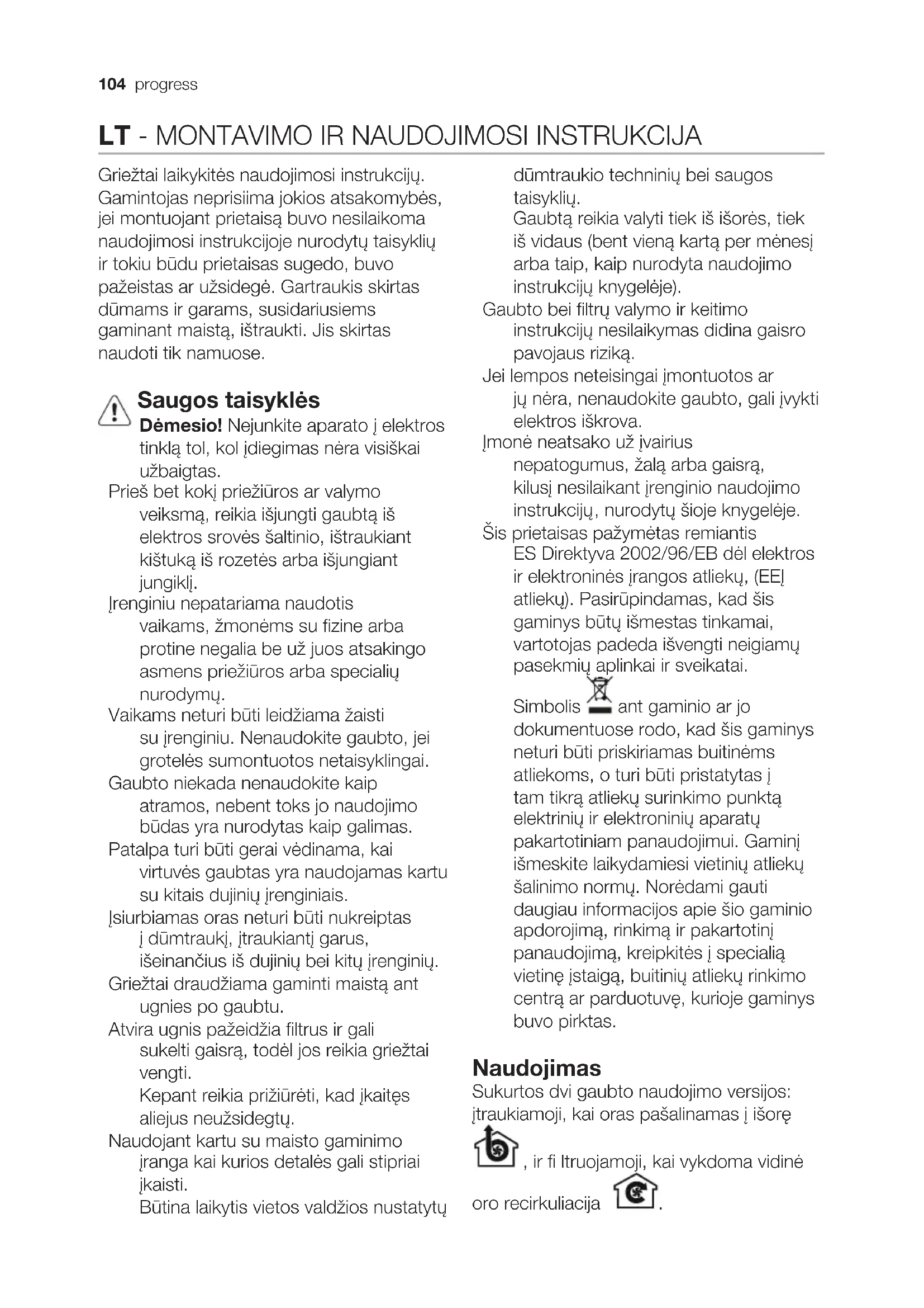 Griežtai laikykitės naudojimosi instrukcijų. Gamintojas neprisiima jokios atsakomybės, jei montuojant prietaisą buvo nesilaikoma naudojimosi instrukcijoje nurodytų taisyklių ir tokiu būdu prietaisas sugedo, buvo pažeistas ar užsidegė. Gartraukis skirtas dūmams ir garams, susidariusiems gaminant maistą, ištraukti. Jis skirtas naudoti tik namuose. Saugos taisyklės Dėmesio! Nejunkite aparato į elektros tinklą tol, kol įdiegimas nėra visiškai užbaigtas. Prieš bet kokį priežiūros ar valymo veiksmą, reikia išjungti gaubtą iš elektros srovės šaltinio, ištraukiant kištuką iš rozetės arba išjungiant jungiklį. Įrenginiu nepatariama naudotis vaikams, žmonėms su fizine arba protine negalia be už juos atsakingo asmens priežiūros arba specialių nurodymų. Vaikams neturi būti leidžiama žaisti su įrenginiu. Nenaudokite gaubto, jei grotelės sumontuotos netaisyklingai. Gaubto niekada nenaudokite kaip atramos, nebent toks jo naudojimo būdas yra nurodytas kaip galimas. Patalpa turi būti gerai vėdinama, kai virtuvės gaubtas yra naudojamas kartu su kitais dujinių įrenginiais. Įsiurbiamas oras neturi būti nukreiptas į dūmtraukį, įtraukiantį garus, išeinančius iš dujinių bei kitų įrenginių. Griežtai draudžiama gaminti maistą ant ugnies po gaubtu. Atvira ugnis pažeidžia filtrus ir gali sukelti gaisrą, todėl jos reikia griežtai vengti. Kepant reikia prižiūrėti, kad įkaitęs aliejus neužsidegtų. Naudojant kartu su maisto gaminimo įranga kai kurios detalės gali stipriai įkaisti. Būtina laikytis vietos valdžios nustatytų dūmtraukio techninių bei saugos taisyklių. Gaubtą reikia valyti tiek iš išorės, tiek iš vidaus (bent vieną kartą per mėnesį arba taip, kaip nurodyta naudojimo instrukcijų knygelėje). Gaubto bei filtrų valymo ir keitimo instrukcijų nesilaikymas didina gaisro pavojaus riziką. Jei lempos neteisingai įmontuotos ar jų nėra, nenaudokite gaubto, gali įvykti elektros iškrova. Įmonė neatsako už įvairius nepatogumus, žalą arba gaisrą, kilusį nesilaikant įrenginio naudojimo instrukcijų , nurodytų šioje knygelėje. Šis prietaisas pažymėtas remiantis ES Direktyva 2002/96/EB dėl elektros ir elektroninės įrangos atliekų, (EEĮ atliekų). Pasirūpindamas, kad šis gaminys būtų išmestas tinkamai, vartotojas padeda išvengti neigiamų pasekmių aplinkai ir sveikatai. Simbolis ant gaminio ar jo dokumentuose rodo, kad šis gaminys neturi būti priskiriamas buitinėms atliekoms, o turi būti pristatytas į tam tikrą atliekų surinkimo punktą elektrinių ir elektroninių aparatų pakartotiniam panaudojimui. Gaminį išmeskite laikydamiesi vietinių atliekų šalinimo normų. Norėdami gauti daugiau informacijos apie šio gaminio apdorojimą, rinkimą ir pakartotinį panaudojimą, kreipkitės į specialią vietinę įstaigą, buitinių atliekų rinkimo centrą ar parduotuvę, kurioje gaminys buvo pirktas. Naudojimas Sukurtos dvi gaubto naudojimo versijos: įtraukiamoji, kai oras pašalinamas į išorę , ir fi ltruojamoji, kai vykdoma vidinė oro recirkuliacija .progress 105 Įrengimas Itin didelio svorio gaminys: jį kilnoti ir montuoti privalo du ar daugiau asmenų. Jei viryklė elektrinė, mažiausias atstumas tarp viryklės kaitlentės paviršiaus ir žemiausios virtuvinio gaubto dalies turi būti 50cm, o jei viryklė dujinė ar kombinuota – 65cmo jei viryklė dujinė ar kombinuota. Jei dujinės viryklės įrengimo instrukcijoje nurodomas didesnis atstumas, būtina į tai atsižvelgti. Įtampa elektros tinkle turi atitikti įtampą, nurodytą etiketėje, priklijuotoje gaubto viduje. Jei yra kištukas, reikia įjungti gaubtą į rozetę, atitinkančią galiojančius nuostatus ir esančią prieinamoje vietoje net ir po gaubto įdiegimo. Jeigu kištuko (yra numatytas tiesioginis prijungimas prie elektros srovės) arba nėra rozetės prieinamoje vietoje net ir po gaubto įdiegimo, yra naudojamas dvipolis jungiklis, pagal visas įdiegimo taisykles užtikrinantis visišką atsijungimą nuo elektros tinklo per aukštos įtampos atveju. D ėmesio! Prieš vėl prijungdami gaubtą prie elektros maitinimo tinklo ir patikrindami, ar jis tinkamai veikia, visada įsitikinkite, ar tinklo kabelis tinkamai įmontuotas. Veikimas Gaubte yra valdymo skydelis su ištraukimo greičio parinkimu ir šviesos jungikliu, kuriuo galima valdyti kepimo ploto šviesas. 1 2-3