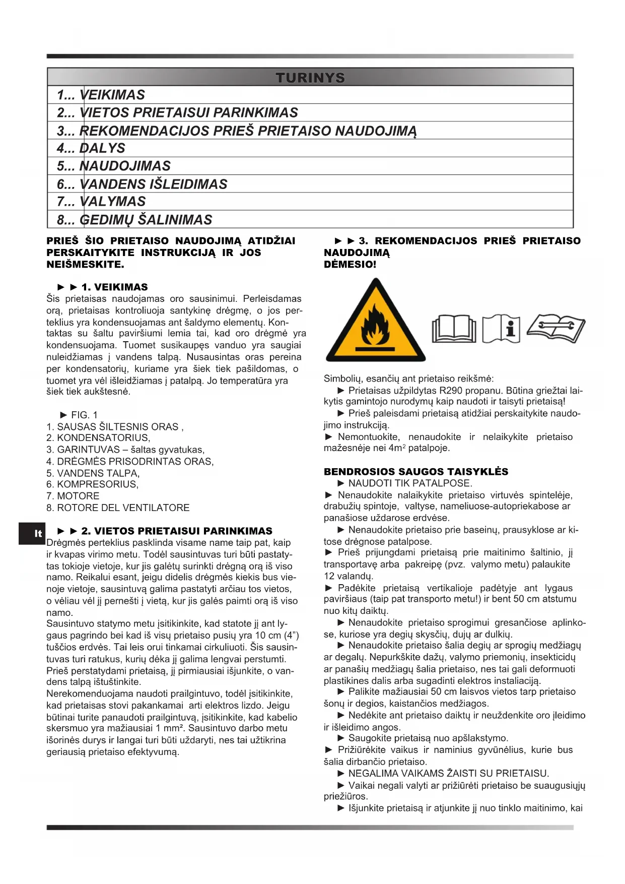 ► NAUDOTI TIK PATALPOSE. ► Nenaudokite nalaikykite prietaiso virtuvės spintelėje, drabužių spintoje, valtyse, nameliuose-autopriekabose ar panašiose uždarose erdvėse. ► Nenaudokite prietaiso prie baseinų, prausyklose ar ki- tose drėgnose patalpose. ► Prieš prijungdami prietaisą prie maitinimo šaltinio, jį transportavę arba pakreipę (pvz. valymo metu) palaukite 12 valandų. ► Padėkite prietaisą vertikalioje padėtyje ant lygaus paviršiaus (taip pat transporto metu!) ir bent 50 cm atstumu nuo kitų daiktų. ► Nenaudokite prietaiso sprogimui gresančiose aplinko- se, kuriose yra degių skysčių, dujų ar dulkių. ► Nenaudokite prietaiso šalia degių ar sprogių medžiagų ar degalų. Nepurkškite dažų, valymo priemonių, insekticidų ar panašių medžiagų šalia prietaiso, nes tai gali deformuoti plastikines dalis arba sugadinti elektros instaliaciją. ► Palikite mažiausiai 50 cm laisvos vietos tarp prietaiso šonų ir degios, kaistančios medžiagos. ► Nedėkite ant prietaiso daiktų ir neuždenkite oro įleidimo ir išleidimo angos. ► Saugokite prietaisą nuo apšlakstymo. ► Prižiūrėkite vaikus ir naminius gyvūnėlius, kurie bus šalia dirbančio prietaiso. ► NEGALIMA VAIKAMS ŽAISTI SU PRIETAISU. ► Vaikai negali valyti ar prižiūrėti prietaiso be suaugusiųjų priežiūros. ► Išjunkite prietaisą ir atjunkite jį nuo tinklo maitinimo, kai TURINYS TURINYS 1... VEIKIMAS