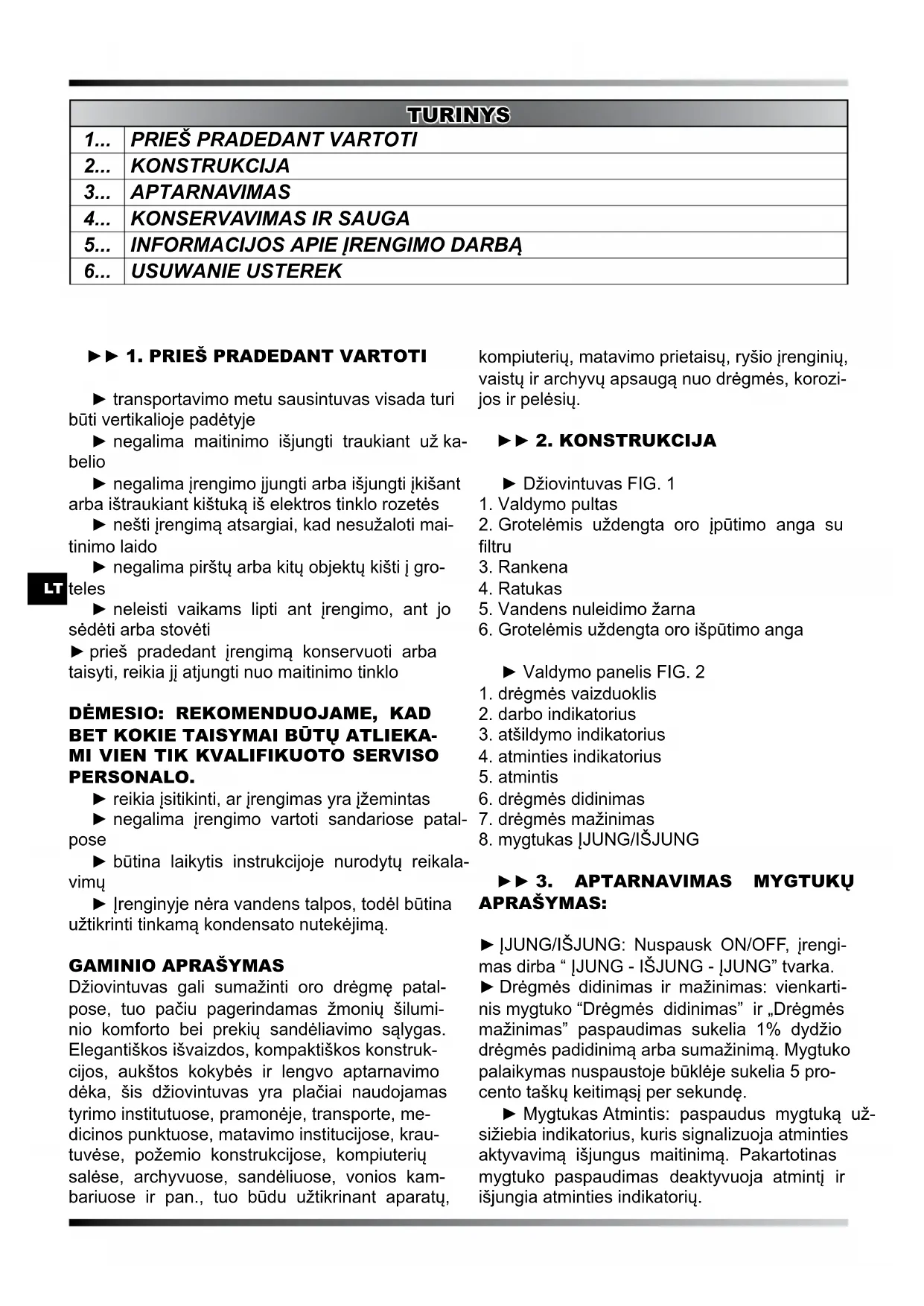 ► transportavimo metu sausintuvas visada turi būti vertikalioje padėtyje ► negalima maitinimo išjungti traukiant už ka- belio ► negalima įrengimo įjungti arba išjungti įkišant arba ištraukiant kištuką iš elektros tinklo rozetės ► nešti įrengimą atsargiai, kad nesužaloti mai- tinimo laido ► negalima pirštų arba kitų objektų kišti į gro- teles ► neleisti vaikams lipti ant įrengimo, ant jo sėdėti arba stovėti ► prieš pradedant įrengimą konservuoti arba taisyti, reikia jį atjungti nuo maitinimo tinklo DėMESIO: REKOMENDUOJAME, KAD bET KOKIE TAISYMAI būTų ATLIEKA-
