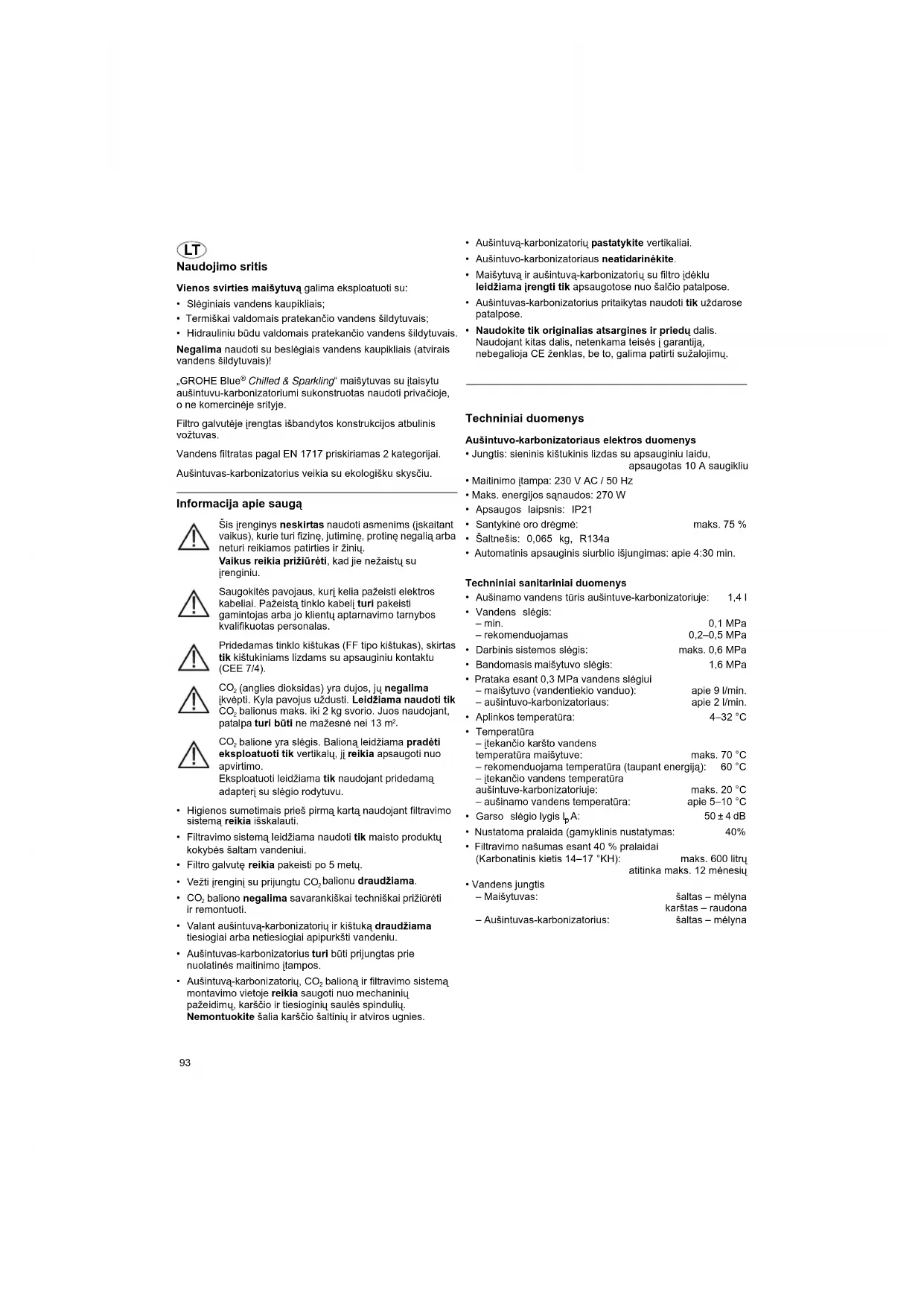 Chilled & Sparkling“ maišytuvas su įtaisytu aušintuvu-karbonizatoriumi sukonstruotas naudoti privačioje, o ne komercinėje srityje. Filtro galvutėje įrengtas išbandytos konstrukcijos atbulinis vožtuvas. Vandens filtratas pagal EN 1717 priskiriamas 2 kategorijai. Aušintuvas-karbonizatorius veikia su ekologišku skysčiu. Informacija apie saugą Šis įrenginys neskirtas naudoti asmenims (įskaitant vaikus), kurie turi fizinę, jutiminę, protinę negalią arba neturi reikiamos patirties ir žinių. Vaikus reikia prižiūrėti, kad jie nežaistų su įrenginiu. Saugokitės pavojaus, kurį kelia pažeisti elektros kabeliai. Pažeistą tinklo kabelį turi pakeisti gamintojas arba jo klientų aptarnavimo tarnybos kvalifikuotas personalas. Pridedamas tinklo kištukas (FF tipo kištukas), skirtas tik kištukiniams lizdams su apsauginiu kontaktu (CEE 7/4).