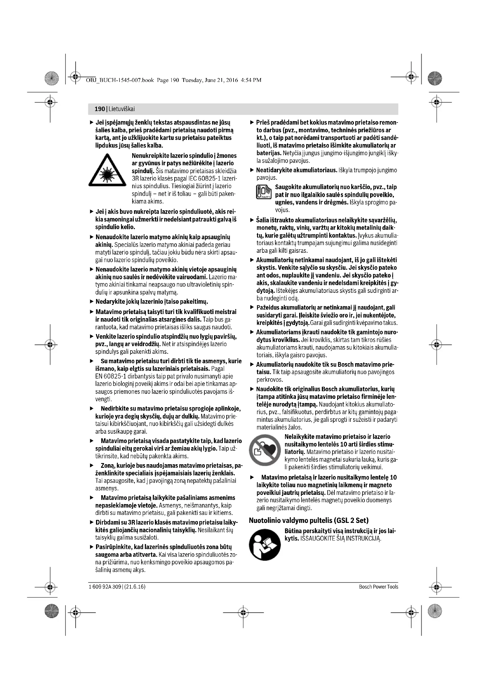 JĮ KITAM SAVININKUI. Atsargiai – jei naudojami kitokie nei čia aprašyti valdy- mo ar justavimo įrenginiai arba taikomi kitokie meto- dai, spinduliavimas gali būti pavojingas. Matavimo prietaisas pateikiamas su dviem įspėjamai- siais ženklais (matavimo prietaiso schemoje pažymė- tais numeriu 2). OBJ_BUCH-1545-007.book Page 189 Tuesday, June 21, 2016 4:54 PM190 | Lietuviškai 1 609 92A 309 | (21.6.16) Bosch Power Tools Jei įspėjamųjų ženklų tekstas atspausdintas ne jūsų šalies kalba, prieš pradėdami prietaisą naudoti pirmą kartą, ant jo užklijuokite kartu su prietaisu pateiktus lipdukus jūsų šalies kalba. Nenukreipkite lazerio spindulio į žmones ar gyvūnus ir patys nežiūrėkite į lazerio spindulį. Šis matavimo prietaisas skleidžia 3R lazerio klasės pagal IEC60825-1 lazeri- nius spindulius. Tiesiogiai žiūrint į lazerio spindulį – net ir iš toliau – gali būti paken- kiama akims. Jei į akis buvo nukreipta lazerio spinduliuotė, akis rei- kia sąmoningai užmerkti ir nedelsiant patraukti galvą iš spindulio kelio. Nenaudokite lazerio matymo akinių kaip apsauginių akinių. Specialūs lazerio matymo akiniai padeda geriau matyti lazerio spindulį, tačiau jokiu būdu nėra skirti apsau- gai nuo lazerio spindulių poveikio. Nenaudokite lazerio matymo akinių vietoje apsauginių akinių nuo saulės ir nedė vėkite vairuodami. Lazerio ma- tymo akiniai tinkamai neapsaugo nuo ultravioletinių spin- dulių ir apsunkina spalvų matymą. Nedarykite jokių lazerinio įtaiso pakeitimų. Matavimo prietaisą taisyti turi tik kvalifikuoti meistrai ir naudoti tik originalias atsargines dalis. Taip bus ga- rantuota, kad matavimo prietaisas išliks saugus naudoti. Venkite lazerio spindulio atspindžių nuo lygių paviršių, pvz., langų ar veidrodžių. Net ir atsispindėjęs lazerio spindulys gali pakenkti akims. Su matavimo prietaisu turi dirbti tik tie asmenys, kurie išmano, kaip elgtis su lazeriniais prietaisais. Pagal EN 60825-1 dirbantysis taip pat privalo nusimanyti apie lazerio biologinį poveikį akims ir odai bei apie tinkamas ap- saugos priemones nuo lazerio spinduliuotės pavojams iš- vengti. Nedirbkite su matavimo prietaisu sprogioje aplinkoje, kurioje yra degių skysčių, dujų ar dulkių. Matavimo prie- taisui kibirkščiuojant, nuo kibirkščių gali užsidegti dulkės arba susikaupę garai. Matavimo prietaisą visada pastatykite taip, kad lazerio spinduliai eitų gerokai virš ar žemiau akių lygio. Taip už- tikrinsite, kad nebūtų pakenkta akims. Zoną, kurioje bus naudojamas matavimo prietaisas, pa- ženklinkite specialiais įspėjamaisiais lazerių ženklais. Tai apsaugosite, kad į pavojingą zoną nepatektų pašaliniai asmenys. Matavimo prietaisą laikykite pašaliniams asmenims nepasiekiamoje vietoje. Asmenys, neišmanantys, kaip dirbti su matavimo prietaisu, gali pakenkti sau ir kitiems. Dirbdami su 3R lazerio klasės matavimo prietaisu laiky- kitės galiojančių nacionalinių taisyklių. Nesilaikant šių taisyklių galima susižaloti. Pasirūpinkite, kad lazerinės spinduliuotės zona būtų saugoma arba atitverta. Kai visa lazerio spinduliuotės zo- na prižiūrima, nuo kenksmingo poveikio apsaugomos pa- šalinių asmenų akys. Prieš pradėdami bet kokius matavimo prietaiso remon- to darbus (pvz., montavimo, techninės priežiūros ar kt.), o taip pat norėdami transportuoti ar padėti sandė- liuoti, iš matavimo prietaiso išimkite akumuliatorių ar baterijas. Netyčia įjungus įjungimo-išjungimo jungiklį išky- la sužalojimo pavojus. Neatidarykite akumuliatoriaus. Iškyla trumpojo jungimo pavojus. Saugokite akumuliatorių nuo karščio, pvz., taip pat ir nuo ilgalaikio saulė s spindulių poveikio, ugnies, vandens ir drėgmės. Iškyla sprogimo pa- vojus. Šalia ištraukto akumuliatoriaus nelaikykite sąvaržėlių, monetų, raktų, vinių, varžtų ar kitokių metalinių daik- tų, kurie galėtų užtrumpinti kontaktus. Įvykus akumulia- toriaus kontaktų trumpajam sujungimui galima nusideginti arba gali kilti gaisras. Akumuliatorių netinkamai naudojant, iš jo gali ištekėti skystis. Venkite sąlyčio su skysčiu. Jei skysčio pateko ant odos, nuplaukite jį vandeniu. Jei skysčio pateko į akis, skalaukite vandeniu ir nedelsdami kreipkitės į gy- dytoją. Ištekėjęs akumuliatoriaus skystis gali sudirginti ar- ba nudeginti odą.