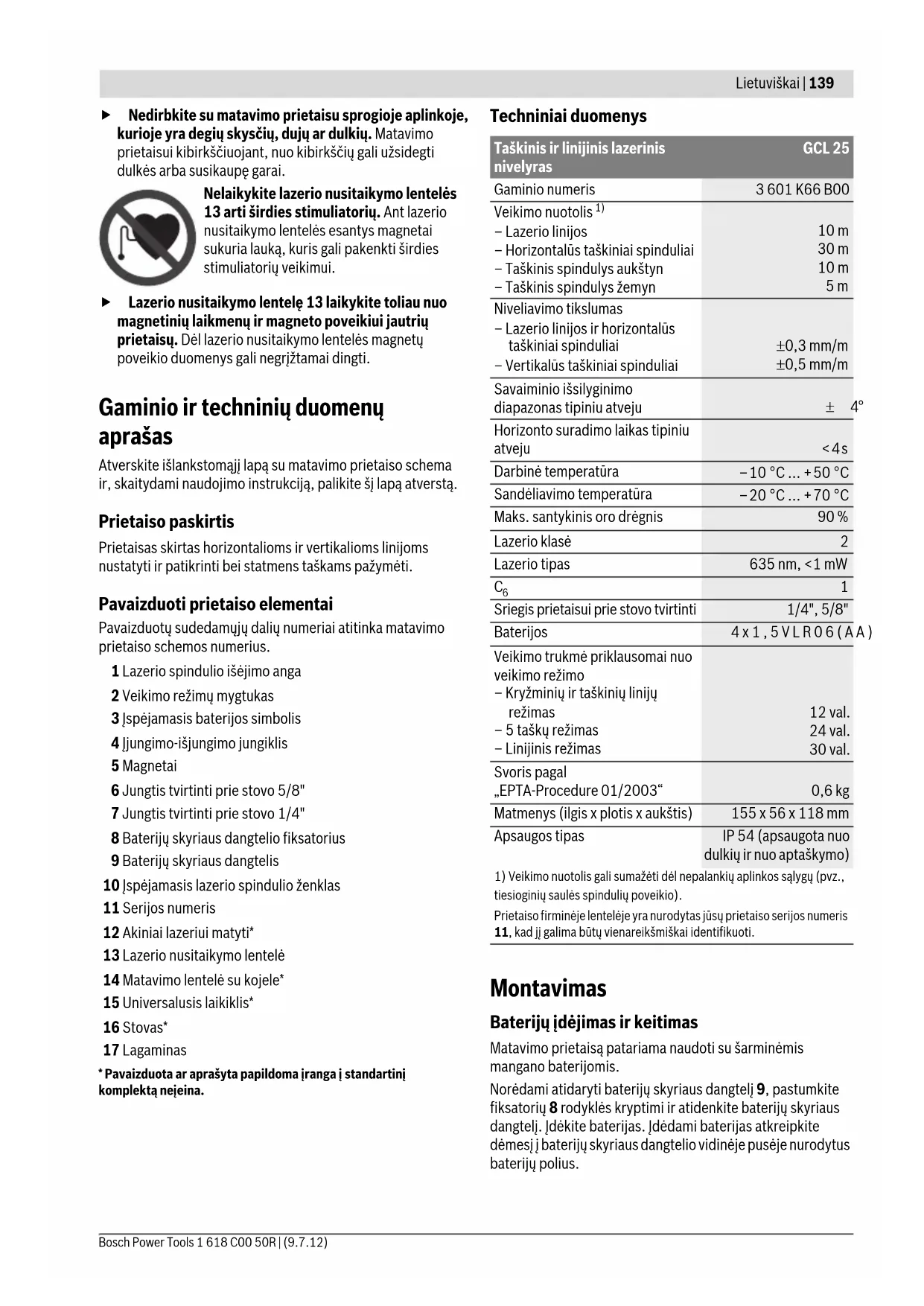- Pavaizduota ar aprašyta papildoma įranga į standartinį komplektą neįeina. Techniniai duomenys Montavimas Baterijų įdėjimas ir keitimas Matavimo prietaisą patariama naudoti su šarminėmis mangano baterijomis. Norėdami atidaryti baterijų skyriaus dangtelį 9, pastumkite fiksatorių 8 rodyklės kryptimi ir atidenkite baterijų skyriaus dangtelį. Įdėkite baterijas. Įdėdami baterijas atkreipkite dėmesį į baterijų skyriaus dangtelio vidinėje pusėje nurodytus baterijų polius. Taškinis ir linijinis lazerinis nivelyras GCL 25 Gaminio numeris 3 601 K66 B00 Veikimo nuotolis