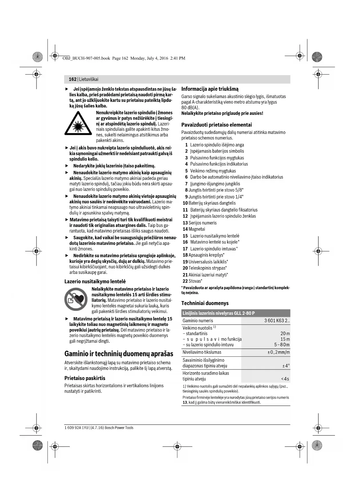 tiesioginių saulės spindulių poveikio). Prietaiso firminėje lentelėje yra nurodytas jūsų prietaiso serijos numeris 13, kad jį galima būtų vienareikšmiškai identifikuoti. OBJ_BUCH-907-005.book Page 162 Monday, July 4, 2016 2:41 PMLietuviškai | 163 Bosch Power Tools 1 609 92A 1YU | (4.7.16) Montavimas Baterijų įdėjimas ir keitimas Matavimo prietaisą patariama naudoti su šarminėmis manga- no baterijomis. Norėdami atidaryti baterijų skyriaus dangtelį 10, pastumkite fiksatorių 11 rodyklės kryptimi ir atidenkite baterijų skyriaus dangtelį. Įdėkite baterijas. Įdėdami baterijas atkreipkite dė- mesį į baterijų skyriaus dangtelio vidinėje pusėje nurodytus baterijų polius. Baterijoms beveik išsikrovus, vieną kartą pasigirsta apie 5 s trukmės garsinis signalas. Įspėjamasis baterijos simbolis 2 nuolat mirksi raudonai. Matavimo prietaisą dar galima naudoti ne ilgiau kaip 2 h. Jei įjungiant matavim o prietaisą baterijos yra beveik išsikro- vusios, 5 s trukmės garsinis signalas pasigirsta iškart, kai tik įjungiamas matavimo prietaisas. Visada kartu pakeiskite visas baterijas. Naudokite tik vieno gamintojo ir vienodos talpos baterijas. Jei ilgą laiką nenaudojate prietaiso, išimkite iš jo bate- rijas. Ilgiau sandėliuojant prietaisą, baterijas gali paveikti korozija arba jos gali išsikrauti. Naudojimas Parengimas naudoti Matavimo prietaisui veikiant, esant tam tikroms sąly- goms, siunčiami stiprūs garsiniai signalai Todėl matavi- mo prietaisą laikykite toliau nuo savo ir kitų žmonių klausos organų. Garsus signalas gali pakenkti klausai. Saugokite matavimo prietaisą nuo drėgmės ir tiesiogi- nio saulės spindulių poveikio. Saugokite matavimo prietaisą nuo ypač aukštos ir že- mos temperatūros bei temperatūros svyravimų. Pvz., nepalikite jo ilgesnį laiką automobilyje. Esant didesniems temperatūros svyravimams, prieš pradėdami prietaisą naudoti, palaukite, kol matavimo prietaiso temperatūra stabilizuosis. Esant ypač aukštai ir žemai temperatūrai ar- ba temperatūros svyravimams, gali būti pakenkiama mata- vimo prietaiso tikslumui. Saugokite, kad prietaisas nenukristų ir nebūtų sutren- kiamas. Pažeidus prietaisą gali būti pakenkiama tikslumui. Prietaisui nukritus arba jį sutrenkus, patikrinkite lazerio lini- jas ir vertikalius lazerio spindulius su žinoma horizontalia ar vertikalia atskaitos linija arba patikrintais statmens taškais. Jei matavimo prietaisą norite transportuoti, jį išjunki- te. Prietaisą išjungus švytavi mo mazgas užblokuojamas, nes prietaisui labai judant neužblokuotas mazgas gali būti pažeidžiamas. Įjungimas ir išjungimas Norėdami įjungti matavimo prietaisą, pastumkite įjungimo- išjungimo jungiklį 7 į padėtį „on“ (darbams be automatinio niveliavimo įtaiso) arba į padėtį „on“ (darbams su automa- tinio niveliavimo įtaisu). Matavimo prietaisą įjungus per lazerio spindulio išėjimo angas 1 tuoj pat siunčiamos lazerio linijos. Nenukreipkite lazerio spindulio į kitus asmenis ar gyvū- nus ir nežiūrėkite į lazerio spindulį patys, net ir būdami atokiau nuo prietaiso. Nepalikite įjungto matavimo prietaiso be priežiūros, o baigę su prietaisu dirbti, jį išjunkite. Lazerio spindulys gali apakinti kitus žmones. Nor ėdami matavimo prietaisą išjungti, įjungimo-išjungimo jungiklį 7 pastumkite į padėtį „off“. Prietaisą išjungus švytavi- mo mazgas užblokuojamas. Jei viršijama aukščiausia leistina 45 °C darbinė temperatūra, lazerio spindulys išsijungia automatiškai, kad apsaugotų laze- rio diodą. Kai prietaisas atvėsta, jis vėl yra parengties būseno- je ir jį vėl galima įjungti. Automatinio išjungimo įtaiso deaktyvavimas Jei apytikriai per 30 min. nepaspaudžiamas joks mygtukas, kad būtų taupomos baterijos, matavimo prietaisas automatiš- kai išsijungia. Norėdami po automatinio išjungimo matavim o prietaisą vėl įjungti, galite arba pastumti įjungimo-išjungimo jungiklį 7 į pa- dėtį „off“ ir matavimo prietaisą vėl įjungti, arba vieną kartą paspausti veikimo režimų mygtuką 5 arba pulsavimo funkcijos mygtuką 3. Norėdami deaktyvinti automatinio išjungimo įtaisą, veikimo režimų mygtuką (esant įjungtam matavimo prietaisui) 5 laiky- kite paspaudę ne mažiau kaip 3 s. Kai automatinio išjungimo Darbinė temperatūra –10 °C ... +45 °C Sandėliavimo temperatūra –20 °C ... +70 °C Maks. santykinis oro drėgnis 90 % Lazerio klasė