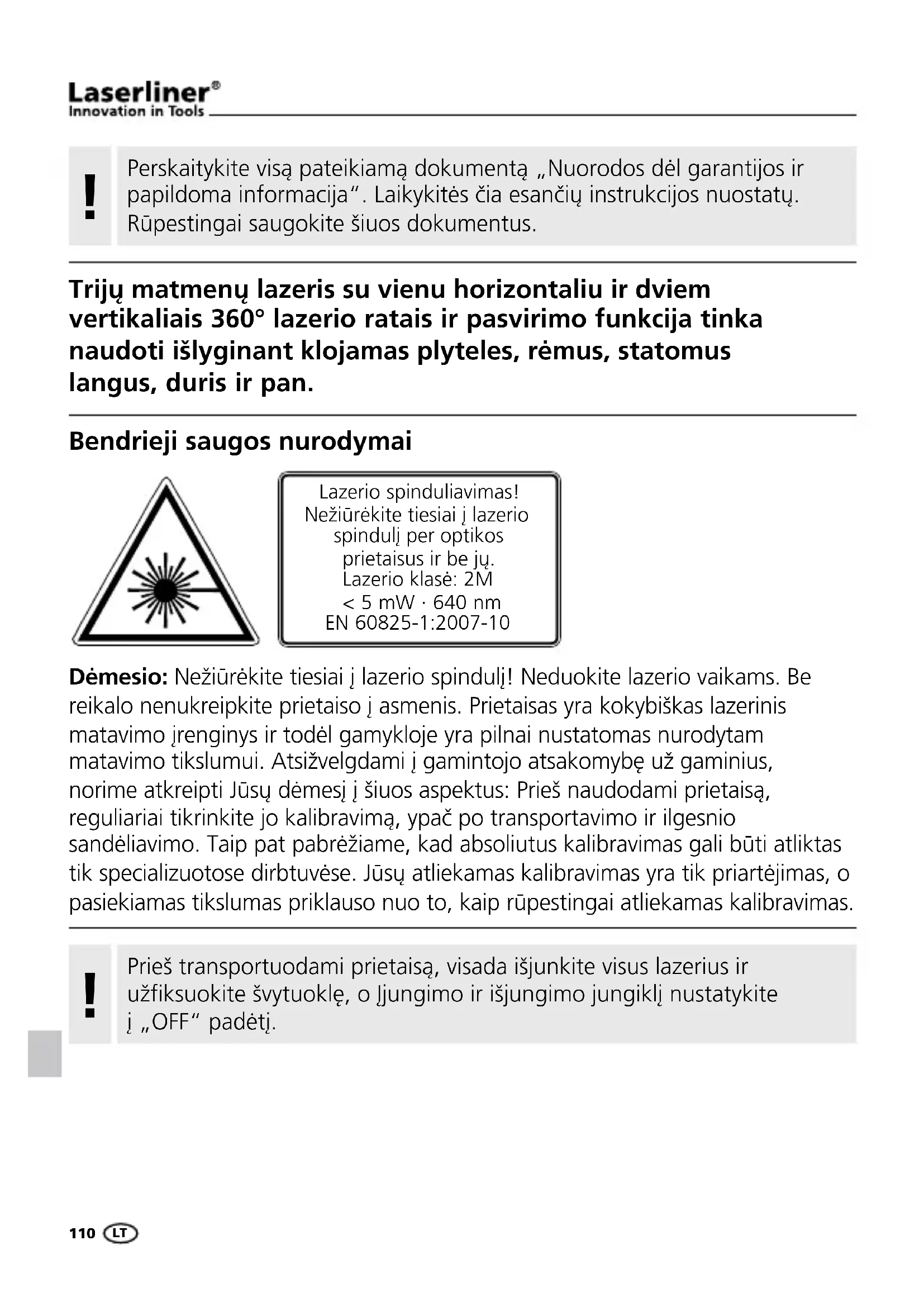 Bendrieji saugos nurodymai Dėmesio: Nežiūrėkite tiesiai į lazerio spindulį! Neduokite lazerio vaikams. Be reikalo nenukreipkite prietaiso į asmenis. Prietaisas yra kokybiškas lazerinis matavimo įrenginys ir todėl gamykloje yra pilnai nustatomas nurodytam matavimo tikslumui. Atsižvelgdami į gamintojo atsakomybę už gaminius, norime atkreipti Jūsų dėmesį į šiuos aspektus: Prieš naudodami prietaisą, reguliariai tikrinkite jo kalibravimą, ypač po transportavimo ir ilgesnio sandėliavimo. Taip pat pabrėžiame, kad absoliutus kalibravimas gali būti atliktas tik specializuotose dirbtuvėse. Jūsų atliekamas kalibravimas yra tik priartėjimas, o pasiekiamas tikslumas priklauso nuo to, kaip rūpestingai atliekamas kalibravimas. Lazerio spinduliavimas! Nežiūrėkite tiesiai į lazerio spindulį per optikos prietaisus ir be jų. Lazerio klasė: 2M < 5 mW · 640 nm EN 60825-1:2007-10 Prieš transportuodami prietaisą, visada išjunkite visus lazerius ir užfiksuokite švytuoklę, o Įjungimo ir išjungimo jungiklį nustatykite į „OFF“ padėtį.