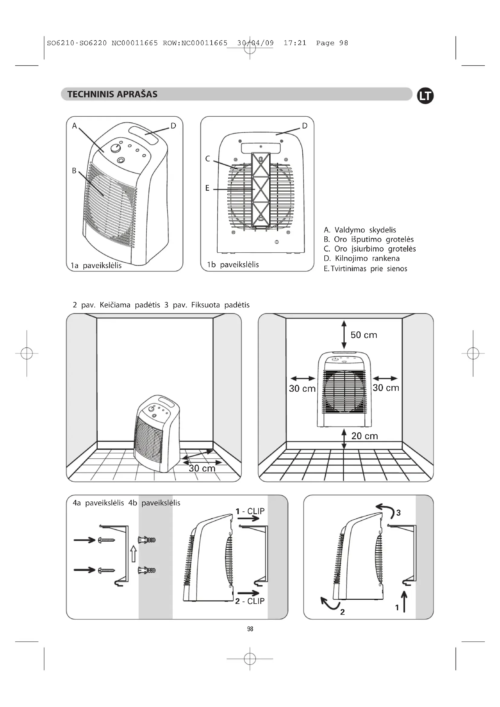 Šis aparatas gaIi būti naudojamas tik pritvirtintinus jį prie vertikalios sienos tinkamoje padėtyje ir išlaikant minima- lius atstumus, kurie pavaizduoti 3 paveikslėlyje. Būtinai pritvirtinkite aparatą prie sienos pasinaudodami tvirtinimu prie sienos (E), kuris yra pridedamas. Surinkimas: žiūrėti 4a paveikslėlį