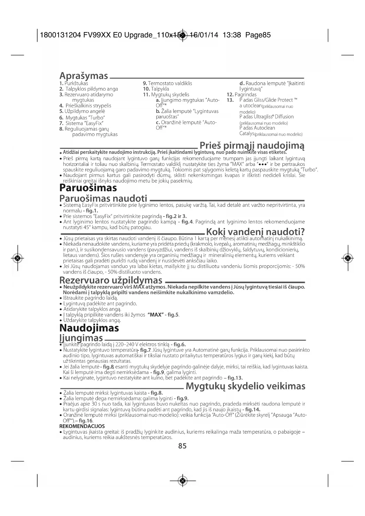 - Norint vėl įjungti lygintuvą, užtenka paspausti mygtukų skydelyje esantį mygtuką ”RESTART“ – fig.16. Priežiūra ir valymas Prieškalkinio strypelio valymas (vieną kartą per mėnesį)