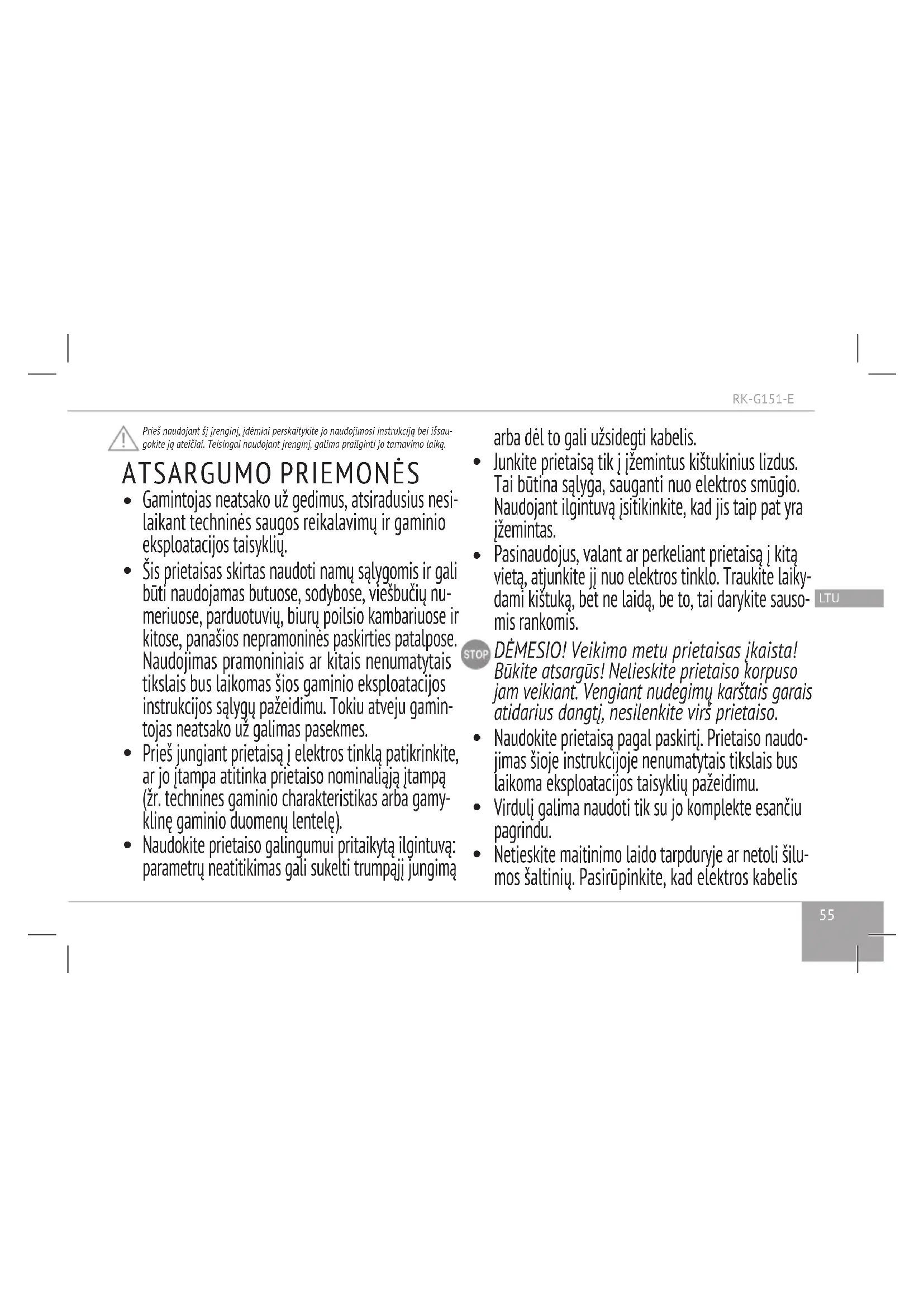 Šiam gaminiui teikiama 2 metai garantija nuo pirkimo datos. Garantiniu laikotaroiu gamin- tojas įsipareigoja taisymo, detalių keitimo arba viso gaminio keitimo būdu pašalinti bet kokius gamybos defektus, atsiradusius dėl nepakankamos medžiagų ar surinkimo kokybės. Garan- tija įsigalioja tik tuo atveju, jeigu pirkimo data patvirtinta parduotuvės antspaudu ir parda- vėjo parašu originaliame garantojos talone. Ši garantija pripažįstama tik tuo atveju, jeigu gaminys buvo naudojamas pagal eksploatavimo instrukciją, nebuvo remontuotas, išardytas ir nebuvo pažeistas dėl netinkamo naudojimo, taip patišsaugotas pilnas gaminio komplektas. Ši garantija netaikoma natūraliam gaminio susidėvėjimui ir naudojamoms medžiagoms (ltrams, lemputėms, keraminėms ir teoninėms dangoms, sandarinimo gumoms ir kt.). Gaminio veikimo trukmė ir garantinių įsipareigojimų terminas skaičiuojami nuo parda- vimo dienos arba nuo gaminio pagaminimo datos (tuo atveju, kai pardavimo datos negalima nustatyti). Prietaiso pagaminimo datą rasite serijos numeryje, kuris nurodytas identikaciniame lipduke ant gaminio korpuso. Serijos numeris yra iš 13 ženklų. 6-asis ir 7-asis ženklas reiškia mėnesį, 8-asis – įrenginio pagaminimo metus. Nustatytas gaminio eksploatavimo terminas yra 3 metai nuo jo įsigijimo datos su sąly- ga, kad gaminys eksploatuojamas vadovaujantis šia instrukcija ir techniniais standartais. Ekologiškai nekenksminga utilizacija (elektroninės ir elektros įrangos utilizacija) Pakuotė, naudojimosi instrukcija ir pats prietaisas utilizuojami laikantis ati- tinkamų vietos antrinių žaliavų perdirbimo programų. Pasirūpinkite aplinko- sauga: neišmeskite tokių gaminių kartu su įprastinėmis buitinėmis atliekomis. Negalima išmesti panaudotos (senos) įrangos kartu su buitinėmis atliekomis. Juos reikia išmesti atskirai. Senos įrangos savininkai privalo atnešti nebe- naudojamus prietaisus į specialius surinkimo punktus arba priduoti atitinkamoms or- ganizacijoms. Tokiu būdu jūs prisidėsite prie vertingos žaliavos perdirbimo ir valymo nuo kenksmingų medžiagų programos. Šis prietaisas pažymėtas pagal Europos direktyvos 2012/19/ES, reguliuojančios elektros ir elektronikos įrangos utilizavimą, reikalavimus. Ši direktyva nustato pagrindinius elektros ir elektronikos prietaisų atliekų utilizacijos ir perdirbimo reikalavimus, galiojančius visoje Europos Sąjungos teritorijoje.RK-G151-E