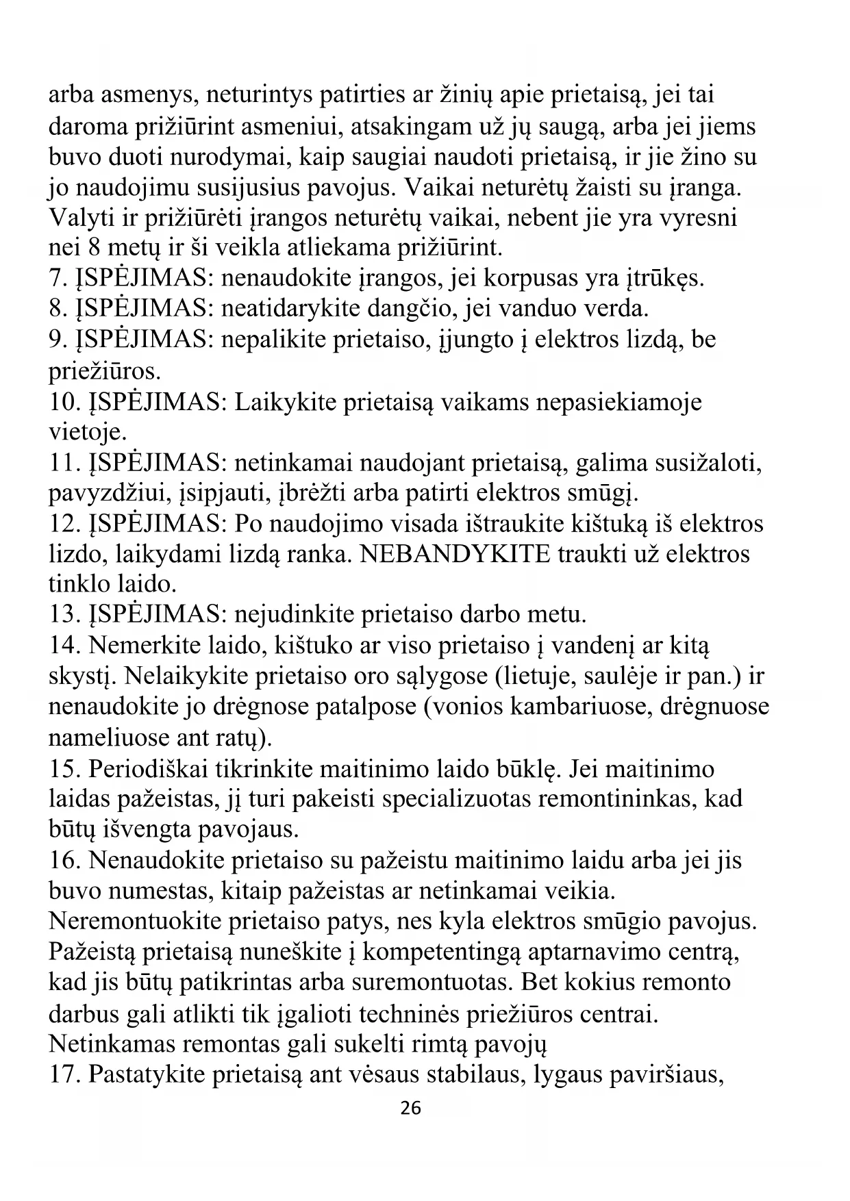 9. ĮSPĖJIMAS: nepalikite prietaiso, įjungto į elektros lizdą, be