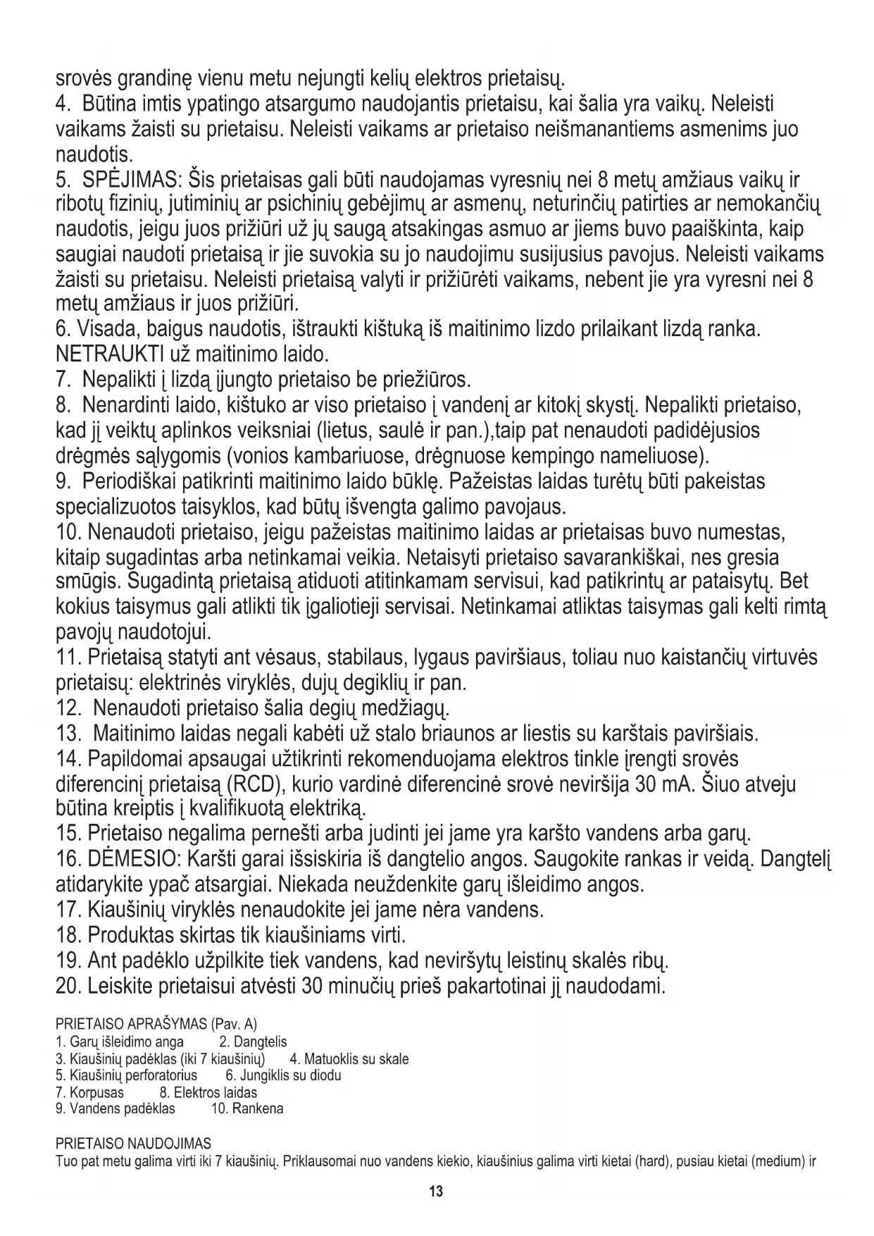 15. Prietaiso negalima pernešti arba judinti jei jame yra karšto vandens arba garų.