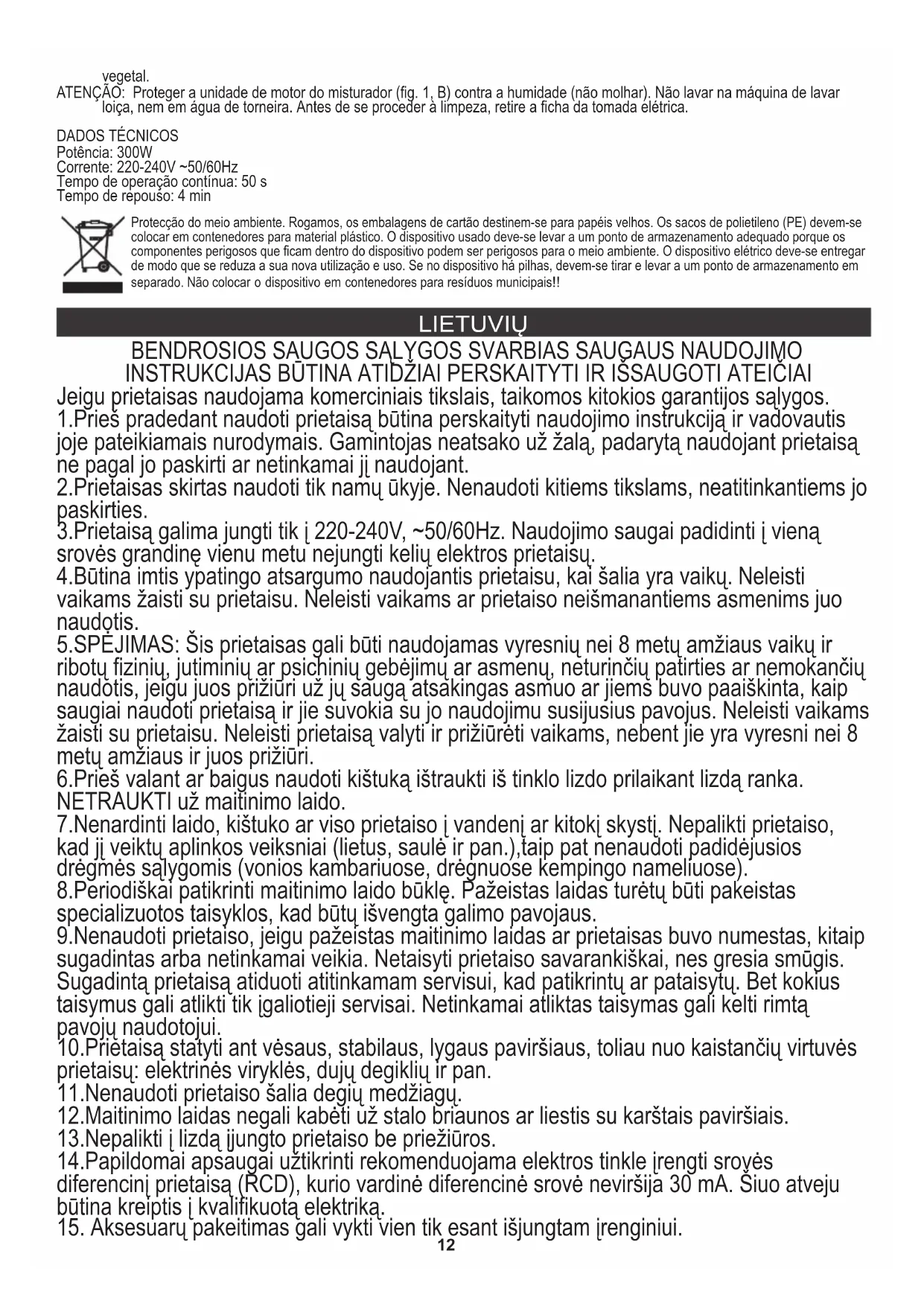 4. Certos legumes, p.ex. cenoura, podem deixar manchas coloridas no aparelho. Para removê-las, usar um pano embebido num óleo O misturador manual serve para preparar sopas, molhos, alimentos de bebés, assim como para misturar bebidas e coquetéis. 2. Enfiar o acessório profundamente num recipiente enchido com produtos para misturar e ligar o misturador premindo o botão (fig. 1, A1 ou A2). 11LIETUVIŲ BENDROSIOS SAUGOS SĄLYGOS SVARBIAS SAUGAUS NAUDOJIMO INSTRUKCIJAS BŪTINA ATIDŽIAI PERSKAITYTI IR IŠSAUGOTI ATEIČIAI Jeigu prietaisas naudojama komerciniais tikslais, taikomos kitokios garantijos sąlygos. 1.Prieš pradedant naudoti prietaisą būtina perskaityti naudojimo instrukciją ir vadovautis joje pateikiamais nurodymais. Gamintojas neatsako už žalą, padarytą naudojant prietaisą ne pagal jo paskirti ar netinkamai jį naudojant. 2.Prietaisas skirtas naudoti tik namų ūkyje. Nenaudoti kitiems tikslams, neatitinkantiems jo paskirties. 3.Prietaisą galima jungti tik į 220-240V, ~50/60Hz. Naudojimo saugai padidinti į vieną srovės grandinę vienu metu nejungti kelių elektros prietaisų. 9.Nenaudoti prietaiso, jeigu pažeistas maitinimo laidas ar prietaisas buvo numestas, kitaip sugadintas arba netinkamai veikia. Netaisyti prietaiso savarankiškai, nes gresia smūgis. Sugadintą prietaisą atiduoti atitinkamam servisui, kad patikrintų ar pataisytų. Bet kokius taisymus gali atlikti tik įgaliotieji servisai. Netinkamai atliktas taisymas gali kelti rimtą pavojų naudotojui. 6.Prieš valant ar baigus naudoti kištuką ištraukti iš tinklo lizdo prilaikant lizdą ranka. NETRAUKTI už maitinimo laido. 8.Periodiškai patikrinti maitinimo laido būklę. Pažeistas laidas turėtų būti pakeistas specializuotos taisyklos, kad būtų išvengta galimo pavojaus. 7.Nenardinti laido, kištuko ar viso prietaiso į vandenį ar kitokį skystį. Nepalikti prietaiso, kad jį veiktų aplinkos veiksniai (lietus, saulė ir pan.),taip pat nenaudoti padidėjusios drėgmės sąlygomis (vonios kambariuose, drėgnuose kempingo nameliuose). 4.Būtina imtis ypatingo atsargumo naudojantis prietaisu, kai šalia yra vaikų. Neleisti vaikams žaisti su prietaisu. Neleisti vaikams ar prietaiso neišmanantiems asmenims juo naudotis. 5.SPĖJIMAS: Šis prietaisas gali būti naudojamas vyresnių nei 8 metų amžiaus vaikų ir ribotų fizinių, jutiminių ar psichinių gebėjimų ar asmenų, neturinčių patirties ar nemokančių naudotis, jeigu juos prižiūri už jų saugą atsakingas asmuo ar jiems buvo paaiškinta, kaip saugiai naudoti prietaisą ir jie suvokia su jo naudojimu susijusius pavojus. Neleisti vaikams žaisti su prietaisu. Neleisti prietaisą valyti ir prižiūrėti vaikams, nebent jie yra vyresni nei 8 metų amžiaus ir juos prižiūri. 13.Nepalikti į lizdą įjungto prietaiso be priežiūros. 14.Papildomai apsaugai užtikrinti rekomenduojama elektros tinkle įrengti srovės diferencinį prietaisą (RCD), kurio vardinė diferencinė srovė neviršija 30 mA. Šiuo atveju būtina kreiptis į kvalifikuotą elektriką. 11.Nenaudoti prietaiso šalia degių medžiagų.