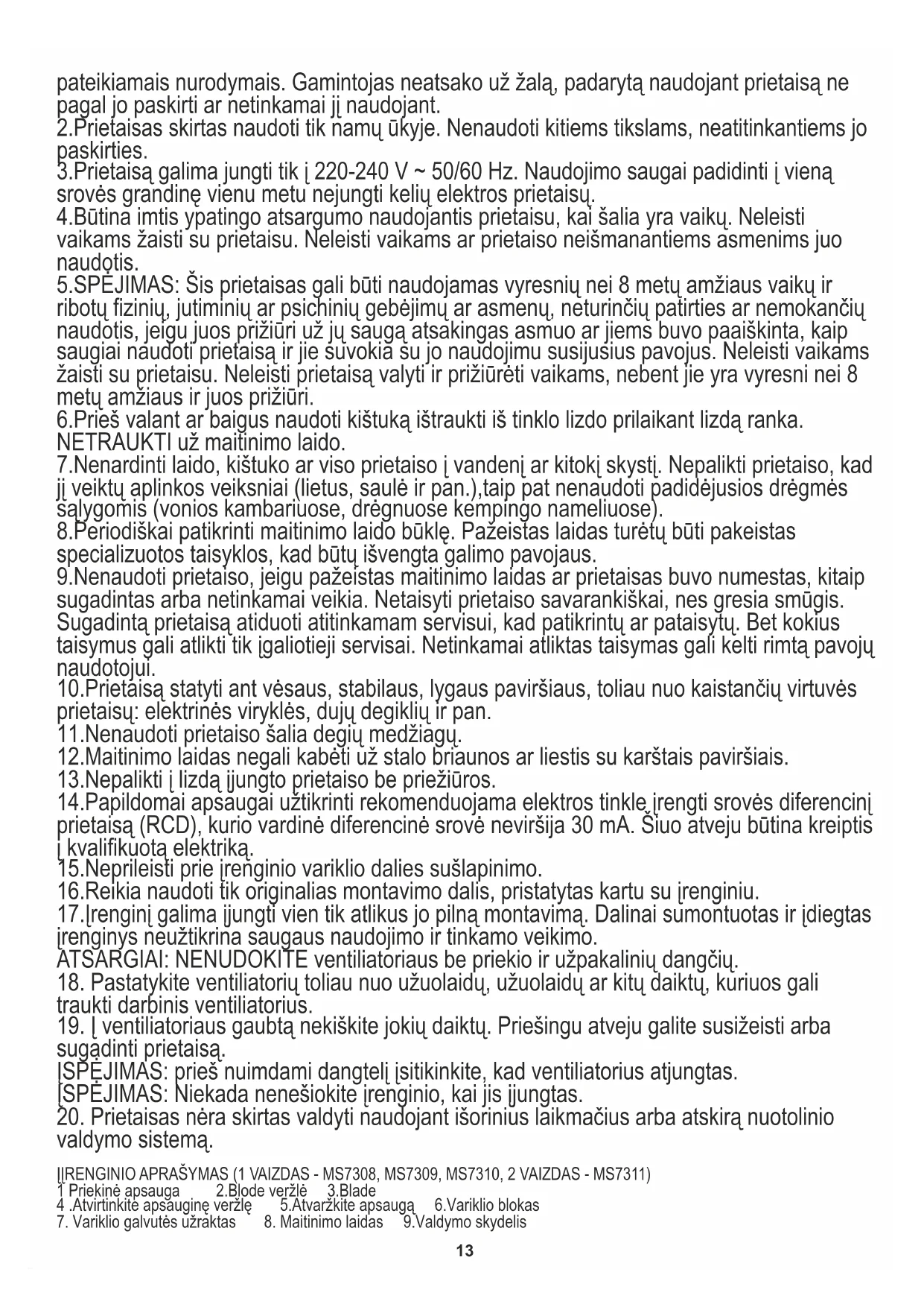 Dados técnicos: Número do item / diâmetro / potência / potência máxima: tensão MS7308 / 23 cm / 22W / 45W / 220-240V ~ 50 / 60Hz MS7309 / 30 cm / 35W / 70W / 220-240V ~ 50 / 60Hz MS7310 / 40 cm / 45W / 90W / 220-240V ~ 50 / 60Hz MS7311 / 40 cm / 45W / 90W / 220-240V ~ 50 / 60Hz Protecção do meio ambiente. Rogamos, os embalagens de cartão destinem-se para papéis velhos. Os sacos de polietileno (PE) devem-se colocar em contenedores para material plástico. O dispositivo usado deve-se levar a um ponto de armazenamento adequado porque os componentes perigosos que ficam dentro do dispositivo podem ser perigosos para o meio ambiente. O dispositivo elétrico deve-se entregar de modo que se reduza a sua nova utilização e uso. Se no dispositivo há pilhas, devem-se tirar e levar a um ponto de armazenamento em separado. Não colocarodispositivoemcontenedores para resíduos municipais LIETUVIŲ BENDROSIOS SAUGOS SĄLYGOS SVARBIAS SAUGAUS NAUDOJIMO INSTRUKCIJAS BŪTINA ATIDŽIAI PERSKAITYTI IR IŠSAUGOTI ATEIČIAI Jeigu prietaisas naudojama komerciniais tikslais, taikomos kitokios garantijos sąlygos. 1.Prieš pradedant naudoti prietaisą būtina perskaityti naudojimo instrukciją ir vadovautis joje13 pateikiamais nurodymais. Gamintojas neatsako už žalą, padarytą naudojant prietaisą ne pagal jo paskirti ar netinkamai jį naudojant. 2.Prietaisas skirtas naudoti tik namų ūkyje. Nenaudoti kitiems tikslams, neatitinkantiems jo paskirties. 3.Prietaisą galima jungti tik į 220-240 V ~ 50/60 Hz. Naudojimo saugai padidinti į vieną srovės grandinę vienu metu nejungti kelių elektros prietaisų. 4.Būtina imtis ypatingo atsargumo naudojantis prietaisu, kai šalia yra vaikų. Neleisti vaikams žaisti su prietaisu. Neleisti vaikams ar prietaiso neišmanantiems asmenims juo naudotis. 5.SPĖJIMAS: Šis prietaisas gali būti naudojamas vyresnių nei 8 metų amžiaus vaikų ir ribotų fizinių, jutiminių ar psichinių gebėjimų ar asmenų, neturinčių patirties ar nemokančių naudotis, jeigu juos prižiūri už jų saugą atsakingas asmuo ar jiems buvo paaiškinta, kaip saugiai naudoti prietaisą ir jie suvokia su jo naudojimu susijusius pavojus. Neleisti vaikams žaisti su prietaisu. Neleisti prietaisą valyti ir prižiūrėti vaikams, nebent jie yra vyresni nei 8 metų amžiaus ir juos prižiūri. 6.Prieš valant ar baigus naudoti kištuką ištraukti iš tinklo lizdo prilaikant lizdą ranka. NETRAUKTI už maitinimo laido. 7.Nenardinti laido, kištuko ar viso prietaiso į vandenį ar kitokį skystį. Nepalikti prietaiso, kad jį veiktų aplinkos veiksniai (lietus, saulė ir pan.),taip pat nenaudoti padidėjusios drėgmės sąlygomis (vonios kambariuose, drėgnuose kempingo nameliuose). 8.Periodiškai patikrinti maitinimo laido būklę. Pažeistas laidas turėtų būti pakeistas specializuotos taisyklos, kad būtų išvengta galimo pavojaus. 9.Nenaudoti prietaiso, jeigu pažeistas maitinimo laidas ar prietaisas buvo numestas, kitaip sugadintas arba netinkamai veikia. Netaisyti prietaiso savarankiškai, nes gresia smūgis. Sugadintą prietaisą atiduoti atitinkamam servisui, kad patikrintų ar pataisytų. Bet kokius taisymus gali atlikti tik įgaliotieji servisai. Netinkamai atliktas taisymas gali kelti rimtą pavojų naudotojui. 10.Prietaisą statyti ant vėsaus, stabilaus, lygaus paviršiaus, toliau nuo kaistančių virtuvės prietaisų: elektrinės viryklės, dujų degiklių ir pan. 11.Nenaudoti prietaiso šalia degių medžiagų. 12.Maitinimo laidas negali kabėti už stalo briaunos ar liestis su karštais paviršiais. 13.Nepalikti į lizdą įjungto prietaiso be priežiūros. 14.Papildomai apsaugai užtikrinti rekomenduojama elektros tinkle įrengti srovės diferencinį prietaisą (RCD), kurio vardinė diferencinė srovė neviršija 30 mA. Šiuo atveju būtina kreiptis į kvalifikuotą elektriką. 15.Neprileisti prie įrenginio variklio dalies sušlapinimo. 16.Reikia naudoti tik originalias montavimo dalis, pristatytas kartu su įrenginiu. 17.Įrenginį galima įjungti vien tik atlikus jo pilną montavimą. Dalinai sumontuotas ir įdiegtas įrenginys neužtikrina saugaus naudojimo ir tinkamo veikimo. ATSARGIAI: NENUDOKITE ventiliatoriaus be priekio ir užpakalinių dangčių.