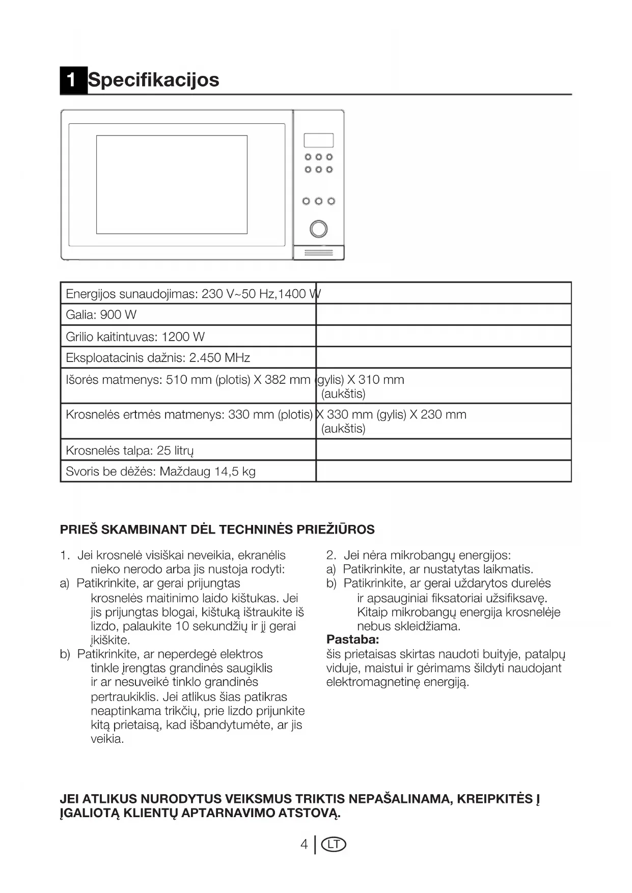 Energijos sunaudojimas: 230 V~50 Hz,1400 W Galia: 900 W Grilio kaitintuvas: 1200 W Eksploatacinis dažnis: 2.450 MHz Išorės matmenys: 510 mm (plotis) X 382 mm (gylis) X 310 mm (aukštis) Krosnelės ertmės matmenys: 330 mm (plotis) X 330 mm (gylis) X 230 mm (aukštis) Krosnelės talpa: 25 litrų Svoris be dėžės: Maždaug 14,5 kg 1 Specifikacijos