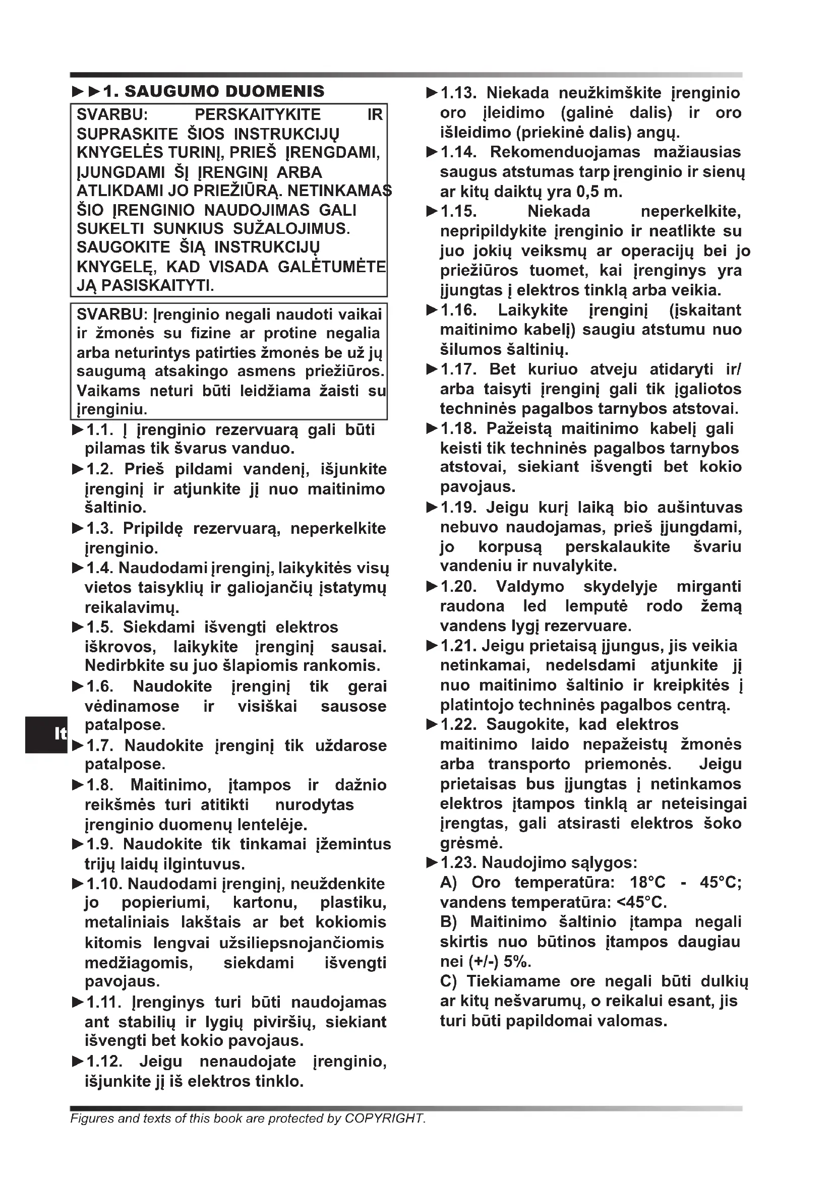 JĄ PASISKAITYTI. SVARBU: Įrenginio negali naudoti vaikai ir žmonės su zine ar protine negalia arba neturintys patirties žmonės be už jų saugumą atsakingo asmens priežiūros. Vaikams neturi būti leidžiama žaisti su įrenginiu. ►1.1. Į įrenginio rezervuarą gali būti pilamas tik švarus vanduo. ►1.2. Prieš pildami vandenį, išjunkite įrenginį ir atjunkite jį nuo maitinimo šaltinio. ►1.3. Pripildę rezervuarą, neperkelkite įrenginio. ►1.4. Naudodami įrenginį, laikykitės visų vietos taisyklių ir galiojančių įstatymų reikalavimų. ►1.5. Siekdami išvengti elektros iškrovos, laikykite įrenginį sausai. Nedirbkite su juo šlapiomis rankomis. ►1.6. Naudokite įrenginį tik gerai vėdinamose ir visiškai sausose patalpose. ►1.7. Naudokite įrenginį tik uždarose patalpose. ►1.8. Maitinimo, įtampos ir dažnio reikšmės turi atitikti nurodytas įrenginio duomenų lentelėje. ►1.9. Naudokite tik tinkamai įžemintus trijų laidų ilgintuvus. ►1.10. Naudodami įrenginį, neuždenkite jo popieriumi, kartonu, plastiku, metaliniais lakštais ar bet kokiomis kitomis lengvai užsiliepsnojančiomis medžiagomis, siekdami išvengti pavojaus. ►1.11. Įrenginys turi būti naudojamas ant stabilių ir lygių piviršių, siekiant išvengti bet kokio pavojaus. ►1.12. Jeigu nenaudojate įrenginio, išjunkite jį iš elektros tinklo. ►1.13. Niekada neužkimškite įrenginio oro įleidimo (galinė dalis) ir oro išleidimo (priekinė dalis) angų. ►1.14. Rekomenduojamas mažiausias saugus atstumas tarp įrenginio ir sienų ar kitų daiktų yra 0,5 m. ►1.15. Niekada neperkelkite, nepripildykite įrenginio ir neatlikte su juo jokių veiksmų ar operacijų bei jo priežiūros tuomet, kai įrenginys yra įjungtas į elektros tinklą arba veikia. ►1.16. Laikykite įrenginį (įskaitant maitinimo kabelį) saugiu atstumu nuo šilumos šaltinių. ►1.17. Bet kuriuo atveju atidaryti ir/ arba taisyti įrenginį gali tik įgaliotos techninės pagalbos tarnybos atstovai. ►1.18. Pažeistą maitinimo kabelį gali keisti tik techninės pagalbos tarnybos atstovai, siekiant išvengti bet kokio pavojaus. ►1.19. Jeigu kurį laiką bio aušintuvas nebuvo naudojamas, prieš įjungdami, jo korpusą perskalaukite švariu vandeniu ir nuvalykite. ►1.20. Valdymo skydelyje mirganti raudona led lemputė rodo žemą vandens lygį rezervuare. ►1.21. Jeigu prietaisą įjungus, jis veikia netinkamai, nedelsdami atjunkite jį nuo maitinimo šaltinio ir kreipkitės į platintojo techninės pagalbos centrą. ►1.22. Saugokite, kad elektros maitinimo laido nepažeistų žmonės arba transporto priemonės. Jeigu prietaisas bus įjungtas į netinkamos elektros įtampos tinklą ar neteisingai įrengtas, gali atsirasti elektros šoko grėsmė. ►1.23. Naudojimo sąlygos: A) Oro temperatūra: 18°C - 45°C; vandens temperatūra: <45°C. B) Maitinimo šaltinio įtampa negali skirtis nuo būtinos įtampos daugiau nei (+/-) 5%. C) Tiekiamame ore negali būti dulkių ar kitų nešvarumų, o reikalui esant, jis turi būti papildomai valomas. Figures and texts of this book are protected by COPYRIGHT.lt ►►2. IŠPAKAVIMAS ►2.1. Išimkite iš pakuotės visas pakavimo medžiagas, jos turi būti tvarkomos vadovaujantis galiojančių įstatymų nuostatomis. ►2.2. Išimkite iš pakuotės visas sudedamąsias dalis. ►2.3. Patikrinkite, ar nėra pažeidimų, atsiradusių transportuojant įrenginį. Jeigu įrenginys pažeistas, nedelsdami praneškite apie tai įrenginį pardavusiam pardavėjui. ►►3. MONTAVIMAS Įrenginyje yra ratukai, užtikrinantys patogesnį jo perkėlimą. Priklausomai nuo modelio, ratukai gali būti jau įmontuoti įrenginyje arba juos reikės įmontuoti. Įrenginio sudedamosios dalys ir atitinkamų tvirtinamųjų elementų rinkiniai yra pakuotės viduje (1 Pav.). ►►4. VEIKIMAS ĮSPĖJIMAS: Prieš įjungdami įrenginį, atidžiai perskaitykite ”SAUGUMO DUOMENIS”. ĮSPĖJIMAS: Siekiant išvengti gedimų ir kitų trikčių, turi būti naudojamas tik švarus vanduo. ĮSPĖJIMAS: Įsitikinkite, kad Jūsų elektros įranga yra įžeminta tinkamai. Prijungimas prie elektros tinklo atliekamas, vadovaujantis šalyje galiojančių įstatymų nuostatomis. Maitinimo, įtampos ir dažnio reikšmės turi atitikti nurodytas įrenginio duomenų lentelėje. PASTABA: Šiuos modelius galima prijungti prie vandentiekio, prijungiant vamzdį prie jungiančiojo elemento (10 Pav.). ►►4.1. ĮJUNGIMAS: ►4.1.1. Atidarykite rezervuaro dureles (2 Pav.). ►4.1.2. Įpilkyte į rezervuarą vandens (3 Pav.), vandens lygis turi būti tarp įrenginio šone esančios skalės padalų MIN ir MAX (4 Pav.), siekiant išvengti pavojaus. ►4.1.3. Uždarykite rezervuaro dureles (5 Pav.). ►4.1.4. Įjunkite maitinimo laido kištuką į elektros lizdą (6 Pav.). ►4.1.5. Paspauskite mygtuką ON/OFF, norėdami įjungti įrenginį (9 Pav.).