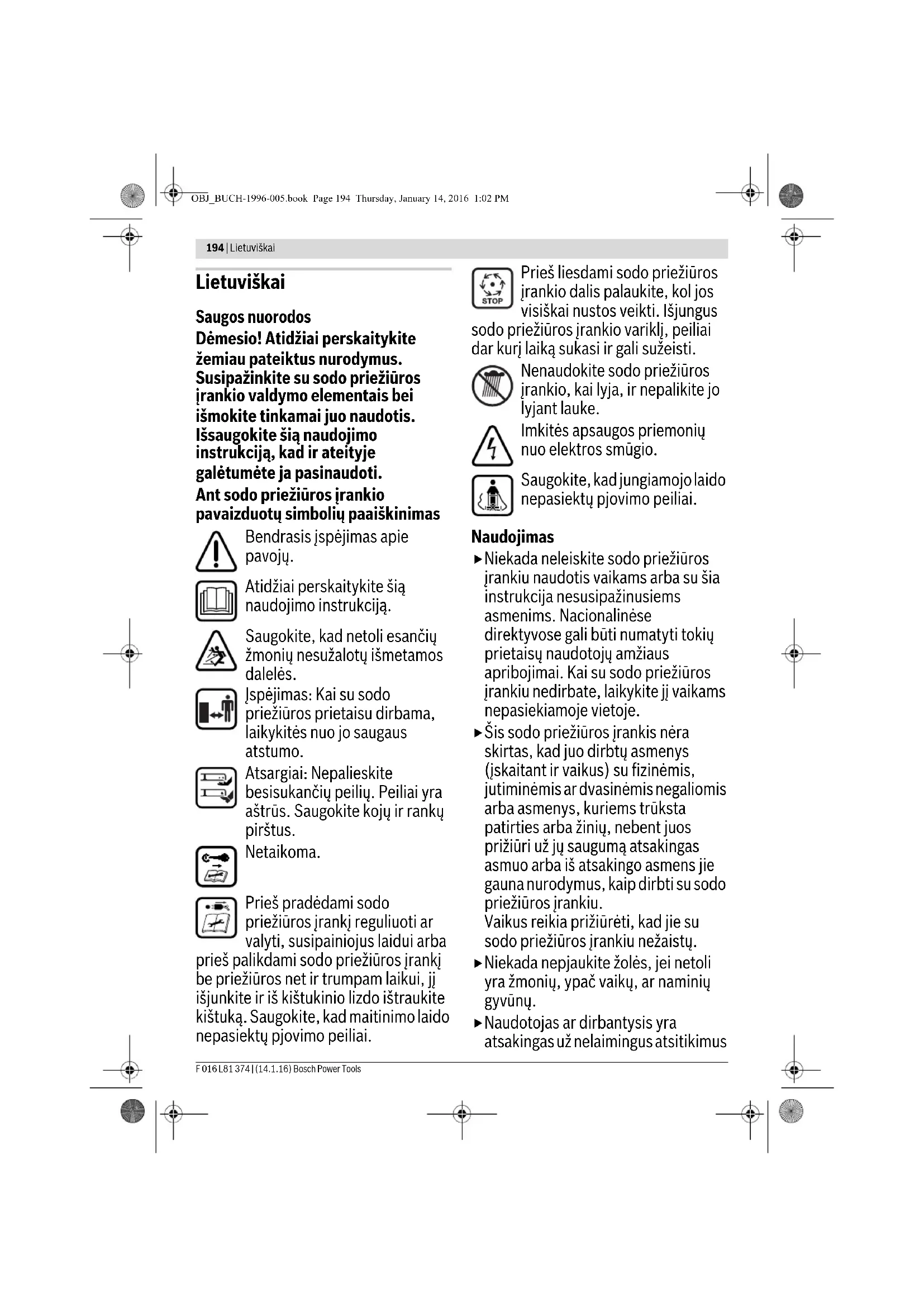 Ir nostrādājusi dzinēja aizsardzība Ļaujiet dzinējam atdzist un palieliniet appļaušanas augstumu Dārza instruments veic appļaušanu nelīdzeni un/vai Dzinējs darbojas ar grūtībām Appļaušanas augstums ir pārāk mazs Palieliniet appļaušanas augstumu Asmeņi ir kļuvuši neasi Nomainiet asmeni Iespējams nosprostojums Pārbaudiet telpu zem dārza instrumenta un vajadzības gadījumā atbrīvojiet asmeni (vienmēr uzvelciet dārznieka aizsargcimdus) Asmens ir nepareizi iestiprināts Iestipriniet asmeni pareizi Pēc dārza instrumenta ieslēgšanas tā asmens negriežas Asmens ir iestrēdzis zālē Izslēdziet dārza instrumentu Izbrīvējiet asmeņus (vienm ēr uzvelciet dārznieka aizsargcimdus) Ir vaļīgs asmens stiprinājuma uzgrieznis/skrūve Pievelciet asmens stiprinājuma uzgriezni/skrūvi (17 Nm) Dārza instruments stipri vibrē un/vai trokšņo Ir vaļīgs asmens stiprinājuma uzgrieznis/skrūve Pievelciet asmens stiprinājuma uzgriezni/skrūvi (17 Nm) Ir bojāti asmeņiNomainiet asmeni OBJ_BUCH-1996-005.book Page 193 Thursday, January 14, 2016 1:02 PM194 | Lietuviškai F 016 L81 374 | (14.1.16) Bosch Power Tools Lietuviškai Saugos nuorodos Dėmesio! Atidžiai perskaitykite žemiau pateiktus nurodymus. Susipažinkite su sodo priežiūros įrankio valdymo elementais bei išmokite tinkamai juo naudotis. Išsaugokite šią naudojimo instrukciją, kad ir ateityje galėtumėte ja pasinaudoti. Ant sodo priežiūros įrankio pavaizduotų simbolių paaiškinimas Bendrasis įspėjimas apie pavojų. Atidžiai perskaitykite šią naudojimo instrukciją. Saugokite, kad netoli esančių žmonių nesužalotų išmetamos dalelės. Įspėjimas: Kai su sodo priežiūros prietaisu dirbama, laikykitės nuo jo saugaus atstumo. Atsargiai: Nepalieskite besisukančių peilių. Peiliai yra aštrūs. Saugokite kojų ir rankų pirštus. Netaikoma. Prieš pradėdami sodo priežiūros įrankį reguliuoti ar valyti, susipainiojus laidui arba prieš palikdami sodo priežiūros įrankį be priežiūros net ir trumpam laikui, jį išjunkite ir iš kištukinio lizdo ištraukite kištuką. Saugokite, kad maitinimo laido nepasiektų pjovimo peiliai. Prieš liesdami sodo priežiūros įrankio dalis palaukite, kol jos visiškai nustos veikti. Išjungus sodo priežiūros įrankio variklį, peiliai dar kurį laiką sukasi ir gali sužeisti. Nenaudokite sodo priežiūros įrankio, kai lyja, ir nepalikite jo lyjant lauke. Imkitės apsaugos priemonių nuo elektros smūgio. Saugokite, kad jungiamojo laido nepasiektų pjovimo peiliai. Naudojimas Niekada neleiskite sodo priežiūros įrankiu naudotis vaikams arba su šia instrukcija nesusipažinusiems asmenims. Nacionalinėse direktyvose gali būti numatyti tokių prietaisų naudotojų amžiaus apribojimai. Kai su sodo priežiūros įrankiu nedirbate, laikykite jį vaikams nepasiekiamoje vietoje. Šis sodo priežiūros įrankis nėra skirtas, kad juo dirbtų asmenys (įskaitant ir vaikus) su fizinėmis, jutiminėmis ar dvasinėmis negaliomis arba asmenys, kuriems trūksta patirties arba žinių, nebent juos prižiūri už jų saugumą atsakingas asmuo arba iš atsakingo asmens jie gauna nurodymus, kaip dirbti su sodo priežiūros įrankiu. Vaikus reikia prižiūrėti, kad jie su sodo priežiūros įrankiu nežaistų. Niekada nepjaukite žolės, jei netoli yra žmonių, ypač vaikų, ar naminių gyvūnų. Naudotojas ar dirbantysis yra atsakingas už nelaimingus atsitikimus OBJ_BUCH-1996-005.book Page 194 Thursday, January 14, 2016 1:02 PMLietuviškai | 195 Bosch Power Tools F 016 L81 374 | (14.1.16) ir žmonėms ar jų nuosavybei padarytą žalą. Nedirbkite sodo priežiūros įrankiu basi ar atvirais batais. Visada avėkite tvirtus batus ir mūvėkite ilgomis kelnėmis. Rūpestingai patikrinkite plotą, kuriame dirbsite, ir pašalinkite akmenis, vielas, kaulus bei kitokius pašalinius daiktus. Prieš pradėdami naudoti mašiną, visada patikrinkite, ar nesusidėvėję arba nepažeisti peiliai, peilių varžtai ir pjovimo mazgas. Susidėvėjusius ir pažeistus peilius bei peilių varžtus visuomet keiskite iškart visus, kad nesusidarytų disbalansas. Pjaukite tik dienos šviesoje arba esant geram dirbtiniam apšvietimui. Esant blogoms oro sąlygoms, ypač artėjant audrai, su žoliapjove nedirbkite. Sodo priežiūros įrankiu stenkitės nedirbti, kai žolė šlapia. Dirbdami eikite lėtai, niekada neskubėkite. Niekada nedirbkite sodo priežiūros įrankiu, jei pažeisti apsauginiai įtaisai, gaubtai arba nėra saugos įtaisų, pvz., apsauginio dangčio ar žolės surinkimo krepšio. Dirbkite su klausos apsaugos priemonėmis. Dirbti šlaituose gali būti pavojinga. – Nepjaukite ypač stačiuose šlaituose. – Aeruodami nuožulnioje vietoje ar šlapią žolę, visada atsargiai eikite. – Nuožulniose vietose visada pjaukite tik skersai šlaito, o ne aukštyn – žemyn. – Keisdami kryptį šlaituose būkite ypač atsargūs. Eidami atbuli ar traukdami sodo priežiūros įrankį būkite ypač atsargūs. Pjaudami žolę, sodo priežiūros įrankį visada stumkite pirmyn ir niekada jo netraukite link savęs. Norint sodo priežiūros įrankį paversti ir pervežti per neapželdintą teritoriją arba pergabenti iš vienos darbo vietos į kitą, būtina, kad sodo priežiūros įrankio peiliai būtų sustoję. Įjungdami variklį, sodo priežiūros įrankio neverskite, nebent tai yra būtina jį įjungiant aukštoje žolėje. Tokiu atveju, paspaudžiant rankeną žemyn jį galima paversti tik tiek, kiek yra būtina, ir tik į priešingą nuo naudotojo pusę. Sodo priežiūros įrankį nuleidžiant žemyn, abi jūsų rankos turi būti ant rankenos. Sodo priežiūros įrankį įjunkite laikydamiesi naudojimo instrukcijoje pateiktų nuorodų ir stebėkite, kad jūsų kojos būtų pakankamai toli nuo besisukančių dalių. Niekada nekiškite rankų arti besisukančių dalių arba po jomis. Dirbdami su sodo priežiūros įrankiu laikykitės saugaus atstumo nuo išm