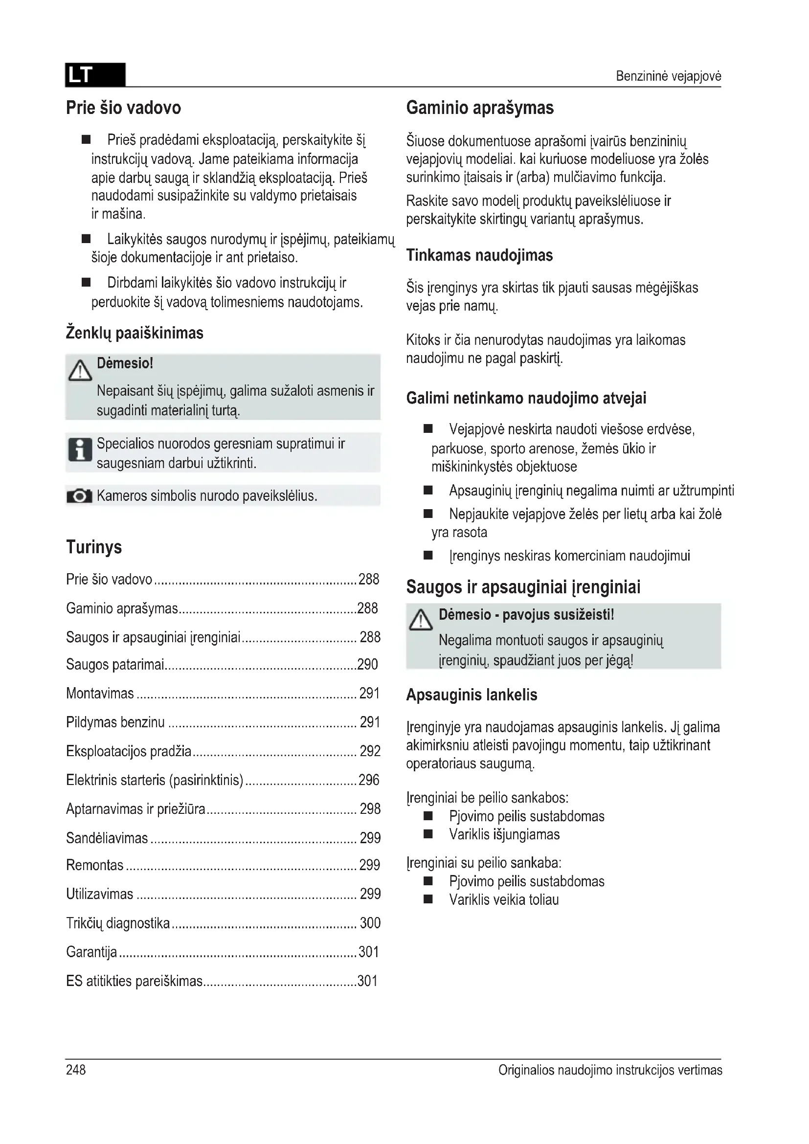 - ES atitikties pareiškimas Prie šio vadovo Priešpradėdamieksploataciją,perskaitykitešį instrukcijųvadovą.Jamepateikiamainformacija apiedarbųsaugąirsklandžiąeksploataciją.Prieš naudodamisusipažinkitesuvaldymoprietaisais ir mašina. Laikykitėssaugosnurodymųirįspėjimų,pateikiamų šioje dokumentacijoje ir ant prietaiso. Dirbdamilaikykitėsšiovadovoinstrukcijųir perduokitešįvadovątolimesniemsnaudotojams. Ženklų paaiškinimas Dėmesio! Nepaisantšiųįspėjimų,galimasužalotiasmenisir sugadintimaterialinįturtą. Specialios nuorodos geresniam supratimui ir saugesniamdarbuiužtikrinti. Kamerossimbolisnurodopaveikslėlius. Gaminio aprašymas Šiuosedokumentuoseaprašomiįvairūsbenzininių vejapjoviųmodeliai.kaikuriuosemodeliuoseyražolės surinkimoįtaisaisir(arba)mulčiavimofunkcija. Raskitesavomodelįproduktųpaveikslėliuoseir perskaitykiteskirtingųvariantųaprašymus. Tinkamas naudojimas Šisįrenginysyraskirtastikpjautisausasmėgėjiškas vejasprienamų. Kitoksirčianenurodytasnaudojimasyralaikomas naudojimunepagalpaskirtį. Galimi netinkamo naudojimo atvejai Vejapjovėneskirtanaudotiviešoseerdvėse, parkuose,sportoarenose,žemėsūkioir miškininkystėsobjektuose Apsauginiųįrenginiųnegalimanuimtiaružtrumpinti Nepjaukitevejapjoveželėsperlietųarbakaižolė yra rasota Įrenginysneskiraskomerciniamnaudojimui Saugos ir apsauginiai įrenginiai Dėmesio - pavojus susižeisti! Negalimamontuotisaugosirapsauginių įrenginių,spaudžiantjuosperjėgą! Apsauginis lankelis Įrenginyjeyranaudojamasapsauginislankelis.Jįgalima akimirksniuatleistipavojingumomentu,taipužtikrinant operatoriaussaugumą. Įrenginiaibepeiliosankabos: Pjovimo peilis sustabdomas Variklis išjungiamas Įrenginiaisupeiliosankaba: Pjovimo peilis sustabdomas Variklis veikia toliauLT 249455 999_a1 Starterio trosas 9 Pjovimoaukščioreguliatorius*2 Paleidimas, sustabdymas* 10 Peilio sankaba*3 Ratųpavara* 11 Kintamogreičiopavara*4 Apsauginis lankelis 12 Naudojimo instrukcija 5 Ergonomiškopjovimoaukščioreguliatorius* 13 Žolėsišmetimoįtaisas* 6 Pripildymo lygio rodiklis* 14 Užsikimšimosklendė*7 Išmetimo angos dangtelis* 15 Mulčiavimopriedas*8 Žolėssurinkimotalpa* 1617 Trumpas vadovasSimboliai ant prietaisųDėmesio! Dirbkiteypačatsargiai.Prieš atlikdami darbus su pjovimo mechanizmuatjunkitedegimožvakėskištuką.Priešeksploatacijąperskaitykitenaudojimoinstrukciją!Trumpas vadovasAtjunkitevarikliostabdį.Saugokitės,kadįdarbozonąneįeitųpašaliniųasmenų!Trumpas vadovasĮjunkiteratųpavarą.Saugokiterankasirkojasnuopeilių!Trumpas vadovasNuotoliniodegalųpadavimoįjungimasirišjungimas.Laikykitėssaugausatstumo. p. 301