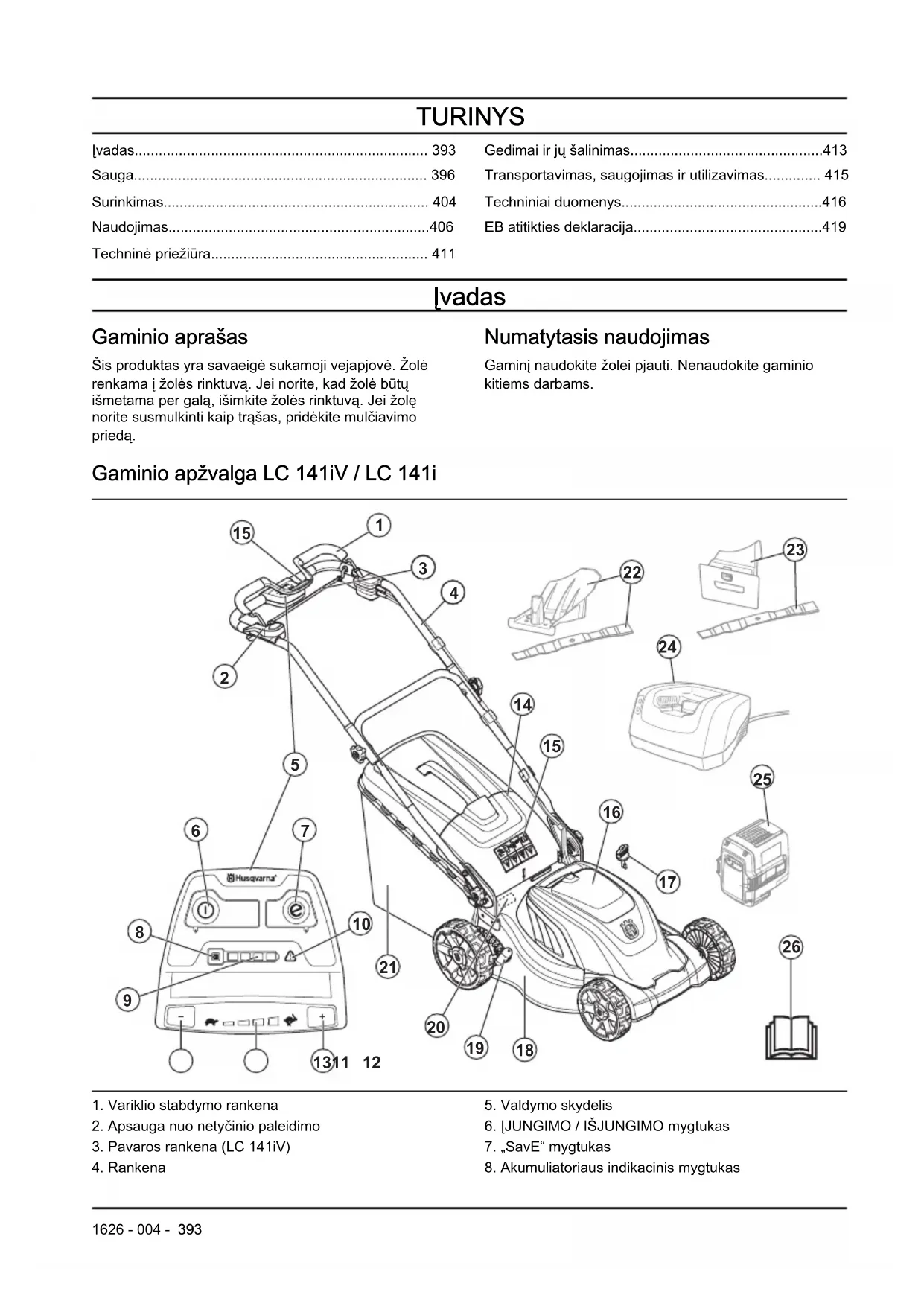 Simboliai ant gaminio Nerūpestingai arba netinkamai naudojant įrenginį gali būti sužeistas ar netgi žūti 394 1626 - 004 -operatorius arba pašaliniai asmenys. Prieš naudodami gaminį perskaitykite naudojimo instrukciją ir įsitikinkite, kad instrukcijas suprantate. Asmenims ir gyvūnams būtina laikytis saugaus atstumo nuo darbo zonos. Saugokitės išmetamų ir rikošetu atšokusių daiktų. Įspėjimas: Saugokite rankas bei kojas ir nekiškite jų prie besisukančio peilio. Įspėjimas: Saugokite rankas bei kojas ir nekiškite jų prie besisukančių dalių. Prieš atlikdami gaminio priežiūros darbus, ištraukite apsauginį raktelį. (modelis LC 141iV/LC 141i) Prieš atlikdami gaminio priežiūros darbus, atjunkite gaminį nuo elektros tinklo. (modelis LC 141C) IPX1 – gaminys yra apsaugotas nuo varvančio vandens (modelis LC 141iV/ LC 141i) IPX4 – gaminys yra apsaugotas nuo vandens purslų (modelis /LC 141C) Saugokite gaminį nuo lietaus (modelis LC 141iV/LC 141i) Įspėjimas: Nenaudokite gaminio ant maitinimo laido, nes galite patirti elektros smūgį arba sugadinti gaminį. (modelis LC 141C) Šis įrenginys atitinka jam taikomas EB direktyvas. Į aplinką skleidžiamas triukšmas atitinka Europos Bendrijos direktyvą. Gaminio emisijos nurodytos skyriuje „Techniniai duomenys“ ir ant etiketės. Nuolatinė srovė. 36 V 1626 - 004 - 395Dviguba izoliacija. Nuvežkite šį gaminį į elek- tros ir elektroni- kos įrenginių perdirbimo punktą. (galioja tik Europoje) Modelių LC 141iV/ LC 141i palei- dimo procedū- ra: paspauskite ĮJUNGIMO / IŠJUNGIMO mygtuką, at- leiskite apsau- gą nuo netyči- nio paleidimo, nuspauskite variklio stabdy- mo rankeną. Modelio LC 141C paleidimo procedūra: atleiskite apsaugą nuo netyčinio paleidimo, nuspauskite variklio stabdymo rankeną. Norėdami sustabdyti variklį, atleiskite variklio stabdymo rankeną. Lėtai Greitai Nuskaitomas kodas Pasižymėkite: Kiti ant gaminio esantys simboliai (lipdukai) yra naudojami pagal kai kurių rinkų sertifikavimo reikalavimus. Atsakomybė už gaminį Kaip nurodyta atsakomybės už gaminį įstatymuose, mes nesame atsakingi už mūsų gaminio sukeltą žalą, jei: