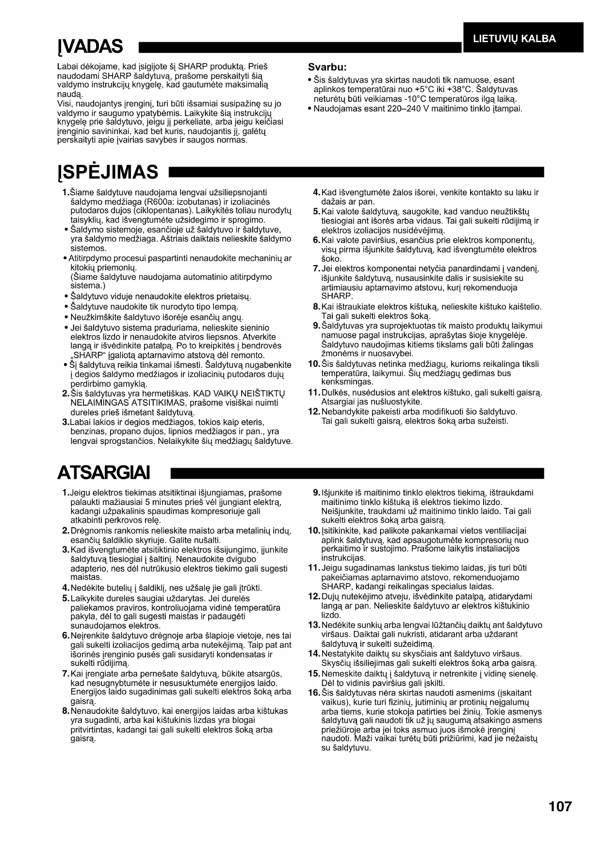 - Šį šaldytuvą reikia tinkamai išmesti. Šaldytuvą nugabenkite į degios šaldymo medžiagos ir izoliacinių putodaros dujų perdirbimo gamyklą. 2.Šis šaldytuvas yra hermetiškas. KAD VAIKŲ NEIŠTIKTŲ NELAIMINGAS ATSITIKIMAS, prašome visiškai nuimti dureles prieš išmetant šaldytuvą. 3.Labai lakios ir degios medžiagos, tokios kaip eteris, benzinas, propano dujos, lipnios medžiagos ir pan., yra lengvai sprogstančios. Nelaikykite šių medžiagų šaldytuve. 4.Kad išvengtumėte žalos išorei, venkite kontakto su laku ir dažais ar pan. 5.Kai valote šaldytuvą, saugokite, kad vanduo neužtikštų tiesiogiai ant išorės arba vidaus. Tai gali sukelti rūdijimą ir elektros izoliacijos nusidėvėjimą. 6.Kai valote paviršius, esančius prie elektros komponentų, visų pirma išjunkite šaldytuvą, kad išvengtumėte elektros šoko. 7.Jei elektros komponentai netyčia panardindami į vandenį, išjunkite šaldytuvą, nusausinkite dalis ir susisiekite su artimiausiu aptarnavimo atstovu, kurį rekomenduoja SHARP. 8.Kai ištraukiate elektros kištuką, nelieskite kištuko kaištelio. Tai gali sukelti elektros šoką. 9.Šaldytuvas yra suprojektuotas tik maisto produktų laikymui namuose pagal instrukcijas, aprašytas šioje knygelėje. Šaldytuvo naudojimas kitiems tikslams gali būti žalingas žmonėms ir nuosavybei. 10.Šis šaldytuvas netinka medžiagų, kurioms reikalinga tiksli temperatūra, laikymui. Šių medžiagų gedimas bus kenksmingas. 11.Dulkės, nusėdusios ant elektros kištuko, gali sukelti gaisrą. Atsargiai jas nušluostykite. 12.Nebandykite pakeisti arba modifikuoti šio šaldytuvo. Tai gali sukelti gaisrą, elektros šoką arba sužeisti. ATSARGIAI 1.Jeigu elektros tiekimas atsitiktinai išjungiamas, prašome palaukti mažiausiai 5 minutes prieš vėl įjungiant elektrą, kadangi užpakalinis spaudimas kompresoriuje gali atkabinti perkrovos relę. 2.Drėgnomis rankomis nelieskite maisto arba metalinių indų, esančių šaldiklio skyriuje. Galite nušalti. 3.Kad išvengtumėte atsitiktinio elektros išsijungimo, įjunkite šaldytuvą tiesiogiai į šaltinį. Nenaudokite dvigubo adapterio, nes dėl nutrūkusio elektros tiekimo gali sugesti maistas. 4.Nedėkite butelių į šaldiklį, nes užšalę jie gali įtrūkti. 5.Laikykite dureles saugiai uždarytas. Jei durelės paliekamos praviros, kontroliuojama vidinė temperatūra pakyla, dėl to gali sugesti maistas ir padaugėti sunaudojamos elektros. 6.Neįrenkite šaldytuvo drėgnoje arba šlapioje vietoje, nes tai gali sukelti izoliacijos gedimą arba nutekėjimą. Taip pat ant išorinės įrenginio pusės gali susidaryti kondensatas ir sukelti rūdijimą. 7.Kai įrengiate arba pernešate šaldytuvą, būkite atsargūs, kad nesugnybtumėte ir nesusuktumėte energijos laido. Energijos laido sugadinimas gali sukelti elektros šoką arba gaisrą. 8.Nenaudokite šaldytuvo, kai energijos laidas arba kištukas yra sugadinti, arba kai kištukinis lizdas yra blogai pritvirtintas, kadangi tai gali sukelti elektros šoką arba gaisrą. 9.Išjunkite iš maitinimo tinklo elektros tiekimą, ištraukdami maitinimo tinklo kištuką iš elektros tiekimo lizdo. Neišjunkite, traukdami už maitinimo tinklo laido. Tai gali sukelti elektros šoką arba gaisrą. 10.Įsitikinkite, kad palikote pakankamai vietos ventiliacijai aplink šaldytuvą, kad apsaugotumėte kompresorių nuo perkaitimo ir sustojimo. Prašome laikytis instaliacijos instrukcijas. 11.Jeigu sugadinamas lankstus tiekimo laidas, jis turi būti pakeičiamas aptarnavimo atstovo, rekomenduojamo SHARP, kadangi reikalingas specialus laidas. 12.Dujų nutekėjimo atveju, išvėdinkite patalpą, atidarydami langą ar pan. Nelieskite šaldytuvo ar elektros kištukinio lizdo. 13.Nedėkite sunkių arba lengvai lūžtančių daiktų ant šaldytuvo viršaus. Daiktai gali nukristi, atidarant arba uždarant šaldytuvą ir sukelti sužeidimą. 14.Nestatykite daiktų su skysčiais ant šaldytuvo viršaus. Skysčių išsiliejimas gali sukelti elektros šoką arba gaisrą. 15.Nemeskite daiktų į šaldytuvą ir netrenkite į vidinę sienelę. Dėl to vidinis paviršius gali įskilti. 16.Šis šaldytuvas nėra skirtas naudoti asmenims (įskaitant vaikus), kurie turi fizinių, jutiminių ar protinių neįgalumų arba tiems, kurie stokoja patirties bei žinių. Tokie asmenys šaldytuvą gali naudoti tik už jų saugumą atsakingo asmens priežiūroje arba jei toks asmuo juos išmokė įrenginį naudoti. Maži vaikai turėtų būti prižiūrimi, kad jie nežaistų su šaldytuvu. A808-3 校 _(P107-P114)Lithuanian_ リトアニア .fm Page 107 Monday, June 16, 2008 2:53 PM108 INSTALIACIJA