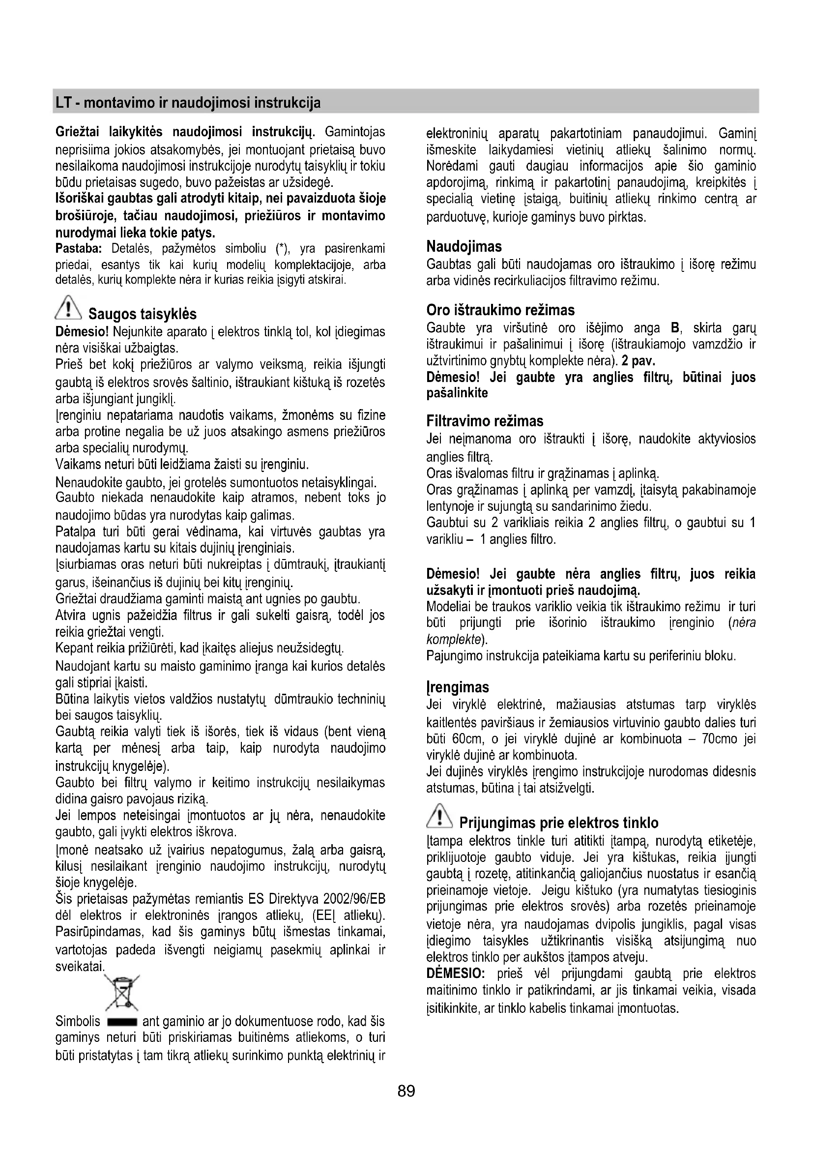 Якщо система підсвітки не працює, перевірте вірну установку ламп в гнізда, перед тим як звертатися до центру технічної допомоги.89 LT - montavimo ir naudojimosi instrukcija Griežtai laikykitės naudojimosi instrukcijų. Gamintojas neprisiima jokios atsakomybės, jei montuojant prietaisą buvo nesilaikoma naudojimosi instrukcijoje nurodytų taisyklių ir tokiu būdu prietaisas sugedo, buvo pažeistas ar užsidegė. Išoriškai gaubtas gali atrodyti kitaip, nei pavaizduota šioje brošiūroje, tačiau naudojimosi, priežiūros ir montavimo nurodymai lieka tokie patys. Pastaba: Detalės, pažymėtos simboliu (*), yra pasirenkami priedai, esantys tik kai kurių modelių komplektacijoje, arba detalės, kurių komplekte nėra ir kurias reikia įsigyti atskirai. Saugos taisyklės Dėmesio! Nejunkite aparato į elektros tinklą tol, kol įdiegimas nėra visiškai užbaigtas. Prieš bet kokį priežiūros ar valymo veiksmą, reikia išjungti gaubtą iš elektros srovės šaltinio, ištraukiant kištuką iš rozetės arba išjungiant jungiklį. Įrenginiu nepatariama naudotis vaikams, žmonėms su fizine arba protine negalia be už juos atsakingo asmens priežiūros arba specialių nurodymų. Vaikams neturi būti leidžiama žaisti su įrenginiu. Nenaudokite gaubto, jei grotelės sumontuotos netaisyklingai. Gaubto niekada nenaudokite kaip atramos, nebent toks jo naudojimo būdas yra nurodytas kaip galimas. Patalpa turi būti gerai vėdinama, kai virtuvės gaubtas yra naudojamas kartu su kitais dujinių įrenginiais. Įsiurbiamas oras neturi būti nukreiptas į dūmtraukį, įtraukiantį garus, išeinančius iš dujinių bei kitų įrenginių. Griežtai draudžiama gaminti maistą ant ugnies po gaubtu. Atvira ugnis pažeidžia filtrus ir gali sukelti gaisrą, todėl jos reikia griežtai vengti. Kepant reikia prižiūrėti, kad įkaitęs aliejus neužsidegtų. Naudojant kartu su maisto gaminimo įranga kai kurios detalės gali stipriai įkaisti. Būtina laikytis vietos valdžios nustatytų dūmtraukio techninių bei saugos taisyklių. Gaubtą reikia valyti tiek iš išorės, tiek iš vidaus (bent vieną kartą per mėnesį arba taip, kaip nurodyta naudojimo instrukcijų knygelėje). Gaubto bei filtrų valymo ir keitimo instrukcijų nesilaikymas didina gaisro pavojaus riziką. Jei lempos neteisingai įmontuotos ar jų nėra, nenaudokite gaubto, gali įvykti elektros iškrova. Įmonė neatsako už įvairius nepatogumus, žalą arba gaisrą, kilusį nesilaikant įrenginio naudojimo instrukcijų, nurodytų šioje knygelėje. Šis prietaisas pažymėtas remiantis ES Direktyva 2002/96/EB dėl elektros ir elektroninės į rangos atliekų, (EEĮ atliekų). Pasirūpindamas, kad šis gaminys būtų išmestas tinkamai, vartotojas padeda išvengti neigiamų pasekmių aplinkai ir sveikatai. Simbolis ant gaminio ar jo dokumentuose rodo, kad šis gaminys neturi būti priskiriamas buitinėms atliekoms, o turi būti pristatytas į tam tikrą atliekų surinkimo punktą elektrinių ir elektroninių aparatų pakartotiniam panaudojimui. Gaminį išmeskite laikydamiesi vietinių atliekų šalinimo normų. Norėdami gauti daugiau informacijos apie šio gaminio apdorojimą, rinkimą ir pakartotinį panaudojimą, kreipkitės į specialią vietinę įstaigą, buitinių atliekų rinkimo centrą ar parduotuvę, kurioje gaminys buvo pirktas. Naudojimas Gaubtas gali būti naudojamas oro ištraukimo į išorę režimu arba vidinės recirkuliacijos filtravimo režimu. Oro ištraukimo režimas Gaubte yra viršutinė oro išėjimo anga B, skirta garų ištraukimui ir pašalinimui į išorę (ištraukiamojo vamzdžio ir užtvirtinimo gnybtų komplekte nėra). 2 pav. Dėmesio! Jei gaubte yra anglies filtrų, būtinai juos pašalinkite Filtravimo režimas Jei neįmanoma oro ištraukti į išorę, naudokite aktyviosios anglies filtrą. Oras išvalomas filtru ir grąžinamas į aplinką. Oras grąžinamas į aplinką per vamzdį, įtaisytą pakabinamoje lentynoje ir sujungtą su sandarinimo žiedu. Gaubtui su 2 varikliais reikia 2 anglies filtrų, o gaubtui su 1 varikliu – 1 anglies filtro. Dėmesio! Jei gaubte nėra anglies filtrų, juos reikia užsakyti ir įmontuoti prieš naudojimą. Modeliai be traukos variklio veikia tik ištraukimo režimu ir turi būti prijungti prie išorinio ištraukimo įrenginio (nėra komplekte). Pajungimo instrukcija pateikiama kartu su periferiniu bloku. Įrengimas Jei viryklė elektrinė, mažiausias atstumas tarp viryklės kaitlentės paviršiaus ir žemiausios virtuvinio gaubto dalies turi būti 60cm, o jei viryklė dujinė ar kombinuota – 70cmo jei viryklė dujinė ar kombinuota. Jei dujinės viryklės įrengimo instrukcijoje nurodomas didesnis atstumas, būtina į tai atsižvelgti. Prijungimas prie elektros tinklo Įtampa elektros tinkle turi atitikti įtampą, nurodytą etiketėje, priklijuotoje gaubto viduje. Jei yra kištukas, reikia įjungti gaubtą į rozetę, atitinkančią galiojančius nuostatus ir esančią prieinamoje vietoje. Jeigu kištuko (yra numatytas tiesioginis prijungimas prie elektros srovės) arba rozetės prieinamoje vietoje nėra, yra naudojamas dvipolis jungiklis, pagal visas įdiegimo taisykles užtikrinantis visišką atsijungimą nuo elektros tinklo per aukštos įtampos atveju. DĖMESIO: prieš vėl prijungdami gaubtą prie elektros maitinimo tinklo ir patikrindami, ar jis tinkamai veikia, visada įsitikinkite, ar tinklo kabelis tinkamai įmontuotas.90 Montavimas Prieš pradedami įrengimą: