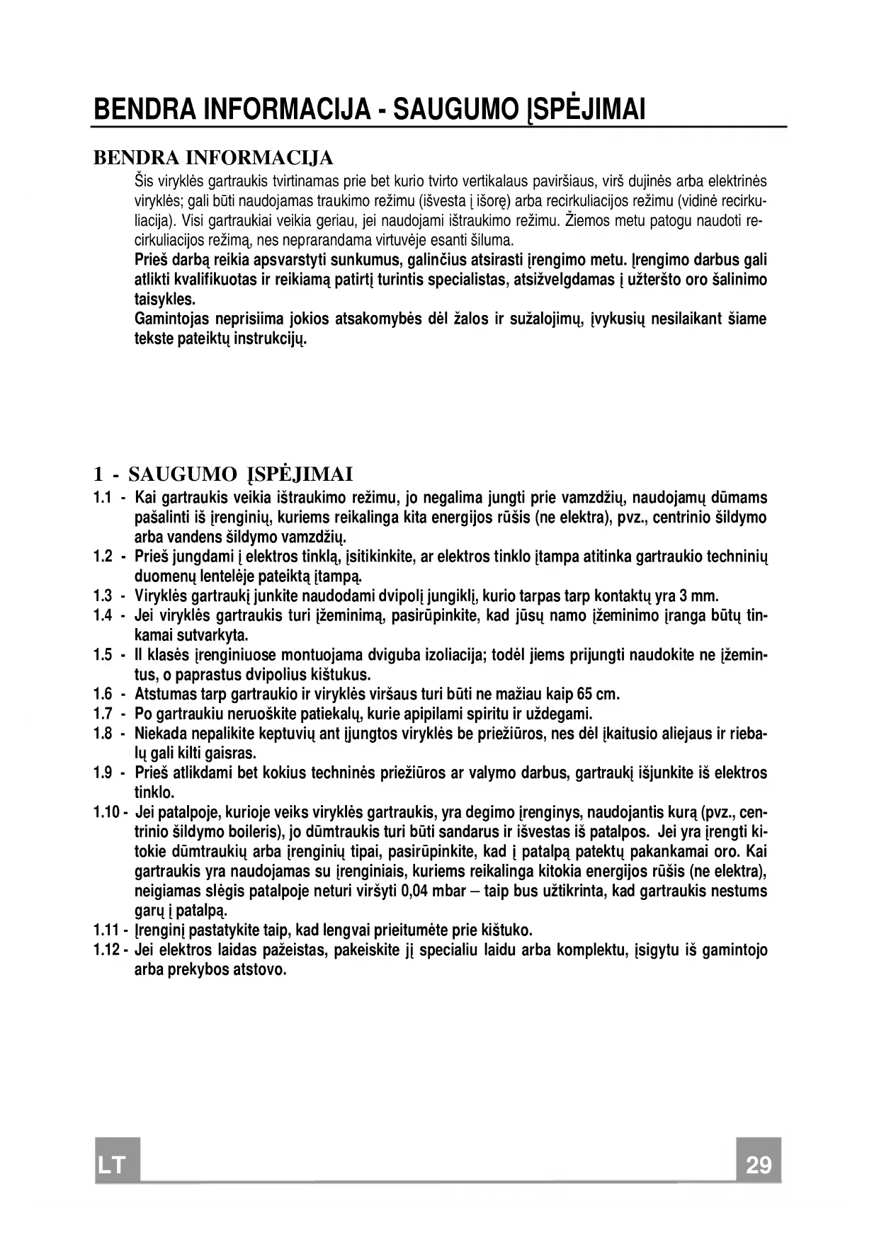 BENDRA INFORMACIJA Šis viryklės gartraukis tvirtinamas prie bet kurio tvirto vertikalaus paviršiaus, virš dujinės arba elektrinės viryklės; gali būti naudojamas traukimo režimu (išvesta į išorę) arba recirkuliacijos režimu (vidinė recirku- liacija). Visi gartraukiai veikia geriau, jei naudojami ištraukimo režimu. Žiemos metu patogu naudoti re- cirkuliacijos režimą, nes neprarandama virtuvėje esanti šiluma. Prieš darbą reikia apsvarstyti sunkumus, galinčius atsirasti įrengimo metu. Įrengimo darbus gali atlikti kvalifikuotas ir reikiamą patirtį turintis specialistas, atsižvelgdamas į užteršto oro šalinimo taisykles. Gamintojas neprisiima jokios atsakomybės dėl žalos ir sužalojimų, įvykusių nesilaikant šiame tekste pateiktų instrukcijų.