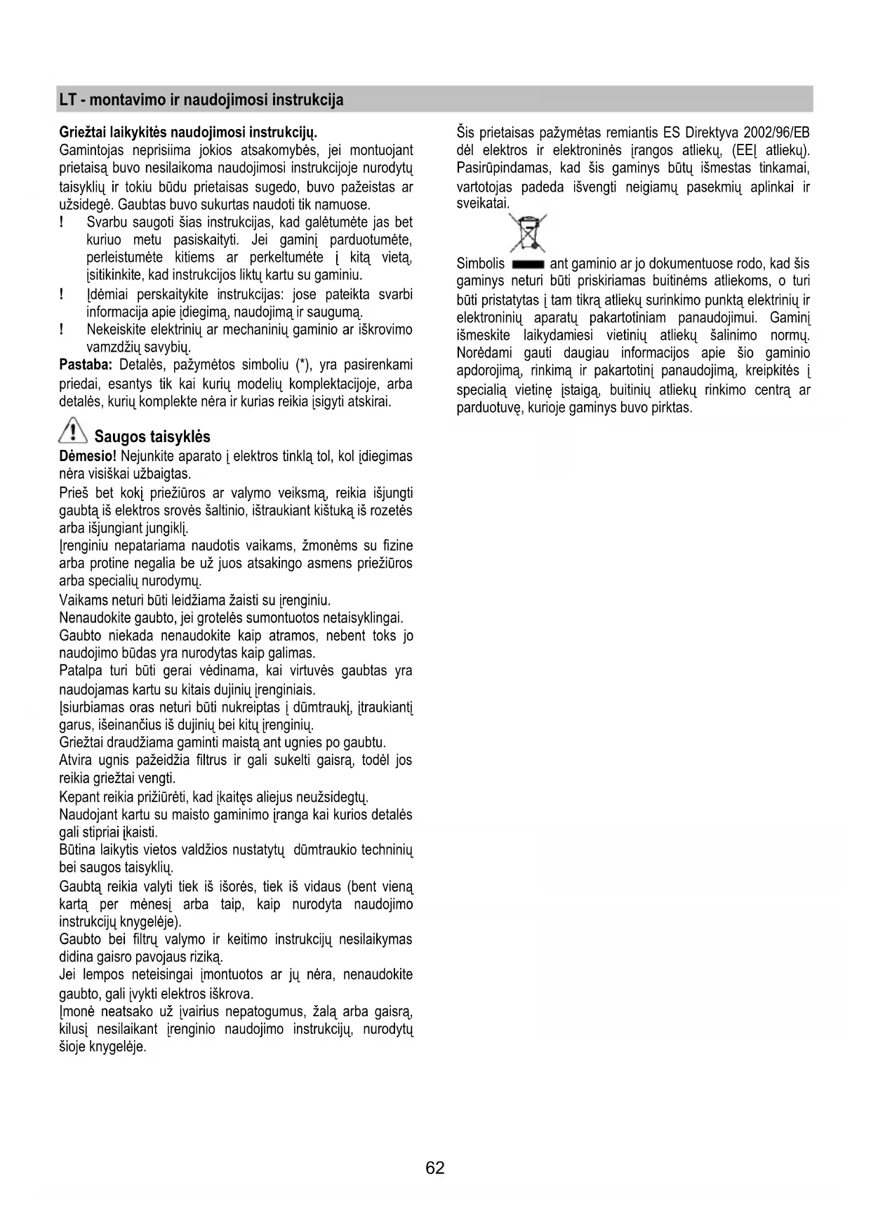 невеликої викрутки або подібного інструменту. Замініть перегорілу лампу. Використовуйте для цього лише галогенні лампи на 20W макс (G4), не доторкуючись до них руками. Закрийте плафон (кріплення засувкою). Якщо система підсвітки не працює, перевірте вірну установку ламп в гнізда, перед тим як звертатися до центру технічної допомоги.62 LT - montavimo ir naudojimosi instrukcija Griežtai laikykitės naudojimosi instrukcijų. Gamintojas neprisiima jokios atsakomybės, jei montuojant prietaisą buvo nesilaikoma naudojimosi instrukcijoje nurodytų taisyklių ir tokiu būdu prietaisas sugedo, buvo pažeistas ar užsidegė. Gaubtas buvo sukurtas naudoti tik namuose. ! Svarbu saugoti šias instrukcijas, kad galėtumėte jas bet kuriuo metu pasiskaityti. Jei gaminį parduotumėte, perleistumėte kitiems ar perkeltumėte į kitą vietą, įsitikinkite, kad instrukcijos liktų kartu su gaminiu. ! Įdėmiai perskaitykite instrukcijas: jose pateikta svarbi informacija apie įdiegimą, naudojimą ir saugumą. ! Nekeiskite elektrinių ar mechaninių gaminio ar iškrovimo vamzdžių savybių. Pastaba: Detalės, pažymėtos simboliu (*), yra pasirenkami priedai, esantys tik kai kurių modelių komplektacijoje, arba detalės, kurių komplekte nėra ir kurias reikia įsigyti atskirai. Saugos taisyklės Dėmesio! Nejunkite aparato į elektros tinklą tol, kol įdiegimas nėra visiškai užbaigtas. Prieš bet kokį priežiūros ar valymo veiksmą, reikia išjungti gaubtą iš elektros srovės šaltinio, ištraukiant kištuką iš rozetės arba išjungiant jungiklį. Įrenginiu nepatariama naudotis vaikams, žmonėms su fizine arba protine negalia be už juos atsakingo asmens priežiūros arba specialių nurodymų. Vaikams neturi būti leidžiama žaisti su įrenginiu. Nenaudokite gaubto, jei grotelės sumontuotos netaisyklingai. Gaubto niekada nenaudokite kaip atramos, nebent toks jo naudojimo būdas yra nurodytas kaip galimas. Patalpa turi būti gerai vėdinama, kai virtuvės gaubtas yra naudojamas kartu su kitais dujinių įrenginiais. Įsiurbiamas oras neturi būti nukreiptas į dūmtraukį, įtraukiantį garus, išeinančius iš dujinių bei kitų įrenginių. Griežtai draudžiama gaminti maistą ant ugnies po gaubtu. Atvira ugnis pažeidžia filtrus ir gali sukelti gaisrą, todėl jos reikia griežtai vengti. Kepant reikia prižiūrėti, kad įkaitęs aliejus neužsidegtų. Naudojant kartu su maisto gaminimo įranga kai kurios detalės gali stipriai įkaisti. Būtina laikytis vietos valdžios nustatytų dūmtraukio techninių bei saugos taisyklių. Gaubtą reikia valyti tiek iš išorės, tiek iš vidaus (bent vieną kartą per mėnesį arba taip, kaip nurodyta naudojimo instrukcijų knygelėje). Gaubto bei filtrų valymo ir keitimo instrukcijų nesilaikymas didina gaisro pavojaus riziką. Jei lempos neteisingai įmontuotos ar jų nėra, nenaudokite gaubto, gali įvykti elektros iškrova. Įmonė neatsako už įvairius nepatogumus, žalą arba gaisrą, kilusį nesilaikant įrenginio naudojimo instrukcijų, nurodytų šioje knygelėje. Šis prietaisas pažymėtas remiantis ES Direktyva 2002/96/EB dėl elektros ir elektroninės į rangos atliekų, (EEĮ atliekų). Pasirūpindamas, kad šis gaminys būtų išmestas tinkamai, vartotojas padeda išvengti neigiamų pasekmių aplinkai ir sveikatai. Simbolis ant gaminio ar jo dokumentuose rodo, kad šis gaminys neturi būti priskiriamas buitinėms atliekoms, o turi būti pristatytas į tam tikrą atliekų surinkimo punktą elektrinių ir elektroninių aparatų pakartotiniam panaudojimui. Gaminį išmeskite laikydamiesi vietinių atliekų šalinimo normų. Norėdami gauti daugiau informacijos apie šio gaminio apdorojimą, rinkimą ir pakartotinį panaudojimą, kreipkitės į specialią vietinę įstaigą, buitinių atliekų rinkimo centrą ar parduotuvę, kurioje gaminys buvo pirktas.63 Naudojimas Gaubtas gali būti naudojamas oro ištraukimo į išorę režimu arba vidinės recirkuliacijos filtravimo režimu. Įtraukimas Gaubte yra viršutinė anga B1, skirta orui išeiti, ir galinė anga B2*, skirta garams pašalinti į išorę. Pasirinkite reikalingą angą ir prijunkite jungę C prie prietaiso. Visada uždarykite prietaiso nenaudojamą angą dangteliu D*, jei taip yra numatyta. Pastaba: kai kuriuose modeliuose viršutinė anga B1 būna užtaisyta. Stipriai paspauskite, kad pašalintumėte nulaužti skirtą dalį, kuria uždaryta anga, ir ją nuimkite. Dėmesio! Nulaužtos dalies nebegalima pritvirtinti ankstesnėje vietoje, todėl ją nulaužkite tik tuo atveju, jei esate tikri, kad tai reikalinga. Dėmesio! Kai kuriuose modeliuose galinės angos neįmanoma iš karto pasiekti net nuėmus dangtį (jei jis jau uždėtas). Tokiu atveju nuimkite plastikinę dalį E1 ar E2 nuo angos ją numaudami, naudodami žnyples. Patikrinkite, kad siurbimo/filtravimo selektorius G, esantis gaubto viduje, būtų siurbimo padėtyje (A). Filtravimas Tuo atveju, kai gaminant maistą neįmanoma į išorę pašalinti dūmų ir garų, galima naudoti gaubto filtravimo funkciją, pritvirtinant anglies filtrą – dūmai ir garai surenkami per priekinį grotelių valiklį, esantį virš valdymo plokštės. Patikrinkite, kad siurbimo/filtravimo selektorius būtų filtravimo padėtyje (F). Modeliai be traukos variklio veikia tik ištraukimo režimu ir turi būti prijungti prie išorinio ištraukimo įrenginio (nėra komplekte). Pajungimo instrukcija pateikiama kartu su periferiniu bloku. Įrengimas Jei viryklė elektrinė, mažiausias atstumas tarp viryklės kaitlentės paviršiaus ir žemiausios virtuvinio gaubto dalies turi būti 60cm, o jei viryklė dujinė ar kombinuota – 70cmo jei viryklė dujinė ar kombinuota.