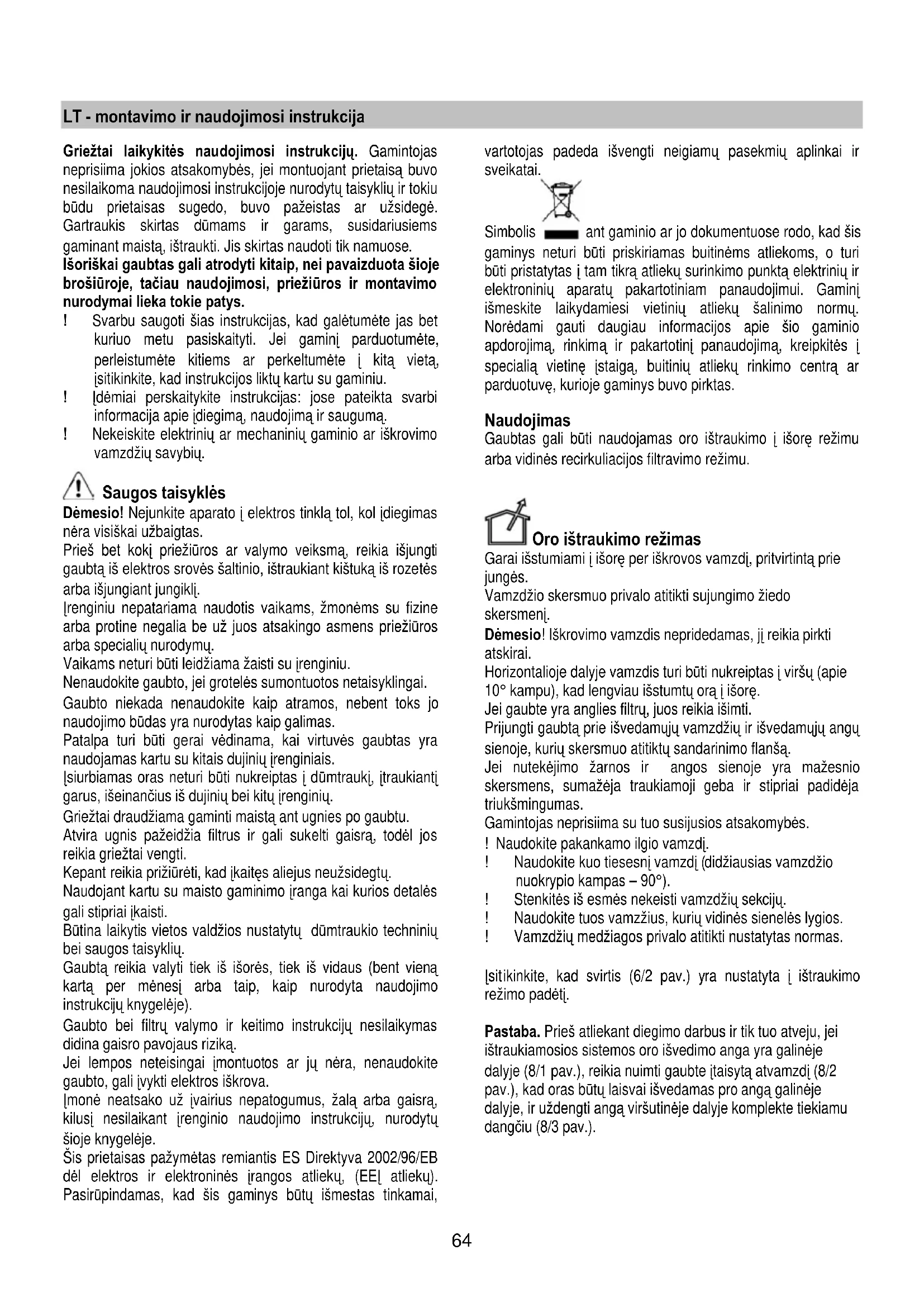 захисних ришіток ротора двигуна, після чого повернути фільтр за годинниковою стрілкою. Для знаття - повернути фільтр проти годинникової стрілки. Заміна Ламп Відключити прилад від електромережі. Увага! Перш ніж торкати лампи необхідно впевнитися що вони охололи. Замінити перегорілу лампу. Використовуйте лише галогенні лампи свічки Ø35 мм E14 28Вт Якщо система підсвітки не працює, перевірте вірну установку ламп в гнізда, перед тим як звертатися до центру технічної допомоги.64 LT - montavimo ir naudojimosi instrukcija Griežtai laikykitės naudojimosi instrukcijų. Gamintojas neprisiima jokios atsakomybės, jei montuojant prietaisą buvo nesilaikoma naudojimosi instrukcijoje nurodytų taisyklių ir tokiu būdu prietaisas sugedo, buvo pažeistas ar užsidegė. Gartraukis skirtas dūmams ir garams, susidariusiems gaminant maistą, ištraukti. Jis skirtas naudoti tik namuose. Išoriškai gaubtas gali atrodyti kitaip, nei pavaizduota šioje brošiūroje, tačiau naudojimosi, priežiūros ir montavimo nurodymai lieka tokie patys. ! Svarbu saugoti šias instrukcijas, kad galėtumėte jas bet kuriuo metu pasiskaityti. Jei gaminį parduotumėte, perleistumėte kitiems ar perkeltumėte į kitą vietą, įsitikinkite, kad instrukcijos liktų kartu su gaminiu. ! Įdėmiai perskaitykite instrukcijas: jose pateikta svarbi informacija apie įdiegimą, naudojimą ir saugumą. ! Nekeiskite elektrinių ar mechaninių gaminio ar iškrovimo vamzdžių savybių. Saugos taisyklės Dėmesio! Nejunkite aparato į elektros tinklą tol, kol įdiegimas nėra visiškai užbaigtas. Prieš bet kokį priežiūros ar valymo veiksmą, reikia išjungti gaubtą iš elektros srovės šaltinio, ištraukiant kištuką iš rozetės arba išjungiant jungiklį. Įrenginiu nepatariama naudotis vaikams, žmonėms su fizine arba protine negalia be už juos atsakingo asmens priežiūros arba specialių nurodymų. Vaikams neturi būti leidžiama žaisti su įrenginiu. Nenaudokite gaubto, jei grotelės sumontuotos netaisyklingai. Gaubto niekada nenaudokite kaip atramos, nebent toks jo naudojimo būdas yra nurodytas kaip galimas. Patalpa turi būti gerai vėdinama, kai virtuvės gaubtas yra naudojamas kartu su kitais dujinių įrenginiais. Įsiurbiamas oras neturi būti nukreiptas į dūmtraukį, įtraukiantį garus, išeinančius iš dujinių bei kitų įrenginių. Griežtai draudžiama gaminti maistą ant ugnies po gaubtu. Atvira ugnis pažeidžia filtrus ir gali sukelti gaisrą, todėl jos reikia griežtai vengti. Kepant reikia prižiūrėti, kad įkaitęs aliejus neužsidegtų. Naudojant kartu su maisto gaminimo įranga kai kurios detalės gali stipriai įkaisti. Būtina laikytis vietos valdžios nustatytų dūmtraukio techninių bei saugos taisyklių. Gaubtą reikia valyti tiek iš išorės, tiek iš vidaus (bent vieną kartą per mėnesį arba taip, kaip nurodyta naudojimo instrukcijų knygelėje). Gaubto bei filtrų valymo ir keitimo instrukcijų nesilaikymas didina gaisro pavojaus riziką. Jei lempos neteisingai įmontuotos ar jų nėra, nenaudokite gaubto, gali įvykti elektros iškrova. Įmonė neatsako už įvairius nepatogumus, žalą arba gaisrą, kilusį nesilaikant įrenginio naudojimo instrukcijų, nurodytų šioje knygelėje. Šis prietaisas pažymėtas remiantis ES Direktyva 2002/96/EB dėl elektros ir elektroninės įrangos atliek ų, (EEĮ at liekų). Pasirūpindamas, kad šis gaminys būtų išmestas tinkamai, vartotojas padeda išvengti neigiamų pasekmių aplinkai ir sveikatai. Simbolis ant gaminio ar jo dokumentuose rodo, kad šis gaminys neturi būti priskiriamas buitinėms atliekoms, o turi būti pristatytas į tam tikrą atliekų surinkimo punktą elektrinių ir elektroninių aparatų pakartotiniam panaudojimui. Gaminį išmeskite laikydamiesi vietinių atliekų šalinimo normų. Norėdami gauti daugiau informacijos apie šio gaminio apdorojimą, rinkimą ir pakartotinį panaudojimą, kreipkitės į specialią vietinę įstaigą, buitinių atliekų rinkimo centrą ar parduotuvę, kurioje gaminys buvo pirktas. Naudojimas Gaubtas gali būti naudojamas oro ištraukimo į išorę režimu arba vidinės recirkuliacijos filtravimo režimu. Oro ištraukimo režimas Garai išstumiami į išorę per iškrovos vamzdį, pritvirtintą prie jungės. Vamzdžio skersmuo privalo atitikti sujungimo žiedo skersmenį. Dėmesio! Iškrovimo vamzdis nepridedamas, jį reikia pirkti atskirai. Horizontalioje dalyje vamzdis turi būti nukreiptas į viršų (apie 10° kampu), kad lengviau išstumtų orą į išorę. Jei gaubte yra anglies filtrų, juos reikia išimti. Prijungti gaubtą prie išvedamųjų vamzdžių ir išvedamųjų angų sienoje, kurių skersmuo atitiktų sandarinimo flanšą. Jei nutekėjimo žarnos ir angos sienoje yra mažesnio skersmens, sumažėja traukiamoji geba ir stipriai padidėja triukšmingumas. Gamintojas neprisiima su tuo susijusios atsakomybės. ! Naudokite pakankamo ilgio vamzdį. ! Naudokite kuo tiesesnį vamzdį (didžiausias vamzdžio nuokrypio kampas – 90°). ! Stenkitės iš esmės nekeisti vamzdžių sekcijų. ! Naudokite tuos vamzžius, kurių vidinės sienelės lygios. ! Vamzdžių medžiagos privalo atitikti nustatytas normas. Įsit ikinkite, kad svirtis (6/2 pav.) yra nustatyta į ištraukimo režimo padėtį. Pastaba. Prieš atliekant diegimo darbus ir tik tuo atveju, jei ištraukiamosios sistemos oro išvedimo anga yra galinėje dalyje (8/1 pav.), reikia nuimti gaubte įtaisytą atvamzdį (8/2 pav.), kad oras būtų laisvai išvedamas pro angą galinėje dalyje, ir uždengti angą viršutinėje dalyje kom