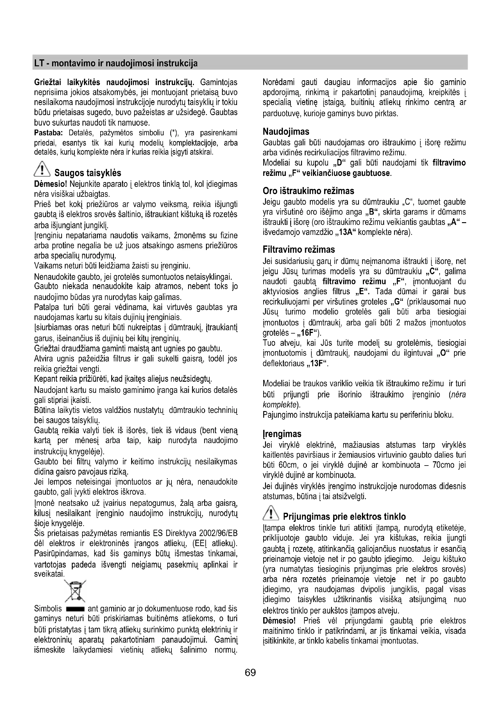 місяць, за допомогою неагресивних миючих засобів, вручну або у посудомийній машині при низькій температурі та короткому циклі. Під час миття у посудомийній машині металевий жиропоглинаючий фільтр може втратити колір, але його характеристики фільтрації абсолютно не змінюються. Щоб мати доступ до жирового фільтру J, відкрийте всмоктуючи решітку Н за допомогою защіпок L та звільніть його від стопорів К. Деякі моделі мають металевий фільтр М без опорної решітки. Вони миються як вище описано та знімаються за допомогою ручок N, які необхідно натиснути донизу. Вугільний фільтр (тільки в режимі рециркуляції) Вбирає неприємні запахи кухні. Насиченість вугільного фільтру перевіряється після більш або менш довгого використання в залежності від типу плити та регулярності чищення жиропоглинаючого фільтру. У будь-якому випадку необхідно заміняти картридж принаймнi через кожні чотири місяці (або коли система індикації насиченості фільтрів – якщо така передбачена у вашій моделі - вказує на таку необхідність) НЕ підлягає миттю чи поновленню. Вугільний фільтр з центральною ручкою Прикласти фільтри по обидві сторони для покриття захисних ришіток ротора двигуна, після чого повернути центральну ручку Р фільтрів за годинниковою стрілкою. Для знаття - повернути центральну ручку Р кожного фільтру проти годинникової стрілки. Заміна Ламп Відключити прилад від електромережі. Увага! Перш ніж торкати лампи необхідно впевнитися що вони охололи. Заміна лампочок 40W – Відкрити нішу де знаходяться лампочки – Відкрутити шуруп тримача плафона. Викрутити перегорілу лампочку та замінити її овальною лампочкою з накалюванням макс. 40W E14. Заміна галогенної лампочки - Відкрити нішу де знаходяться лампочки – вийняти захисну планку за допомогою невеликої викрутки або подібного інструменту. Замініть перегорілу лампу. Використовуйте для цього лише галогенні лампи на 20W макс (G4), не доторкуючись до них руками. Закрийте плафон (кріплення засувкою) (Z1 - Z2) Якщо система підсвітки не працює, перевірте вірну установку ламп в гнізда, перед тим як звертатися до центру технічної допомоги.69 LT - montavimo ir naudojimosi instrukcija Griežtai laikykitės naudojimosi instrukcijų. Gamintojas neprisiima jokios atsakomybės, jei montuojant prietaisą buvo nesilaikoma naudojimosi instrukcijoje nurodytų taisyklių ir tokiu būdu prietaisas sugedo, buvo pažeistas ar užsidegė. Gaubtas buvo sukurtas naudoti tik namuose. Pastaba: Detalės, pažymėtos simboliu (*), yra pasirenkami priedai, esantys tik kai kurių modelių komplektacijoje, arba detalės, kurių komplekte nėra ir kurias reikia įsigyti atskirai. Saugos taisyklės Dėmesio! Nejunkite aparato į elektros tinklą tol, kol įdiegimas nėra visiškai užbaigtas. Prieš bet kokį priežiūros ar valymo veiksmą, reikia išjungti gaubtą iš elektros srovės šaltinio, ištraukiant kištuką iš rozetės arba išjungiant jungiklį. Įrenginiu nepatariama naudotis vaikams, žmonėms su fizine arba protine negalia be už juos atsakingo asmens priežiūros arba specialių nurodymų. Vaikams neturi būti leidžiama žaisti su įrenginiu. Nenaudokite gaubto, jei grotelės sumontuotos netaisyklingai. Gaubto niekada nenaudokite kaip atramos, nebent toks jo naudojimo būdas yra nurodytas kaip galimas. Patalpa turi būti gerai vėdinama, kai virtuvės gaubtas yra naudojamas kartu su kitais dujinių įrenginiais. Įsiurbiamas oras neturi būti nukreiptas į dūmtraukį, įtraukiantį garus, išeinančius iš dujinių bei kitų įrenginių. Griežtai draudžiama gaminti maistą ant ugnies po gaubtu. Atvira ugnis pažeidžia filtrus ir gali sukelti gaisrą, todėl jos reikia griežtai vengti. Kepant reikia prižiūrėti, kad įkaitęs aliejus neužsidegtų. Naudojant kartu su maisto gaminimo įranga kai kurios detalės gali stipriai įkaisti. Būtina laikytis vietos valdžios nustatytų dūmtraukio techninių bei saugos taisyklių. Gaubtą reikia valyti tiek iš išorės, tiek iš vidaus (bent vieną kartą per mėnesį arba taip, kaip nurodyta naudojimo instrukcijų knygelėje). Gaubto bei filtrų valymo ir keitimo instrukcijų nesilaikymas didina gaisro pavojaus riziką. Jei lempos neteisingai įmontuotos ar jų nėra, nenaudokite gaubto, gali įvykti elektros iškrova. Įmonė neatsako už įvairius