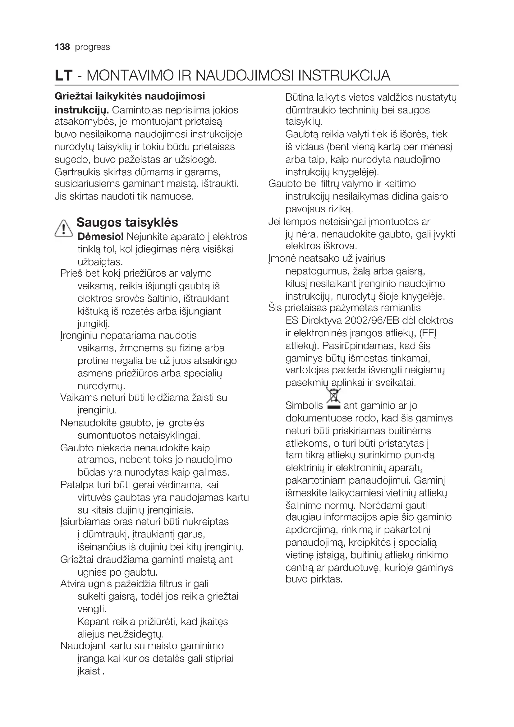 Griežtai laikykitės naudojimosi instrukcijų. Gamintojas neprisiima jokios atsakomybės, jei montuojant prietaisą buvo nesilaikoma naudojimosi instrukcijoje nurodytų taisyklių ir tokiu būdu prietaisas sugedo, buvo pažeistas ar užsidegė. Gartraukis skirtas dūmams ir garams, susidariusiems gaminant maistą, ištraukti. Jis skirtas naudoti tik namuose. Saugos taisyklės Dėmesio! Nejunkite aparato į elektros tinklą tol, kol įdiegimas nėra visiškai užbaigtas. Prieš bet kokį priežiūros ar valymo veiksmą, reikia išjungti gaubtą iš elektros srovės šaltinio, ištraukiant kištuką iš rozetės arba išjungiant jungiklį. Įrenginiu nepatariama naudotis vaikams, žmonėms su fizine arba protine negalia be už juos atsakingo asmens priežiūros arba specialių nurodymų. Vaikams neturi būti leidžiama žaisti su įrenginiu. Nenaudokite gaubto, jei grotelės sumontuotos netaisyklingai. Gaubto niekada nenaudokite kaip atramos, nebent toks jo naudojimo būdas yra nurodytas kaip galimas. Patalpa turi būti gerai vėdinama, kai virtuvės gaubtas yra naudojamas kartu su kitais dujinių įrenginiais. Įsiurbiamas oras neturi būti nukreiptas į dūmtraukį, įtraukiantį garus, išeinančius iš dujinių bei kitų įrenginių. Griežtai draudžiama gaminti maistą ant ugnies po gaubtu. Atvira ugnis pažeidžia filtrus ir gali sukelti gaisrą, todėl jos reikia griežtai vengti. Kepant reikia prižiūrėti, kad įkaitęs aliejus neužsidegtų. Naudojant kartu su maisto gaminimo įranga kai kurios detalės gali stipriai įkaisti. Būtina laikytis vietos valdžios nustatytų dūmtraukio techninių bei saugos taisyklių. Gaubtą reikia valyti tiek iš išorės, tiek iš vidaus (bent vieną kartą per mėnesį arba taip, kaip nurodyta naudojimo instrukcijų knygelėje). Gaubto bei filtrų valymo ir keitimo instrukcijų nesilaikymas didina gaisro pavojaus riziką. Jei lempos neteisingai įmontuotos ar jų nėra, nenaudokite gaubto, gali įvykti elektros iškrova. Įmonė neatsako už įvairius nepatogumus, žalą arba gaisrą, kilusį nesilaikant įrenginio naudojimo instrukcijų , nurodytų šioje knygelėje. Šis prietaisas pažymėtas remiantis ES Direktyva 2002/96/EB dėl elektros ir elektroninės įrangos atliekų, (EEĮ atliekų). Pasirūpindamas, kad šis gaminys būtų išmestas tinkamai, vartotojas padeda išvengti neigiamų pasekmių aplinkai ir sveikatai. Simbolis ant gaminio ar jo dokumentuose rodo, kad šis gaminys neturi būti priskiriamas buitinėms atliekoms, o turi būti pristatytas į tam tikrą atliekų surinkimo punktą elektrinių ir elektroninių aparatų pakartotiniam panaudojimui. Gaminį išmeskite laikydamiesi vietinių atliekų šalinimo normų. Norėdami gauti daugiau informacijos apie šio gaminio apdorojimą, rinkimą ir pakartotinį panaudojimą, kreipkitės į specialią vietinę įstaigą, buitinių atliekų rinkimo centrą ar parduotuvę, kurioje gaminys buvo pirktas.progress 139 Naudojimas Sukurtos dvi gaubto naudojimo versijos: įtraukiamoji, kai oras pašalinamas į išorę , ir fi ltruojamoji, kai vykdoma vidinė oro recirkuliacija