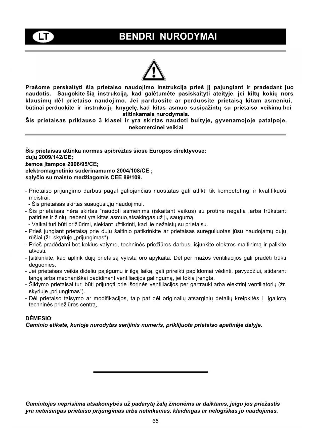 BENDRI NURODYMAI Prašome perskaityti šią prietaiso naudojimo instrukciją prieš jį pajungiant ir pradedant juo naudotis. Saugokite šią instrukciją, kad galėtumėte pasiskaityti ateityje, jei kiltų kokių nors klausimų dėl prietaiso naudojimo. Jei parduosite ar perduosite prietaisą kitam asmeniui, būtinai perduokite ir instrukcijų knygelę, kad kitas asmuo susipažintų su prietaiso veikimu bei atitinkamais nurodymais. Šis prietaisas priklauso 3 klasei ir yra skirtas naudoti buityje, gyvenamojoje patalpoje, nekomercinei veiklai Šis prietaisas attinka normas apibrėžtas šiose Europos direktyvose: dujų 2009/142/CE; žemos įtampos 2006/95/CE; elektromagnetinio suderinamumo 2004/108/CE ; sąlyčio su maisto medžiagomis CEE 89/109. - Prietaiso prijungimo darbus pagal galiojančias nuostatas gali atlikti tik kompetetingi ir kvalifikuoti meistrai. - Šis prietaisas skirtas suaugusiųjų naudojimui. - Šis prietaisas nėra skirtas “naudoti asmenims (įskaitant vaikus) su protine negalia ,arba trūkstant patirties ir žinių, nebent yra kitas asmuo,atsakingas už jų saugumą. - Vaikai turi būti prižiūrimi, siekiant užtikrinti, kad jie nežaistų su prietaisu. - Prieš jungiant prietaisą prie dujų šaltinio patikrinkite ar prietaisas sureguliuotas jūsų naudojamų dujų rūšiai (žr. skyriuje „prijungimas“). - Prieš pradėdami bet kokius valymo, techninės priežiūros darbus, išjunkite elektros maitinimą ir palikite atvėsti. - Įsitikinkite, kad aplink dujų prietaisą vyksta oro apykaita. Dėl per mažos ventiliacijos gali pradėti trūkti deguonies. - Jei prietaisas veikia dideliu pajėgumu ir ilgą laiką, gali prireikti papildomai vėdinti, pavyzdžiui, atidarant langą arba mechaniškai padidinant ventiliacijos galingumą, jei tokia įrengta. - Šildymo prietaisai turi būti prijungti prie išorinės ventiliacijos per gartraukį arba elektrinį ventiliatorių (žr. skyriuje „prijungimas“). - Dėl prietaiso taisymo ar modifikacijos, taip pat dėl originalių atsarginių detalių kreipkitės į įgaliotą techninės priežiūros centrą,. DĖMESIO: Gaminio etiketė, kurioje nurodytas serijinis numeris, priklijuota prietaiso apatinėje dalyje. Gamintojas neprisiima atsakomybės už padarytą žalą žmonėms ar daiktams, jeigu jos priežastis yra neteisingas prietaiso prijungimas arba netinkamas, klaidingas ar nelogiškas jo naudojimas.66 1 Didelis degiklis 3000 W 2 Vidutinis degiklis 1750 W 3 Mažas degiklis 1000 W 4 Trigubos liepsnos degiklis 3800 W 5 Dvigubos liepsnos degiklis 3500 W 8 Degiklio valdymo rankenėlė