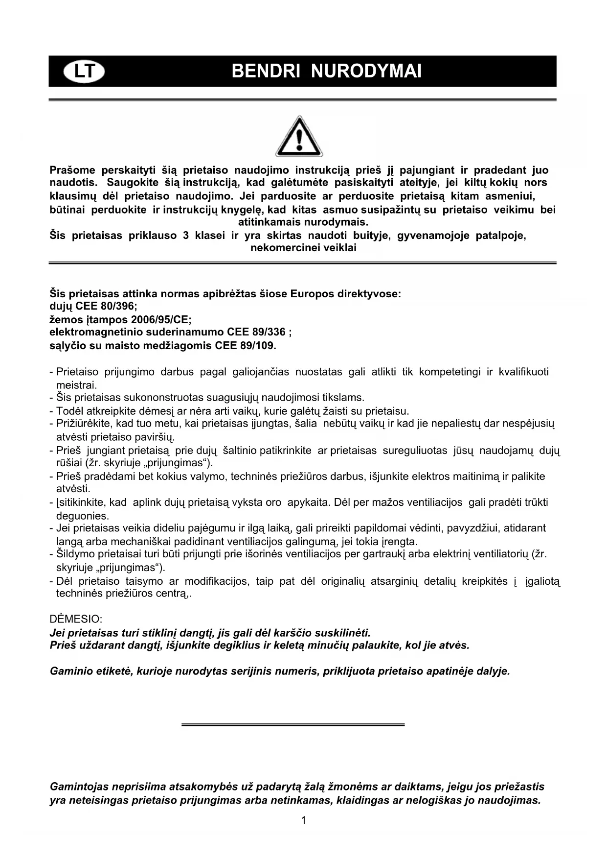 BENDRI NURODYMAI Prašome perskaityti šią prietaiso naudojimo instrukciją prieš jį pajungiant ir pradedant juo naudotis. Saugokite šią instrukciją, kad galėtumėte pasiskaityti ateityje, jei kiltų kokių nors klausimų dėl prietaiso naudojimo. Jei parduosite ar perduosite prietaisą kitam asmeniui, būtinai perduokite ir instrukcijų knygelę, kad kitas asmuo susipažintų su prietaiso veikimu bei atitinkamais nurodymais. Šis prietaisas priklauso 3 klasei ir yra skirtas naudoti buityje, gyvenamojoje patalpoje, nekomercinei veiklai Šis prietaisas attinka normas apibrėžtas šiose Europos direktyvose: dujų CEE 80/396; žemos įtampos 2006/95/CE; elektromagnetinio suderinamumo CEE 89/336 ; sąlyčio su maisto medžiagomis CEE 89/109. Prietaiso prijungimo darbus pagal galiojančias nuostatas gali atlikti tik kompetetingi ir kvalifikuoti meistrai. Šis prietaisas sukononstruotas suagusiųjų naudojimosi tikslams. Todėl atkreipkite dėmesį ar nėra arti vaikų, kurie galėtų žaisti su prietaisu. Prižiūrėkite, kad tuo metu, kai prietaisas įjungtas, šalia nebūtų vaikų ir kad jie nepaliestų dar nespėjusių atvėsti prietaiso paviršių. Prieš jungiant prietaisą prie dujų šaltinio patikrinkite ar prietaisas sureguliuotas jūsų naudojamų dujų rūšiai (žr. skyriuje „prijungimas“). Prieš pradėdami bet kokius valymo, techninės priežiūros darbus, išjunkite elektros maitinimą ir palikite atvėsti. Įsitikinkite, kad aplink dujų prietaisą vyksta oro apykaita. Dėl per mažos ventiliacijos gali pradėti trūkti deguonies. Jei prietaisas veikia dideliu pajėgumu ir ilgą laiką, gali prireikti papildomai vėdinti, pavyzdžiui, atidarant langą arba mechaniškai padidinant ventiliacijos galingumą, jei tokia įrengta. Šildymo prietaisai turi būti prijungti prie išorinės ventiliacijos per gartraukį arba elektrinį ventiliatorių (žr. skyriuje „prijungimas“). Dėl prietaiso taisymo ar modifikacijos, taip pat dėl originalių atsarginių detalių kreipkitės į įgaliotą techninės priežiūros centrą,. DĖMESIO: Jei prietaisas turi stiklinį dangtį, jis gali dėl karščio suskilinėti. Prieš uždarant dangtį, išjunkite degiklius ir keletą minučių palaukite, kol jie atvės. Gaminio etiketė, kurioje nurodytas serijinis numeris, priklijuota prietaiso apatinėje dalyje.