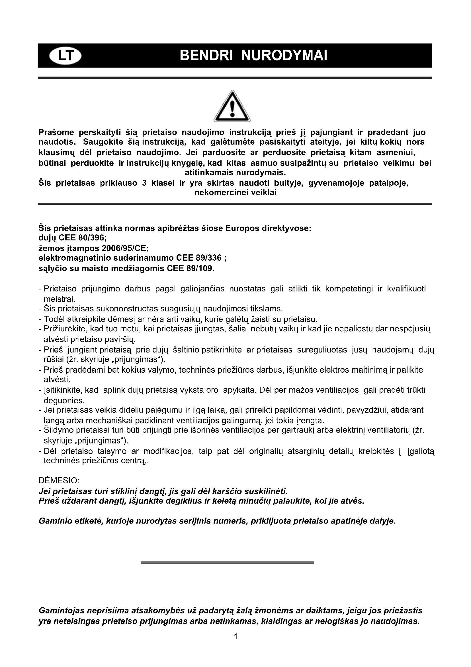 BENDRI NURODYMAI Prašome perskaityti šią prietaiso naudojimo instrukciją prieš jį pajungiant ir pradedant juo naudotis. Saugokite šią instrukciją, kad galėtumėte pasiskaityti ateityje, jei kiltų kokių nors klausimų dėl prietaiso naudojimo. Jei parduosite ar perduosite prietaisą kitam asmeniui, būtinai perduokite ir instrukcijų knygelę, kad kitas asmuo susipažintų su prietaiso veikimu bei atitinkamais nurodymais. Šis prietaisas priklauso 3 klasei ir yra skirtas naudoti buityje, gyvenamojoje patalpoje, nekomercinei veiklai Šis prietaisas attinka normas apibrėžtas šiose Europos direktyvose: dujų CEE 80/396; žemos įtampos 2006/95/CE; elektromagnetinio suderinamumo CEE 89/336 ; sąlyčio su maisto medžiagomis CEE 89/109. Prietaiso prijungimo darbus pagal galiojančias nuostatas gali atlikti tik kompetetingi ir kvalifikuoti meistrai. Šis prietaisas sukononstruotas suagusiųjų naudojimosi tikslams. Todėl atkreipkite dėmesį ar nėra arti vaikų, kurie galėtų žaisti su prietaisu. Prižiūrėkite, kad tuo metu, kai prietaisas įjungtas, šalia nebūtų vaikų ir kad jie nepaliestų dar nespėjusių atvėsti prietaiso paviršių. Prieš jungiant prietaisą prie dujų šaltinio patikrinkite ar prietaisas sureguliuotas jūsų naudojamų dujų rūšiai (žr. skyriuje „prijungimas“). Prieš pradėdami bet kokius valymo, techninės priežiūros darbus, išjunkite elektros maitinimą ir palikite atvėsti. Įsitikinkite, kad aplink dujų prietaisą vyksta oro apykaita. Dėl per mažos ventiliacijos gali pradėti trūkti deguonies. Jei prietaisas veikia dideliu pajėgumu ir ilgą laiką, gali prireikti papildomai vėdinti, pavyzdžiui, atidarant langą arba mechaniškai padidinant ventiliacijos galingumą, jei tokia įrengta. Šildymo prietaisai turi būti prijungti prie išorinės ventiliacijos per gartraukį arba elektrinį ventiliatorių (žr. skyriuje „prijungimas“). Dėl prietaiso taisymo ar modifikacijos, taip pat dėl originalių atsarginių detalių kreipkitės į įgaliotą techninės priežiūros centrą,. DĖMESIO: Jei prietaisas turi stiklinį dangtį, jis gali dėl karščio suskilinėti. Prieš uždarant dangtį, išjunkite degiklius ir keletą minučių palaukite, kol jie atvės. Gaminio etiketė, kurioje nurodytas serijinis numeris, priklijuota prietaiso apatinėje dalyje.