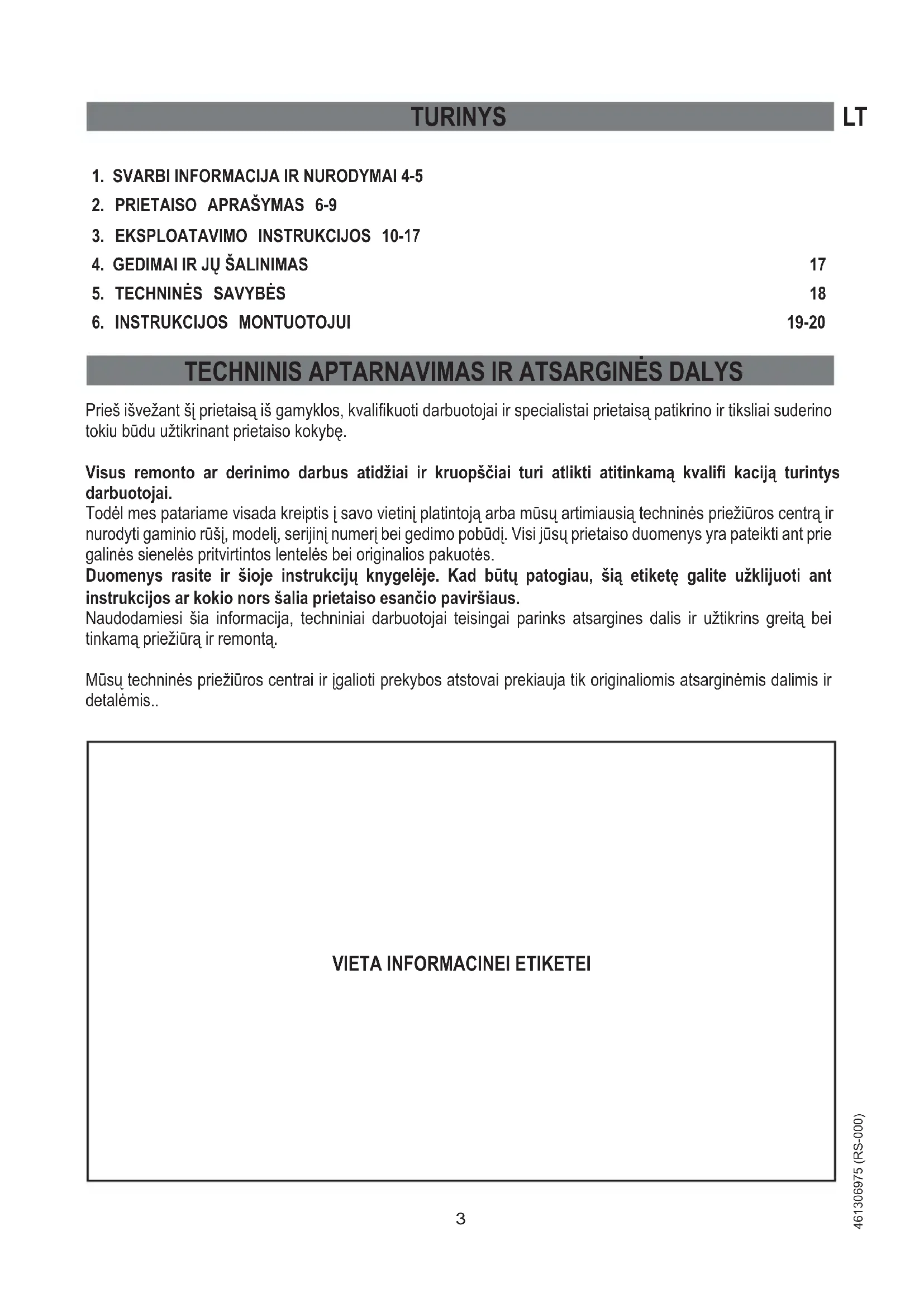 TECHNINĖ INFORMACIJA Visus šiame instrukcijų skyriuje nurodytus montavimo ir techninės priežiūros darbus turi atlikti tik kvalifi kuoti specialistai. Gamintojas neatsako už asmenų sužalojimą ar turto apgadinimą, jei prietaisas netinkamai sumontuojamas, prižiūrimas ar eksploatuojamas.