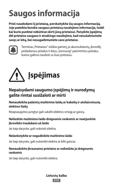 Saugos informacija Prieš naudodami šį prietaisą, perskaitykite šią saugos informaciją. Joje pateikta bendra saugaus prietaisų naudojimo informacija, todėl kai kurie punktai nebūtinai skirti jūsų prietaisui. Paisykite įspėjimų dėl prietaiso saugaus ir atsakingo naudojimo, kad nesužalotumėte savęs ar kitų, bei nesugadintumėte savo prietaiso. Terminas „Prietaisas“ reiškia gaminį, jo akumuliatorių, įkroviklį, pridedamus priedus ir kitus „Samsung“ patvirtintus priedus, kurios galima naudoti su šiuo prietaisu. Įspėjimas Nepaisydami saugumo įspėjimų ir nurodymų galite rimtai susižaloti ar mirti Nenaudokite pažeistų maitinimo laidų ar kabelių ir atsilaisvinusių elektros lizdų Neapsaugotos jungtys gali sukelti elektros smūgį ar gaisrą. Nelieskite maitinimo laido drėgnomis rankomis ar neatjunkite įkroviklio traukdami už laido Jei taip darysite, gali nukrėsti elektra. Nelankstykite ar negadinkite maitinimo laido Jei taip darysite, gali nutrenkti elektra ar kilti gaisras. Nenaudokite įkraunamo prietaiso ar nelieskite jo drėgnomis rankomis Jei taip darysite, gali nutrenkti elektra. Lietuvių kalba