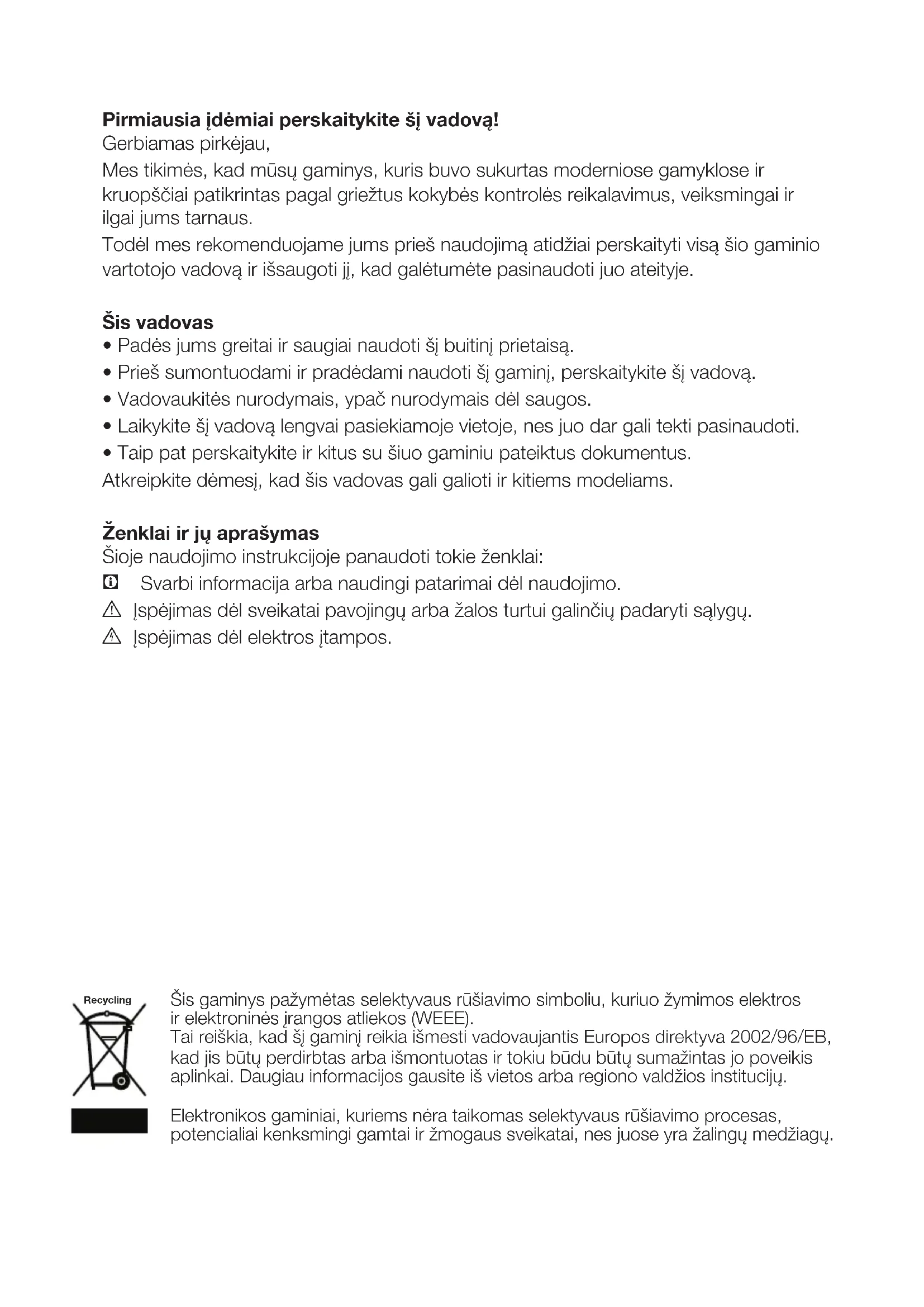 - Laikykite šį vadovą lengvai pasiekiamoje vietoje, nes juo dar gali tekti pasinaudoti.