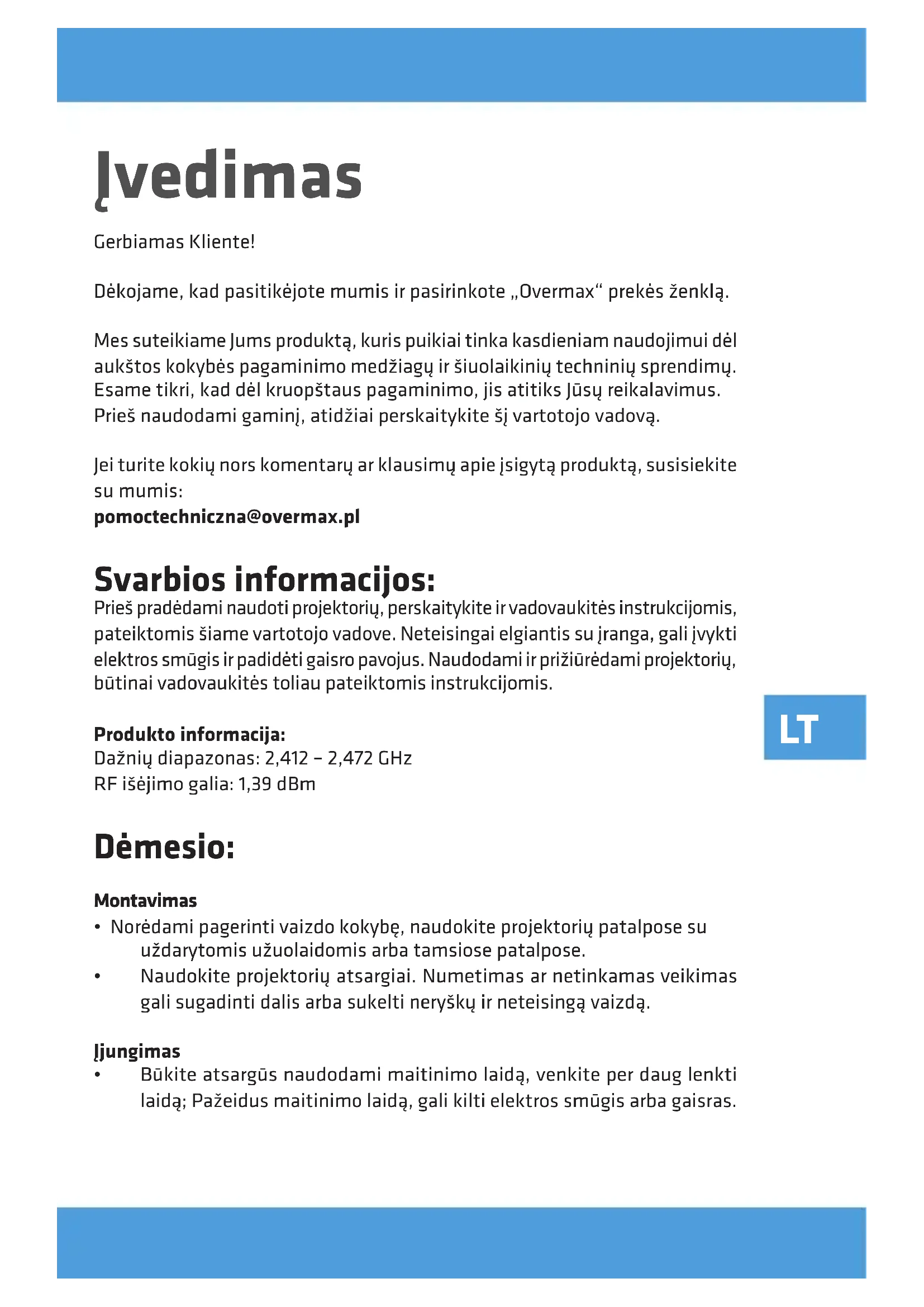 Фотографії служать лише для ілюстрації, фактичний зовнішній вигляд продуку може відрізнятися від представленого на фото.LT Įvedimas Gerbiamas Kliente! Dėkojame, kad pasitikėjote mumis ir pasirinkote „Overmax“ prekės ženklą. Mes suteikiame Jums produktą, kuris puikiai tinka kasdieniam naudojimui dėl aukštos kokybės pagaminimo medžiagų ir šiuolaikinių techninių sprendimų. Esame tikri, kad dėl kruopštaus pagaminimo, jis atitiks Jūsų reikalavimus. Prieš naudodami gaminį, atidžiai perskaitykite šį vartotojo vadovą. Jei turite kokių nors komentarų ar klausimų apie įsigytą produktą, susisiekite su mumis: pomoctechniczna@overmax.pl Svarbios informacijos: Prieš pradėdami naudoti projektorių, perskaitykite ir vadovaukitės instrukcijomis, pateiktomis šiame vartotojo vadove. Neteisingai elgiantis su įranga, gali įvykti elektros smūgis ir padidėti gaisro pavojus. Naudodami ir prižiūrėdami projektorių, būtinai vadovaukitės toliau pateiktomis instrukcijomis. Produkto informacija: Dažnių diapazonas: 2,412 – 2,472 GHz RF išėjimo galia: 1,39 dBm Dėmesio: Montavimas