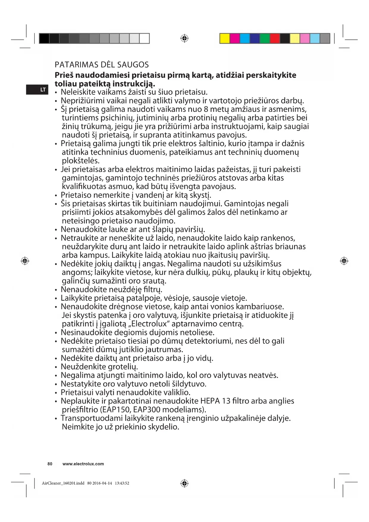 EAP150, EAP300, EAP450Problema Galima priežastis / sprendimasAr galima plauti ltrą? ne, kartu su įrenginiu tiekiami ltrai iškris ir suirs, jei ant jų pateks vandens. (eAp450 modelio ltrus galima plauti) Ar galima ltrą nusiurbti siurbliu? ne, siurbiant dulkės tik pasklis ore. Jei manote, kad ltras pernelyg purvinas, veikiausiai laikas jį pakeisti. (eAp450 modelio plaunamuosius priešltrius galima nusiurbti dulkių siurbliu arba nuvalyti minkštu šepetėliu) Iš įrenginio sklinda kvapas, ir jis vos atsidarė. Įrenginys buvo sandariai supakuotas įvyniotoje gofruoto kartono ir plastiko pakuotėje. Kadangi jame yra ventiliatorius ir per jį eina oras, gali atsirasti kai kurių „naujų“ kvapų. Priklausomai nuo jautrumo, jie turėtų dingti po kelių dienų ar savaitės, priklausomai nuo to, kiek įrenginys naudojamas. Ar jis išvalys didesnį plotą, nei numatyta? CADR vertinimai pateikiami iš kontroliuojamos bandymo aplinkos; jei ta aplinka pasikeičia, tai gali turėti įtakos veikimui. Tačiau jei turite šiek tiek daugiau vietos nei nurodyta CADR vertinime, jis vis tiek padės pagerinti orą, bet tai gali užtrukti šiek tiek ilgiau.Kur reikia laikyti įrenginį? Pasirūpinkite, kad įrenginys vėdintųsi iš šonų ir iš priekio. Jeigu yra durys arba siauras koridorius, tai gali sumažinti oro srautą iki oro ltro ir oras ilgainiui cirkuliuos šalia įrenginio.Lemputė „Air QuAlitY“ (Oro kokybė) yra oranžinė arba raudona, bet oras atrodo švarus.Išvalykite jutiklį dulkių siurbliu, nes jis galėjo užsiblokuoti arba užsikimšti.Kartais suspausto oro skardinė gali atkimšti dulkes jutiklyje. Dar yra šiek tiek dulkių ore arba ant baldų Įrenginys surinks daugumą dulkių ir dalelių, tačiau atidarius duris, langus, įjungus centrinę ŠVOK sistemą ir kt. gali būti šiek tiek dulkių, kurias galite pamatyti. Filtrų niekas nelaiko reikiamoje padėtyje Filtrai yra skirti tam, kad būtų įrenginio viduje. Kai įrenginys įjungiamas, traukiamo per aparatą oro srovė užtikrins gerą ltrų sandarumą. Girdimos ventiliatoriaus variklio apsukos. Tai normalu, ypač naktį, kai visi aplinkos garsai tylūs, galima girdėti pakartotinai paleidžiamą variklį.Įrenginys efektyviai nebepašalina kvapų arba atrodo, kad jis skleidžia kvapą.patikrinkite, ar neužsiblokavo ir neužsikimšo oro kokybės jutiklis.perkelkite įrenginį arčiau prie erzinančių kvapų.Pakeiskite ltrus, nes galbūt jie nebegali sugerti teršalų. Gali tekti dažniau pakeisti ltrus.Indikatorius „CheCk lter“ lieka įjungtas pakeitus HEPA ltrą.Paspauskite mygtuką „Reset lter“ atsargiai įkišę popieriaus sąvaržėlę į mygtuko „Reset lter“ angą. Palaikykite 3–5 sekundes, kol pasigirs pyptelėjimas, reiškiantis, kad įrenginys buvo nustatytas iš naujo. www.electrolux.com