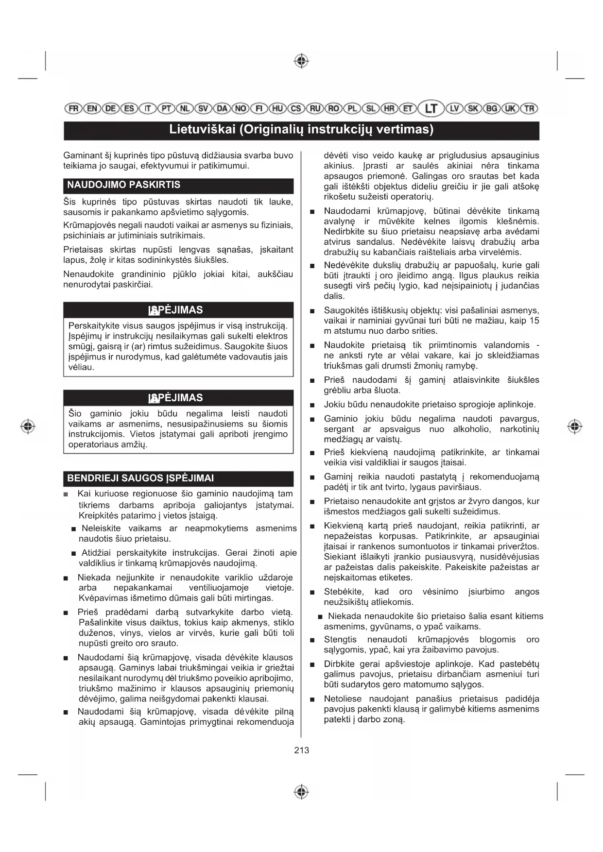 MÄRKUSED: ■ Hooldust tuleks teostada sagedamini kui seadet kasutatakse tolmuses piirkonnas. ■ Kui toode on ületanud tabelis toodud maksimaalsed näitajad, peab hooldus toimuma ikkagi vastavalt siin näidatud intervallidele (kas perioodide või tundide järgi).213 Lietuviškai (Originalių instrukcijų vertimas) Gaminant šį kuprinės tipo pūstuvą didžiausia svarba buvo teikiama jo saugai, efektyvumui ir patikimumui. NAUDOJIMO PASKIRTIS Šis kuprinės tipo pūstuvas skirtas naudoti tik lauke, sausomis ir pakankamo apšvietimo sąlygomis. Krūmapjovės negali naudoti vaikai ar asmenys su fi ziniais, psichiniais ar jutiminiais sutrikimais. Prietaisas skirtas nupūsti lengvas sąnašas, įskaitant lapus, žolę ir kitas sodininkystės šiukšles. Nenaudokite grandininio pjūklo jokiai kitai, aukščiau nenurodytai paskirčiai. ĮSPĖJIMAS Perskaitykite visus saugos įspėjimus ir visą instrukciją. Įspėjimų ir instrukcijų nesilaikymas gali sukelti elektros smūgį, gaisrą ir (ar) rimtus sužeidimus. Saugokite šiuos įspėjimus ir nurodymus, kad galėtumėte vadovautis jais vėliau. ĮSPĖJIMAS Šio gaminio jokiu būdu negalima leisti naudoti vaikams ar asmenims, nesusipažinusiems su šiomis instrukcijomis. Vietos įstatymai gali apriboti įrengimo operatoriaus amžių.