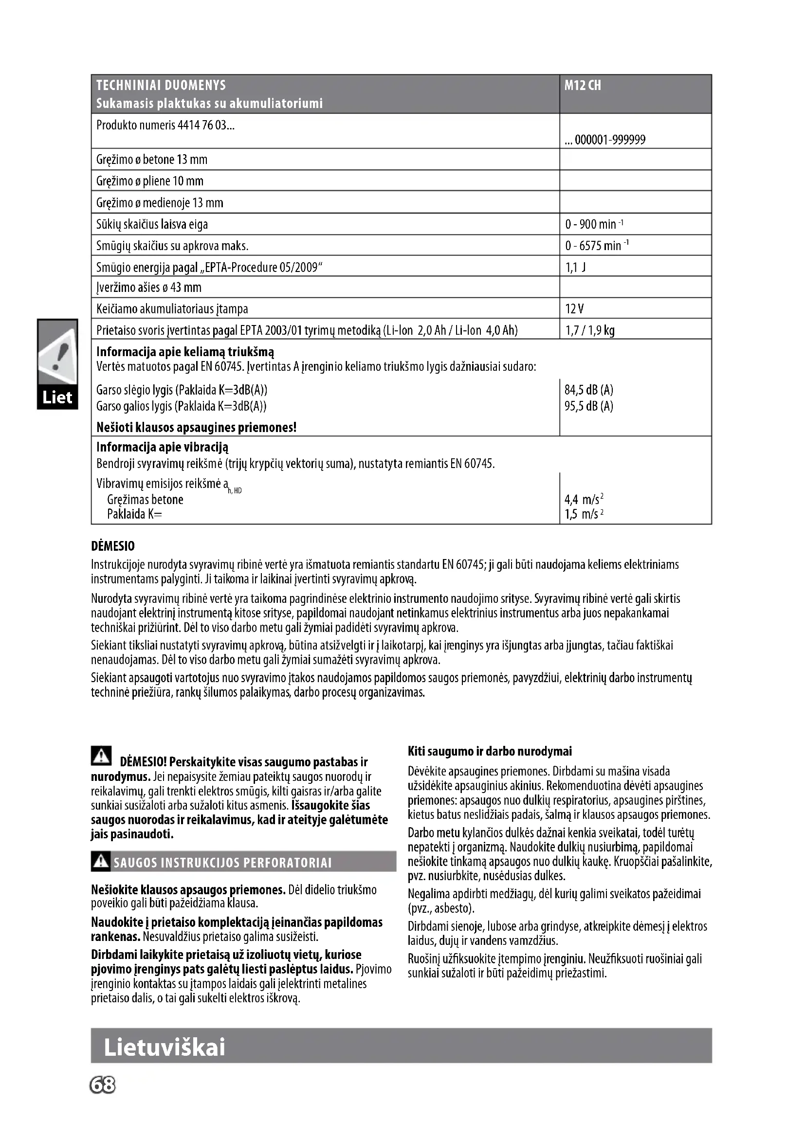 Nešiokite klausos apsaugos priemones. Dėl didelio triukšmo poveikio gali būti pažeidžiama klausa. Naudokite į prietaiso komplektaciją įeinančias papildomas rankenas. Nesuvaldžius prietaiso galima susižeisti. Dirbdami laikykite prietaisą už izoliuotų vietų, kuriose pjovimo įrenginys pats galėtų liesti paslėptus laidus. Pjovimo įrenginio kontaktas su įtampos laidais gali įelektrinti metalines prietaiso dalis, o tai gali sukelti elektros iškrovą. Kiti saugumo ir darbo nurodymai Dėvėkite apsaugines priemones. Dirbdami su mašina visada užsidėkite apsauginius akinius. Rekomenduotina dėvėti apsaugines priemones: apsaugos nuo dulkių respiratorius, apsaugines pirštines, kietus batus neslidžiais padais, šalmą ir klausos apsaugos priemones. Darbo metu kylančios dulkės dažnai kenkia sveikatai, todėl turėtų nepatekti į organizmą. Naudokite dulkių nusiurbimą, papildomai nešiokite tinkamą apsaugos nuo dulkių kaukę. Kruopščiai pašalinkite, pvz. nusiurbkite, nusėdusias dulkes. Negalima apdirbti medžiagų, dėl kurių galimi sveikatos pažeidimai (pvz., asbesto). Dirbdami sienoje, lubose arba grindyse, atkreipkite dėmesį į elektros laidus, dujų ir vandens vamzdžius. Ruošinį užksuokite įtempimo įrenginiu. Neužksuoti ruošiniai gali sunkiai sužaloti ir būti pažeidimų priežastimi. TECHNINIAI DUOMENYS Sukamasis plaktukas su akumuliatoriumi M12 CH Produkto numeris 4414 76 03... ... 000001-999999 Gręžimo ø betone 13 mm Gręžimo ø pliene 10 mm Gręžimo ø medienoje 13 mm Sūkių skaičius laisva eiga 0 - 900 min