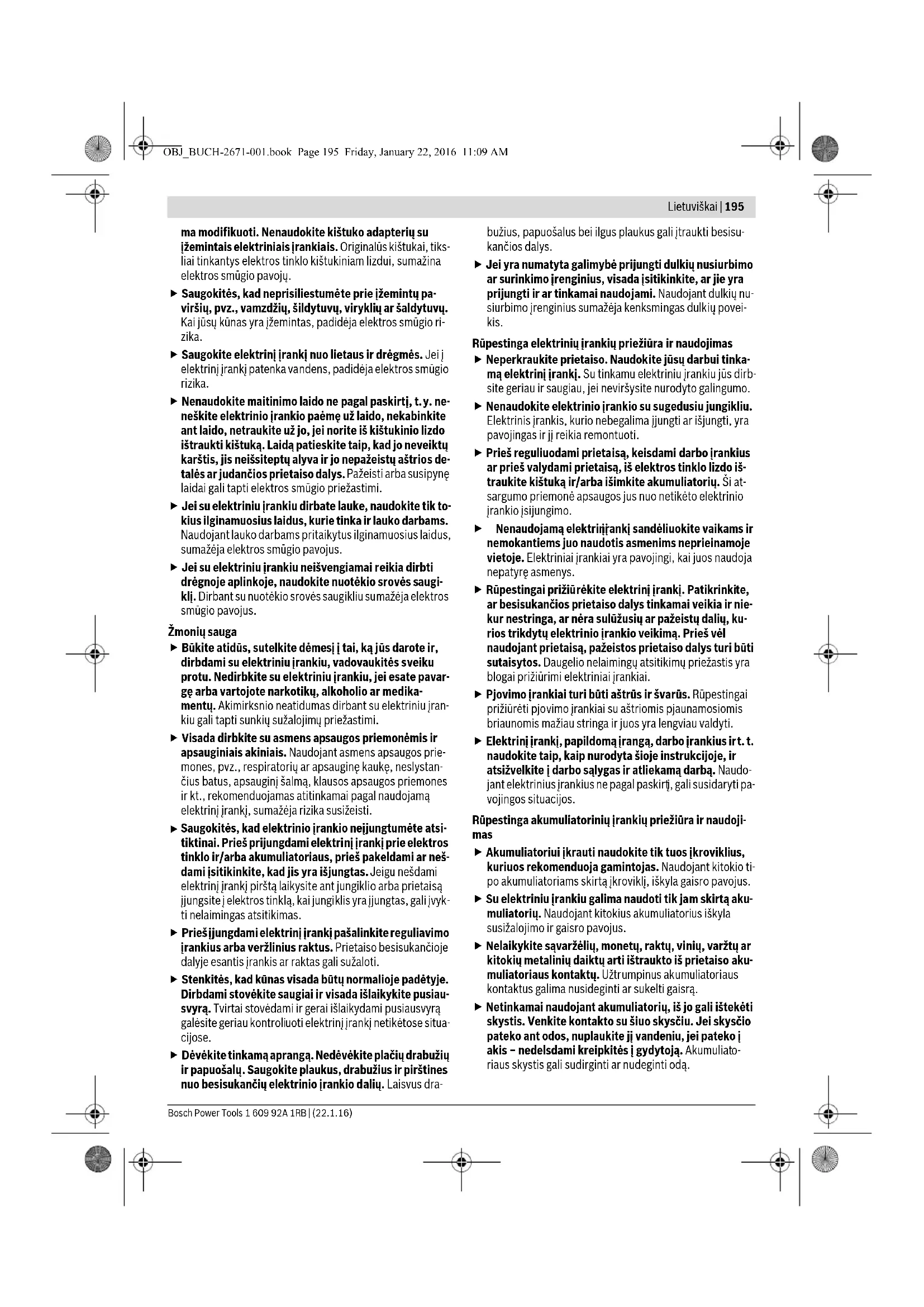 dzam ievērot sadaļā „Transportēša- na“ (lappuse 194) sniegtos norādīju- mus. Tiesības uz izmaiņām tiek saglabātas. Lietuviškai Saugos nuorodos Bendrosios darbo su elektriniais įrankiais saugos nuorodos Perskaitykite visas šias saugos nuoro- das ir reikalavimus. Jei nepaisysite že- miau pateiktų saugos nuorodų ir reikalavimų, gali trenkti elek- tros smūgis, kilti gaisras ir galite sunkiai susižaloti arba suža- loti kitus asmenis. Išsaugokite šias saugos nuorodas ir reikalavimus, kad ir ateityje galėtumėte jais pasinaudoti. Toliau pateiktame tekste vartojama sąvoka „Elektrinis įrankis“ apibūdina įrankius, maitinamus iš elektros tinklo (su maitini- mo laidu), ir akumuliatorinius įrankius (be maitinimo laido). Darbo vietos saugumas Darbo vieta turi būti švari ir gerai apšviesta. Netvarkin- ga arba blogai apšviesta darbo vieta gali tapti nelaimingų atsitikimų priežastimi. Nedirbkite su elektriniu įrankiu aplinkoje, kurioje yra degių skysčių, dujų ar dulkių. Elektriniai įrankiai gali ki- birkščiuoti, o nuo kibirkščių dulkės arba susikaupę garai gali užsidegti. Dirbdami su elektriniu įrankiu neleiskite šalia būti žiū- rovams, vaikams ir lankytojams. Nukreipę dėmesį į kitus asmenis galite nebesuvaldyti prietaiso. Elektrosauga Elektrinio įrankio maitinimo laido kištukas turi atitikti tinklo kištukinio lizdo tipą. Kištuko jokiu būdu negali- OBJ_BUCH-2671-001.book Page 194 Friday, January 22, 2016 11:09 AMLietuviškai | 195 Bosch Power Tools 1 609 92A 1RB | (22.1.16) ma modifikuoti. Nenaudokite kištuko adapterių su įžemintais elektriniais įrankiais. Originalūs kištukai, tiks- liai tinkantys elektros tinklo kištukiniam lizdui, sumažina elektros smūgio pavojų. Saugokitės, kad neprisiliestumėte prie įžemintų pa- viršių, pvz., vamzdžių, šildytuvų, viryklių ar šaldytuvų. Kai jūsų kūnas yra įžemintas, padidėja elektros smūgio ri- zika. Saugokite elektrinį įrankį nuo lietaus ir drėgmės. Jei į elektrinį įrankį patenka vandens, padidėja elektros smūgio rizika. Nenaudokite maitinimo laido ne pagal paskirtį, t.y. ne- neškite elektrinio įrankio paėmę už laido, nekabinkite ant laido, netraukite už jo, jei norite iš kištukinio lizdo ištraukti kištuką. Laidą patieskite taip, kad jo neveiktų karštis, jis neišsiteptų alyva ir jo nepažeistų aštrios de- talės ar judančios prietaiso dalys. Pažeisti arba susipynę laidai gali tapti elektros smūgio priežastimi. Jei su elektriniu įrankiu dirbate lauke, naudokite tik to- kius ilginamuosius laidus, kurie tinka ir lauko darbams. Naudojant lauko darbams pritaikytus ilginamuosius laidus, sumažėja elektros smūgio pavojus. Jei su elektriniu įrankiu neišvengiamai reikia dirbti drėgnoje aplinkoje, naudokite nuotėkio srovės saugi- klį. Dirbant su nuotėkio srovės saugikliu sumažėja elektros smūgio pavojus. Žmonių sauga Būkite atidūs, sutelkite dėmesį į tai, ką jūs darote ir, dirbdami su elektriniu įrankiu, vadovaukitės sveiku protu. Nedirbkite su elektriniu įrankiu, jei esate pavar- gę arba vartojote narkotikų, alkoholio ar medika- mentų. Akimirksnio neatidumas dirbant su elektriniu įran- kiu gali tapti sunkių sužalojimų priežastimi. Visada dirbkite su asmens apsaugos priemonėmis ir apsauginiais akiniais. Naudojant asmens apsaugos prie- mones, pvz., respiratorių ar apsauginę kaukę, neslystan- čius batus, apsauginį šalmą, klausos apsaugos priemones ir kt., rekomenduojamas atitinkamai pagal naudojamą elektrinį įrankį, sumažėja rizika susižeisti.