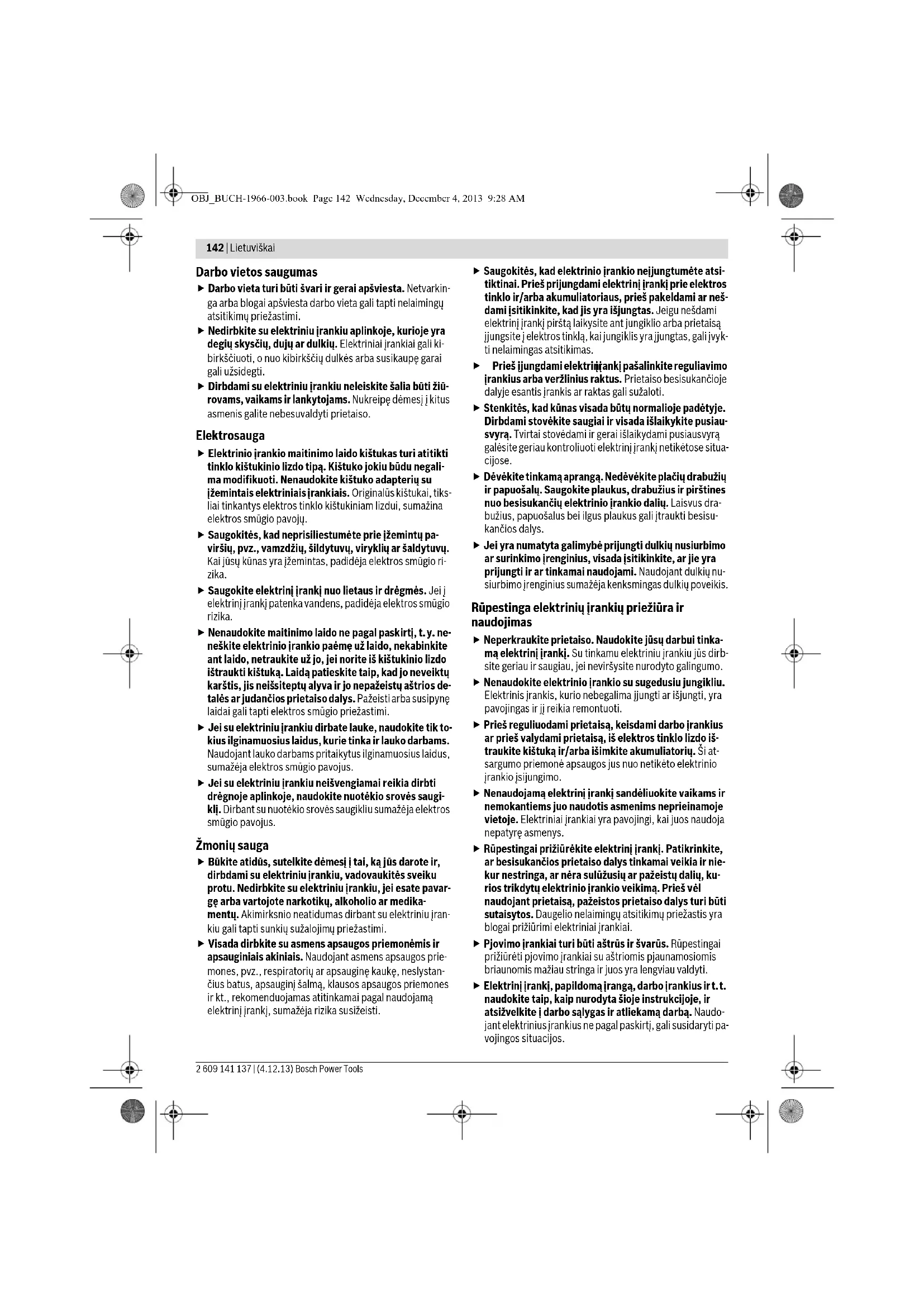 Piederumu izvēle – 163 Darbība un tās mērķis Attēls Lappuse OBJ_BUCH-1966-003.book Page 141 Wednesday, December 4, 2013 9:28 AM142 | Lietuviškai 2 609 141 137 | (4.12.13) Bosch Power Tools Darbo vietos saugumas Darbo vieta turi būti švari ir gerai apšviesta. Netvarkin- ga arba blogai apšviesta darbo vieta gali tapti nelaimingų atsitikimų priežastimi. Nedirbkite su elektriniu įrankiu aplinkoje, kurioje yra degių skysčių, dujų ar dulkių. Elektriniai įrankiai gali ki- birkščiuoti, o nuo kibirkščių dulkės arba susikaupę garai gali užsidegti. Dirbdami su elektriniu įrankiu neleiskite šalia būti žiū- rovams, vaikams ir lankytojams. Nukreipę dėmesį į kitus asmenis galite nebesuvaldyti prietaiso. Elektrosauga Elektrinio įrankio maitinimo laido kištukas turi atitikti tinklo kištukinio lizdo tipą. Kištuko jokiu būdu negali- ma modifikuoti. Nenaudokite kištuko adapterių su įžemintais elektriniais įrankiais. Originalūs kištukai, tiks- liai tinkantys elektros tinklo kištukiniam lizdui, sumažina elektros smūgio pavojų. Saugokitės, kad neprisiliestumėte prie įžemintų pa- viršių, pvz., vamzdžių, šildytuvų, viryklių ar šaldytuvų. Kai jūsų kūnas yra įžemintas, padidėja elektros smūgio ri- zika. Saugokite elektrinį įrankį nuo lietaus ir drėgmės. Jei į elektrinį įrankį patenka vandens, padidėja elektros smūgio rizika. Nenaudokite maitinimo laido ne pagal paskirtį, t.y. ne- neškite elektrinio įrankio paėmę už laido, nekabinkite ant laido, netraukite už jo, jei norite iš kištukinio lizdo ištraukti kištuką. Laidą patieskite taip, kad jo neveiktų karštis, jis neišsiteptų alyva ir jo nepažeistų aštrios de- talės ar judančios prietaiso dalys. Pažeisti arba susipynę laidai gali tapti elektros smūgio priežastimi. Jei su elektriniu įrankiu dirbate lauke, naudokite tik to- kius ilginamuosius laidus, kurie tinka ir lauko darbams. Naudojant lauko darbams pritaikytus ilginamuosius laidus, sumažėja elektros smūgio pavojus. Jei su elektriniu įrankiu neišvengiamai reikia dirbti drėgnoje aplinkoje, naudokite nuotėkio srovės saugi- klį. Dirbant su nuotėkio srovės saugikliu sumažėja elektros smūgio pavojus. Žmonių sauga Būkite atidūs, sutelkite dėmesį į tai, ką jūs darote ir, dirbdami su elektriniu įrankiu, vadovaukitės sveiku protu. Nedirbkite su elektriniu įrankiu, jei esate pavar- gę arba vartojote narkotikų, alkoholio ar medika- mentų. Akimirksnio neatidumas dirbant su elektriniu įran- kiu gali tapti sunkių sužalojimų priežastimi. Visada dirbkite su asmens apsaugos priemonėmis ir apsauginiais akiniais. Naudojant asmens apsaugos prie- mones, pvz., respiratorių ar apsauginę kaukę, neslystan- čius batus, apsauginį šalmą, klausos apsaugos priemones ir kt., rekomenduojamas atitinkamai pagal naudojamą elektrinį įrankį, sumažėja rizika susižeisti. Saugokitės, kad elektrinio įrankio neįjungtumėte atsi- tiktinai. Prieš prijungdami elektrinį įrankį prie elektros tinklo ir/arba akumuliatoriaus, prieš pakeldami ar neš- dami įsitikinkite, kad jis yra išjungtas. Jeigu nešdami elektrinį įrankį pirštą laikysite ant jungiklio arba prietaisą įjungsite į elektros tinklą, kai jungiklis yra įjungtas, gali įvyk- ti nelaimingas atsitikimas. Prieš įjungdami elektrinį įrankį pašalinkite reguliavimo įrankius arba veržlinius raktus. Prietaiso besisukančioje dalyje esantis įrankis ar raktas gali sužaloti. Stenkitės, kad kūnas visada būtų normalioje padėtyje. Dirbdami stovėkite saugiai ir visada išlaikykite pusiau- svyrą. Tvirtai stovėdami ir gerai išlaikydami pusiausvyrą galėsite geriau kontroliuoti elektrinį įrankį netikėtose situa- cijose. Dėvėkite tinkamą aprangą. Nedėvėkite plačių drabužių ir papuošalų. Saugokite plaukus, drabužius ir pirštines nuo besisukančių elektrinio įrankio dalių. Laisvus dra- bužius, papuošalus bei ilgus plaukus gali įtraukti besisu- kančios dalys. Jei yra numatyta galimybė prijungti dulkių nusiurbimo ar surinkimo įrenginius, visada įsitikinkite, ar jie yra prijungti ir ar tinkamai naudojami. Naudojant dulkių nu- siurbimo įrenginius sumažėja kenksmingas dulkių poveikis. Rūpestinga elektrinių įrankių priežiūra ir naudojimas Neperkraukite prietaiso. Naudokite jūsų darbui tinka- mą elektrinį įrankį. Su tinkamu elektriniu įrankiu jūs dirb- site geriau ir saugiau, jei neviršysite nurodyto galingumo. Nenaudokite elektrinio įrankio su sugedusiu jungikliu. Elektrinis įrankis, kurio nebegalima įjungti ar išjungti, yra pavojingas ir jį reikia remontuoti. Prieš reguliuodami prietaisą, keisdami darbo įrankius ar prieš valydami prietaisą, iš elektros tinklo lizdo iš- traukite kištuką ir/arba išimkite akumuliatorių. Ši at- sargumo priemonė apsaugos jus nuo netikėto elektrinio įrankio įsijungimo. Nenaudojamą elektrinį įrankį sandėliuokite vaikams ir nemokantiems juo naudotis asmenims neprieinamoje vietoje. Elektriniai įrankiai yra pavojingi, kai juos naudoja nepatyrę asmenys. Rūpestingai prižiūrėkite elektrinį įrankį. Patikrinkite, ar besisukančios prietaiso dalys tinkamai veikia ir nie- kur nestringa, ar nėra sulūžusių ar pažeistų dalių, ku- rios trikdytų elektrinio įrankio veikimą. Prieš vėl naudojant prietaisą, pažeistos prietaiso dalys turi būti sutaisytos. Daugelio nelaimingų atsitikimų priežastis yra blogai prižiūrimi elektriniai įrankiai. Pjovimo įrankiai turi būti aštrūs ir švarūs. Rūpestingai prižiūrėti pjovimo įrankiai su aštriomis pjaunamosiomis briaunomis mažiau stringa ir juos yra lengviau valdyti. Elektrinį įrankį, papildomą įrangą, darbo įrankius ir t.t. naudokite taip, kaip nurodyta šioje instrukcijoje, ir atsižvelkite į darbo sąlygas ir atliekamą darbą. Naudo- jant elektrinius įrankius ne pagal paskirtį, gali susidaryti pa- vojingos situacijos. OBJ_BUCH-1966-003.book Page 142 Wed