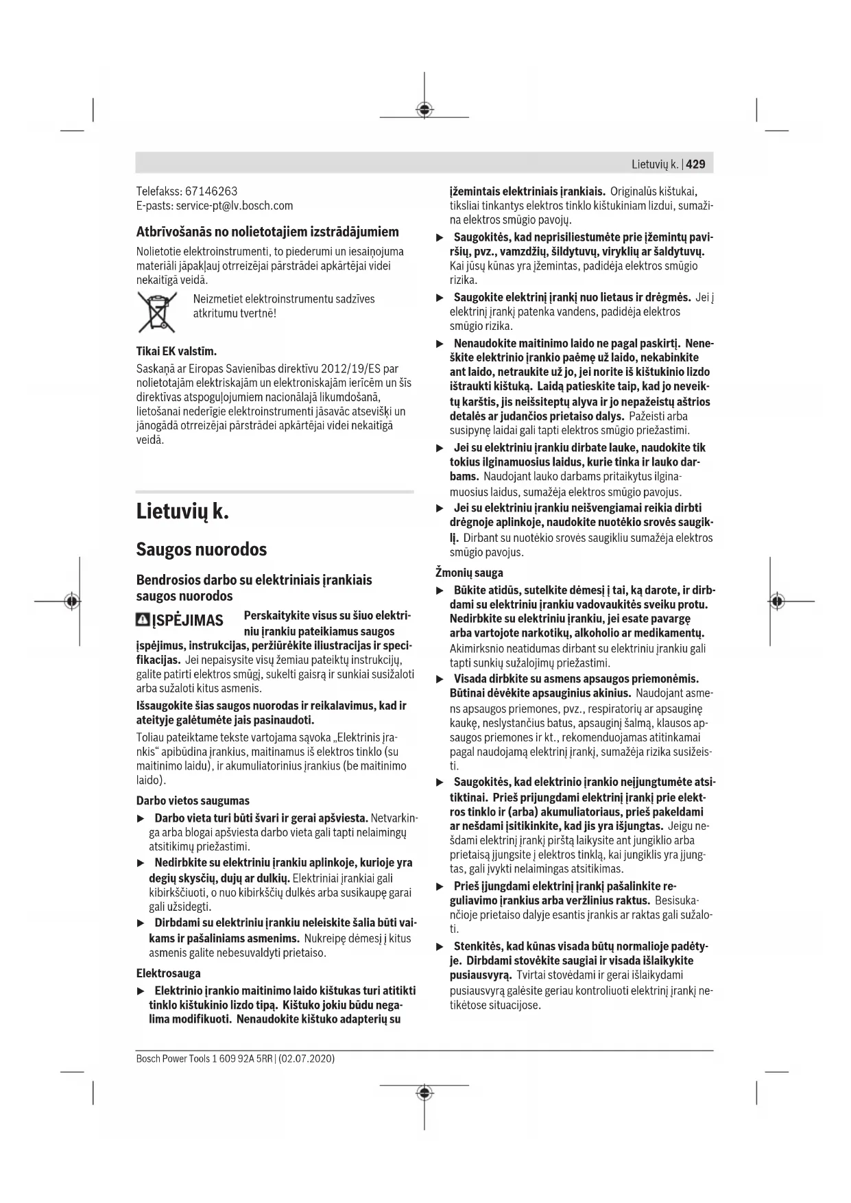 0 601 9C3 100 Pjūklo diskai medienai ir plokštėms, klijuotiems sky- dams ir lentjuostėms Pjūklo diskas 305 x 30 mm, 60 dantų 2 608 641 768 Pjūklo diskai plastikui ir spalvotiesiems metalams Pjūklo diskas 305 x 30 mm, 96 dantų 2 608 642 099 Pjūklo diskas 305 x 30 mm, 96 dantų 2 608 640 453 Pjūklo diskai visų rūšių grindų laminatams Pjūklo diskas 305 x 30 mm, 96 dantų 2 608 642 137 Klientų aptarnavimo skyrius ir konsultavimo tarnyba Klientų aptarnavimo skyriuje gausite atsakymus į klausimus, susijusius su jūsų gaminio remontu, technine priežiūra bei at- sarginėmis dalimis. Detalius brėžinius ir informacijos apie at- sargines dalis rasite interneto puslapyje: www.bosch- pt.com Bosch konsultavimo tarnybos specialistai mielai pakonsul- tuos Jus apie gaminius ir jų papildomą įrangą. Ieškant informacijos ir užsakant atsargines dalis prašome bū- tinai nurodyti dešimtženklį gaminio numerį, esantį firminėje lentelėje. Lietuva Bosch įrankių servisas Informacijos tarnyba: (037) 713350 ļrankių remontas: (037) 713352 Faksas: (037) 713354 El. paštas: service-pt@lv.bosch.com Šalinimas Elektrinis įrankis, papildoma įranga ir pakuotė yra pagaminti iš medžiagų, tinkančių antriniam perdirbimui, ir vėliau priva- lo būti atitinkamai perdirbti. Nemeskite elektrinių įrankių į buitinių atliekų konteinerius! Tik ES šalims: Pagal Europos direktyvą 2012/19/ES dėl elektros ir elekt- roninės įrangos atliekų ir šios direktyvos perkėlimo į naciona- linę teisę aktus, naudoti nebetinkami elektriniai įrankiai turi būti surenkami atskirai ir perdirbami aplinkai nekenksmingu būdu.