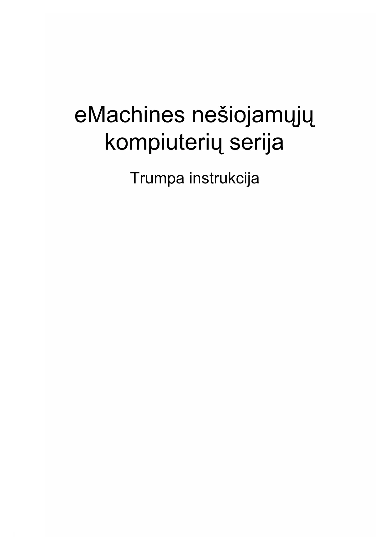 4eMachines nešiojamųjų kompiuterių serija Trumpa instrukcijaModelio numeris: _______________________________ Serijos numeris: ________________________________ Pirkimo data: __________________________________ Pirkimo vieta: __________________________________ © 2010 Visos teisės saugomos. eMachines nešiojamųjų kompiuterių serijos trumpa instrukcija Pirmasis leidimas: 07/20103 Dalykai, kuriuos reikia atlikti pirmiausia Leiskite padėkoti, kad pasirinkote „eMachines“ nešiojamąjDž kompiuterDž – tikimės Jūsų nenuvilti ir užtikrinti visus nešiojamojo kompiuterio teikiamus privalumus. Instrukcijos Jums Tam, kad palengvintume Jums naudojimąsi „eMachines“ kompiuteriu, parengėme kelias instrukcijas: Pirmoji yra sąrankos plakatas - ši informacija padės pirmosiomis kompiuterio naudojimo minutėmis. „eMachines“ bendrojoje naudojimo instrukcijoje pateikiama naudinga informacija apie visų „eMachines“ gaminių grupės modelių kompiuterius. Jis apima bendruosius klausimus, kaip, pvz. sistemos atstatymas, klaviatūros, audio sistemos naudojimas ir t.t. Prašome atkreipti dėmesDž Dž tai, jog dėl savo pobūdžio „eMachines“ bendroji naudojimo instrukcija, kuri bus minima toliau, kartais bus aptariamos funkcijos ar ypatybės, būdingos tik tam tikriems modeliams ir nebūtinai tam modeliui, kurDž jūs Džsigijote. Tokiais atvejais atitinkamose teksto vietose yra prierašais „tik tam tikruose modeliuose“. Šioje Trumpoje instrukcijoje pateikiama informacija apie pagrindines Jūsų Džsigyto kompiuterio savybes ir funkcijas. Norėdami sužinoti daugiau apie tai, kaip jūsų kompiuteris gali padidinti jūsų produktyvumą, skaitykite „eMachines“ bendrąją naudojimo instrukciją, kurioje išsamiai aprašoma tokia informacija, kaip sistemos priemonės, duomenų atstatymas, kompiuterio galimybi ų praplėtimas ir gedimų diagnostika. Be to, šioje instrukcijoje yra ir garantinė informaciją, bendrieji reikalavimai ir su sauga susiję Džspėjimai. Ši instrukcija yra „Portable Document Format (PDF)“ formate ir ji jau bus kompiuteryje. Jei norite peržiūrėti šDž gidą: 1 Spauskite Start (pradėti) > All Programs (visos programos) > eMachines Documentation. 2 Spauskite „eMachines“ bendroji naudojimosi instrukcija. Pastaba: Failo peržiūrai reikės „Adobe Reader“. Jei kompiuteryje nėra „Adobe Reader“, paspaudus ant „eMachines“ bendroji naudojimosi instrukcija bus pirmiausiai paleistas „Adobe Reader“ Dždiegimas. Vadovaukitės ekrane esančiomis instrukcijomis Dždiegimo užbaigimui. Instrukcijų dėl „Adobe Reader“ naudojimosi ieškokite „Help and Support“ (Žinynas ir pagalba) meniu.4 Lietuviškai Ekskursija po jūsų eMachines nešiojamąjDž kompiuterDž Atlikus kompiuterio sąranką kaip parodyta sąrankos plakate, leiskite jus supažindinti su jūsų naujuoju eMachines nešiojamuoju kompiuteriu. Vaizdas iš viršaus